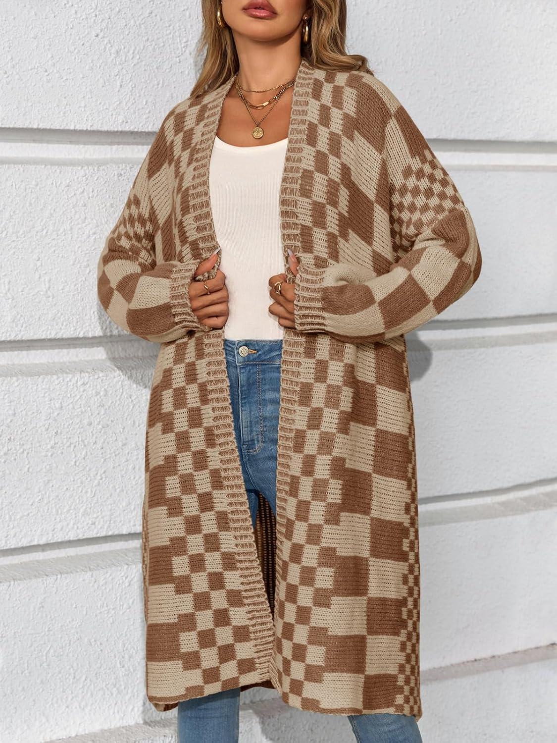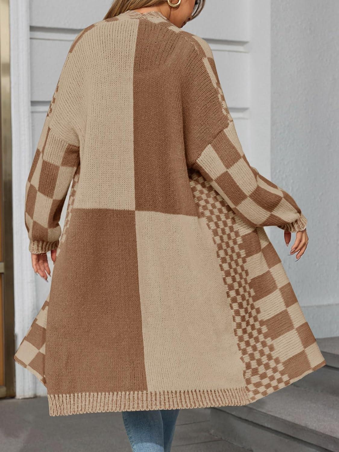 Saodimallsu Womens Checkered Long Cardigans Chunky Oversized Open Front Batwing Sleeve Color Block Knit Sweater Coats(Dark Khaki)
