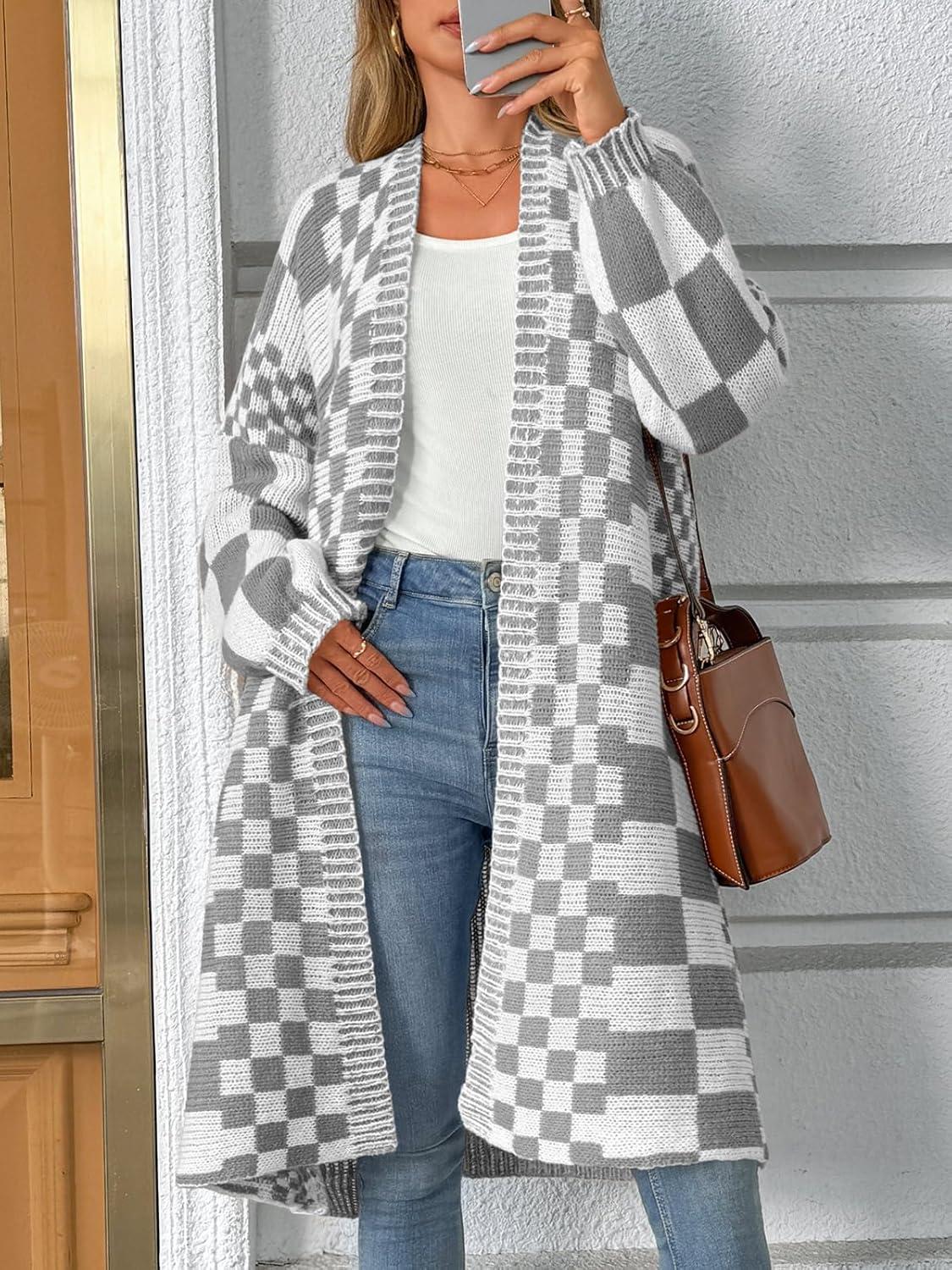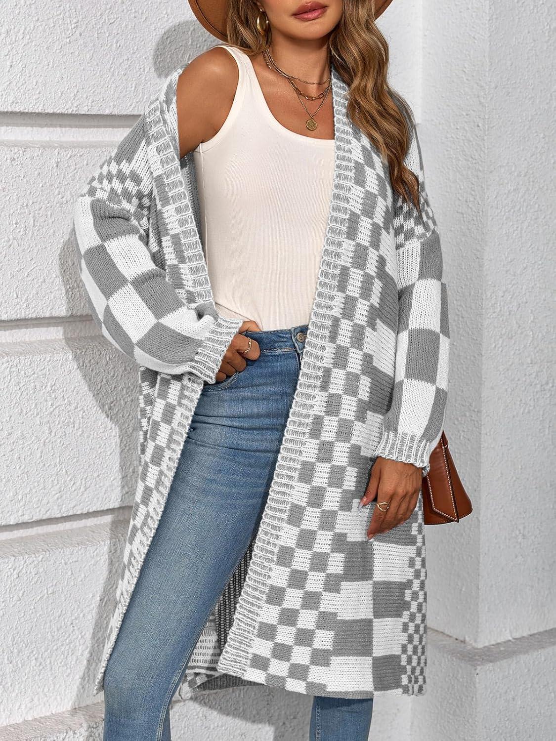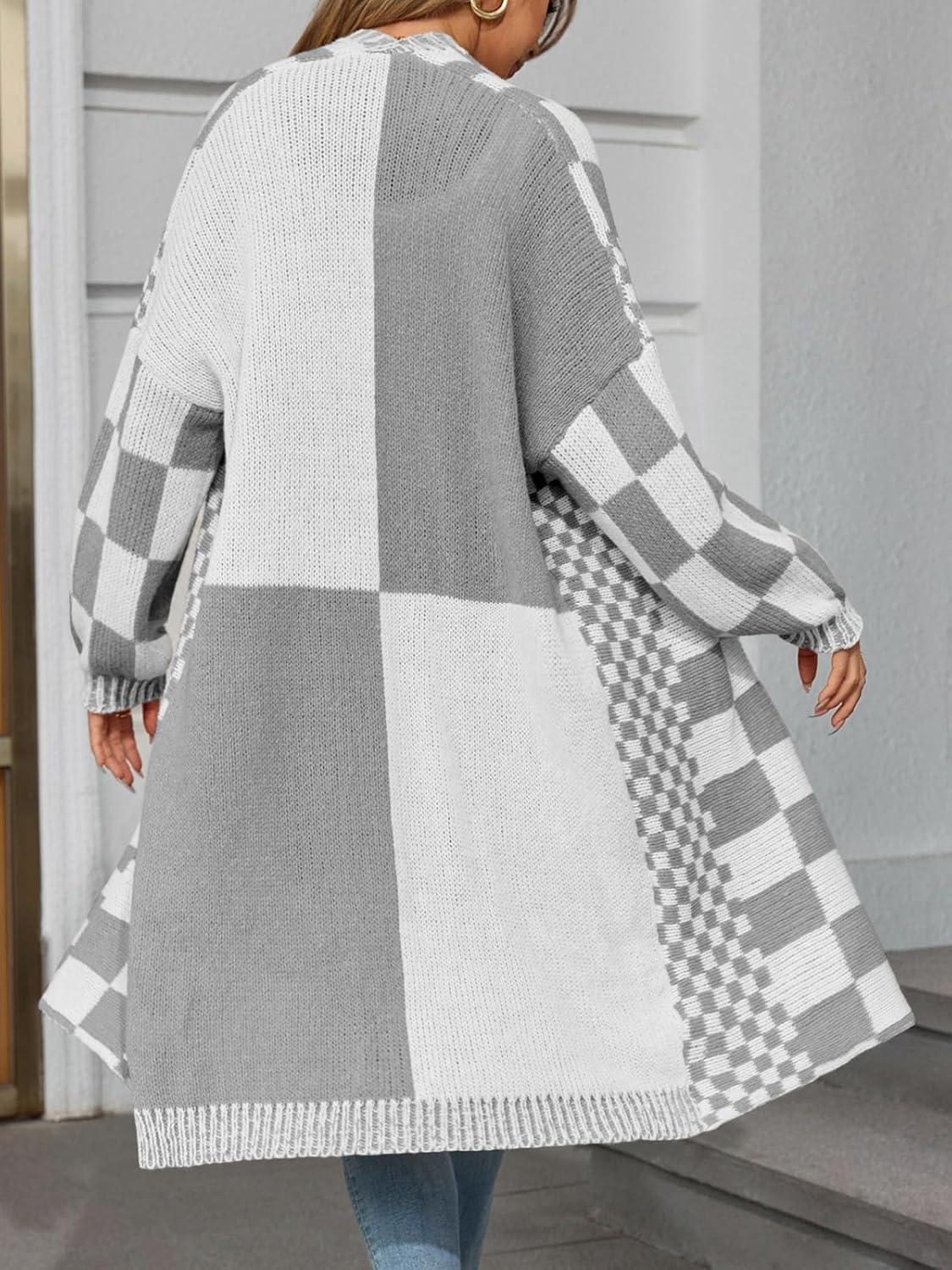 Saodimallsu Womens Checkered Long Cardigans Chunky Oversized Open Front Batwing Sleeve Color Block Knit Sweater Coats(Grey)