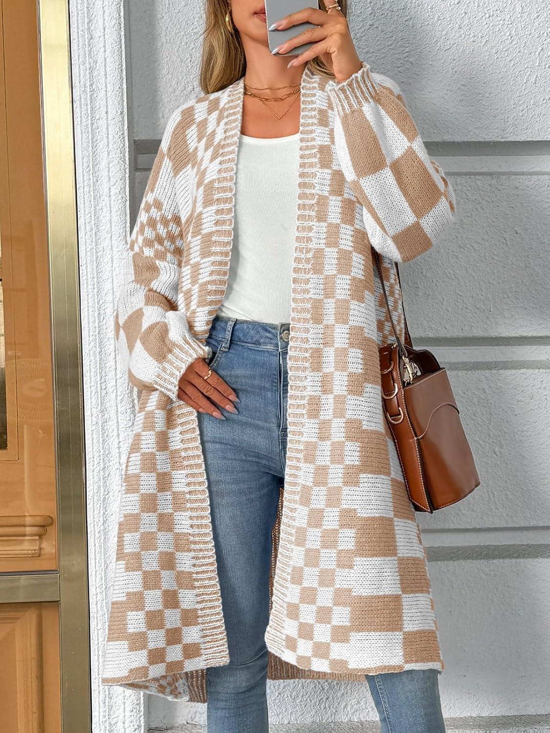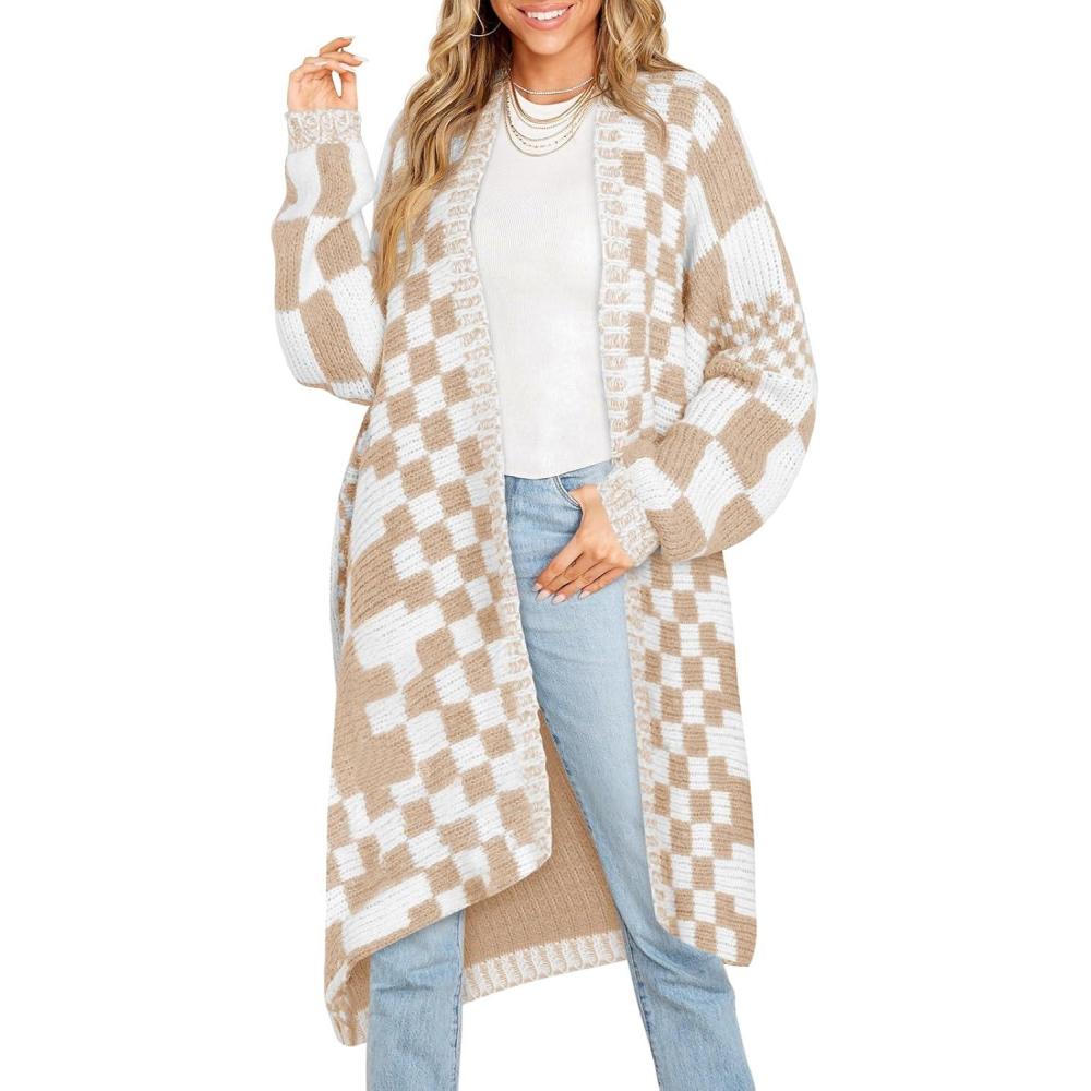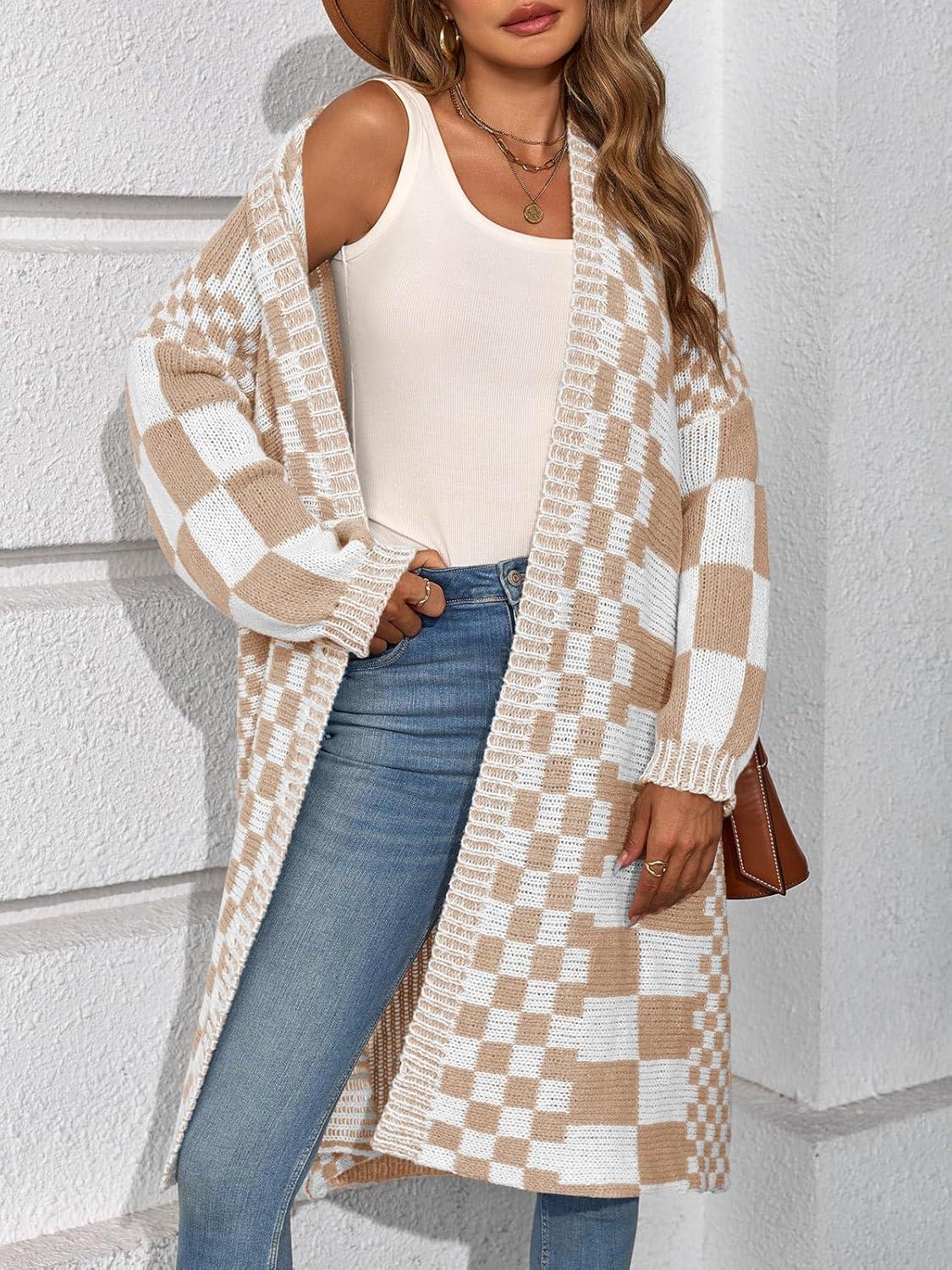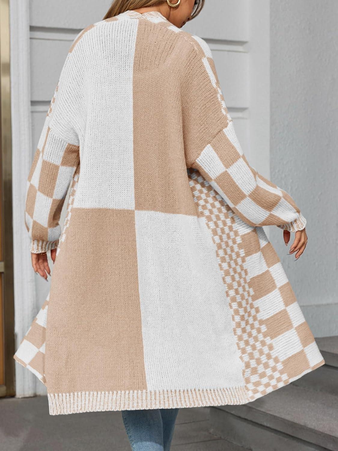 Saodimallsu Womens Checkered Long Cardigans Chunky Oversized Open Front Batwing Sleeve Color Block Knit Sweater Coats(Khaki)