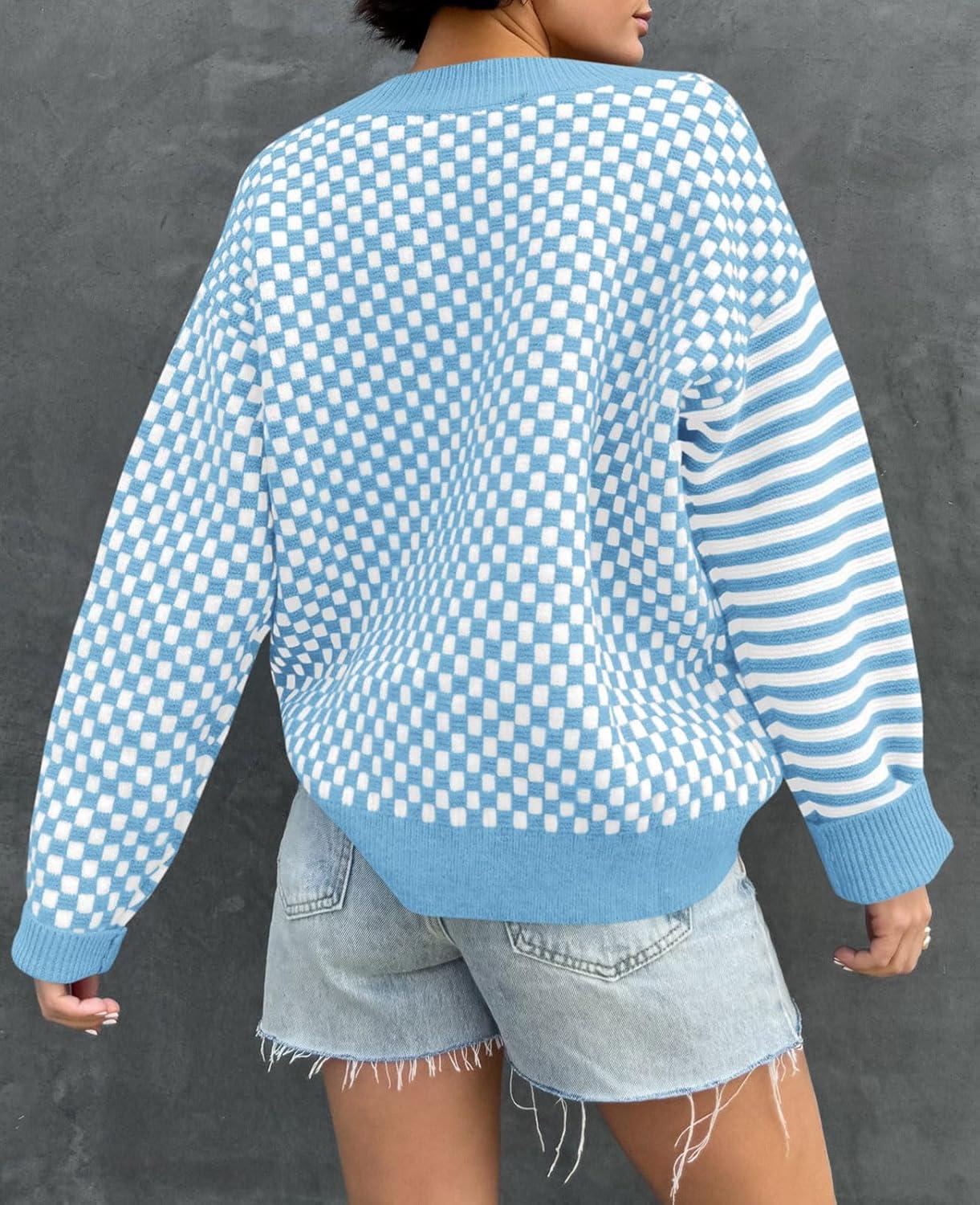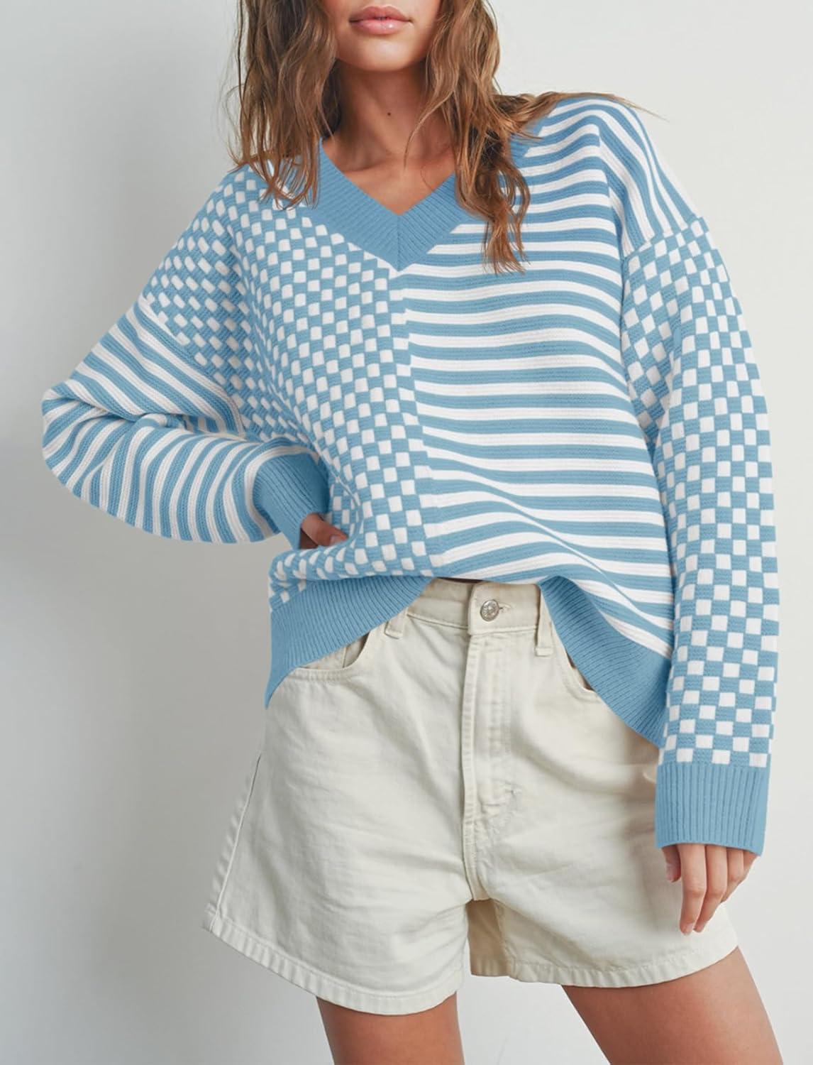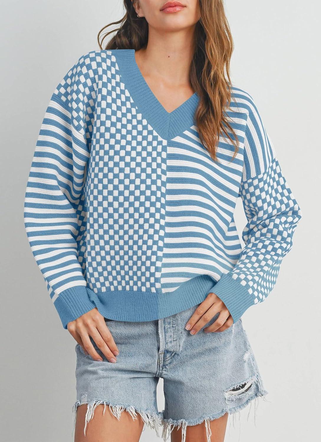 Saodimallsu Womens Checkered Striped Sweater V Neck Long Sleeve Fall Trendy Loose Knit Cozy Pullover Tops(Blue)
