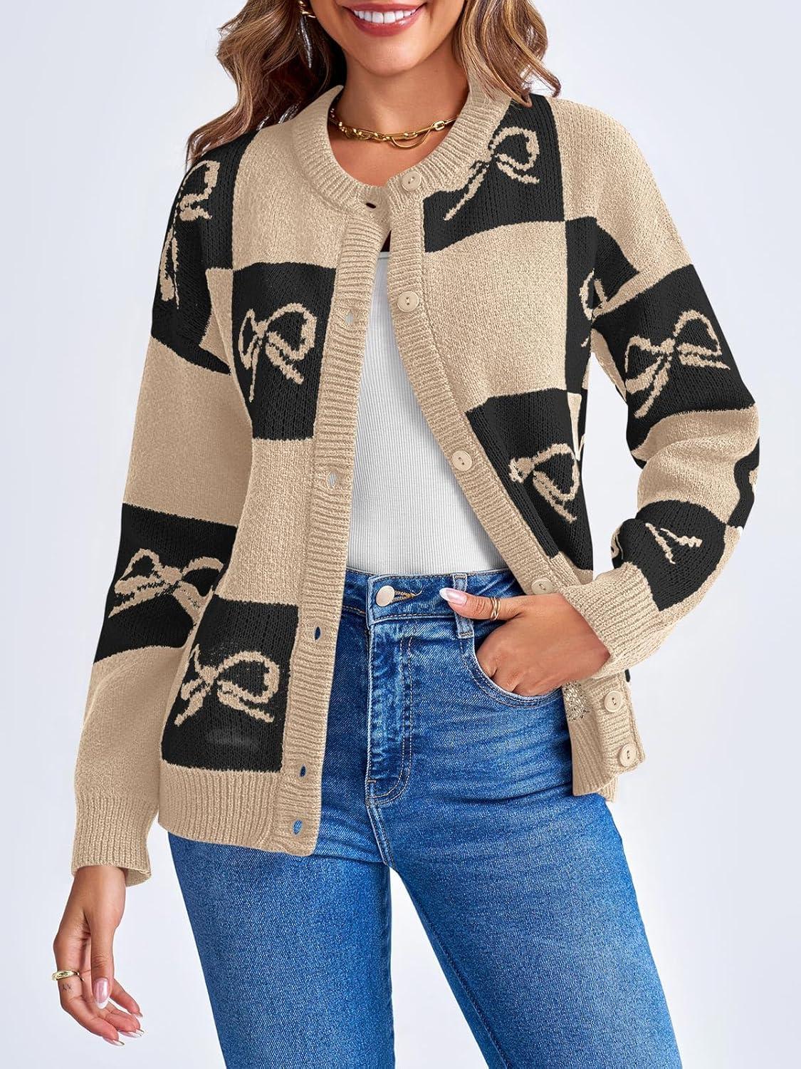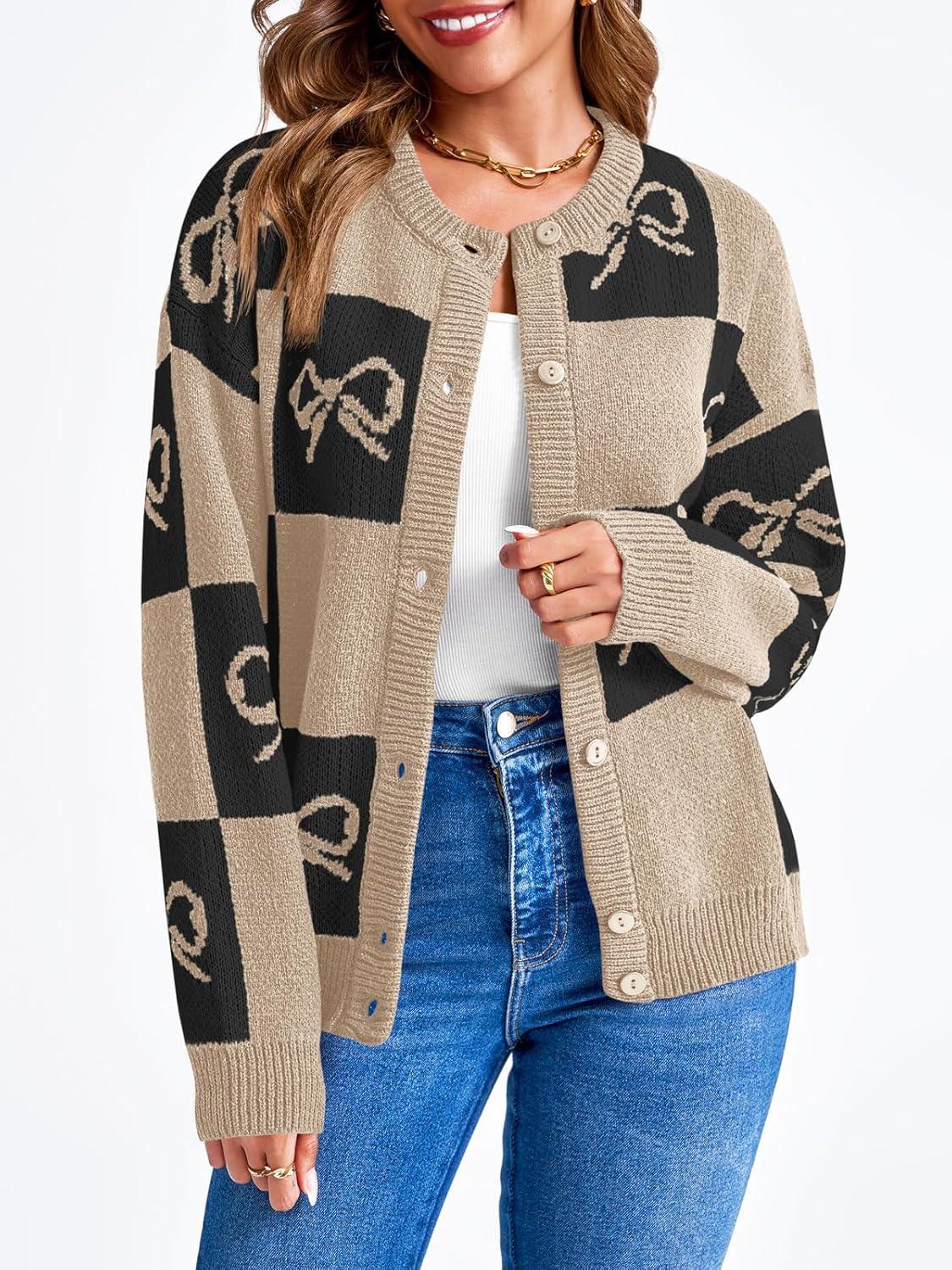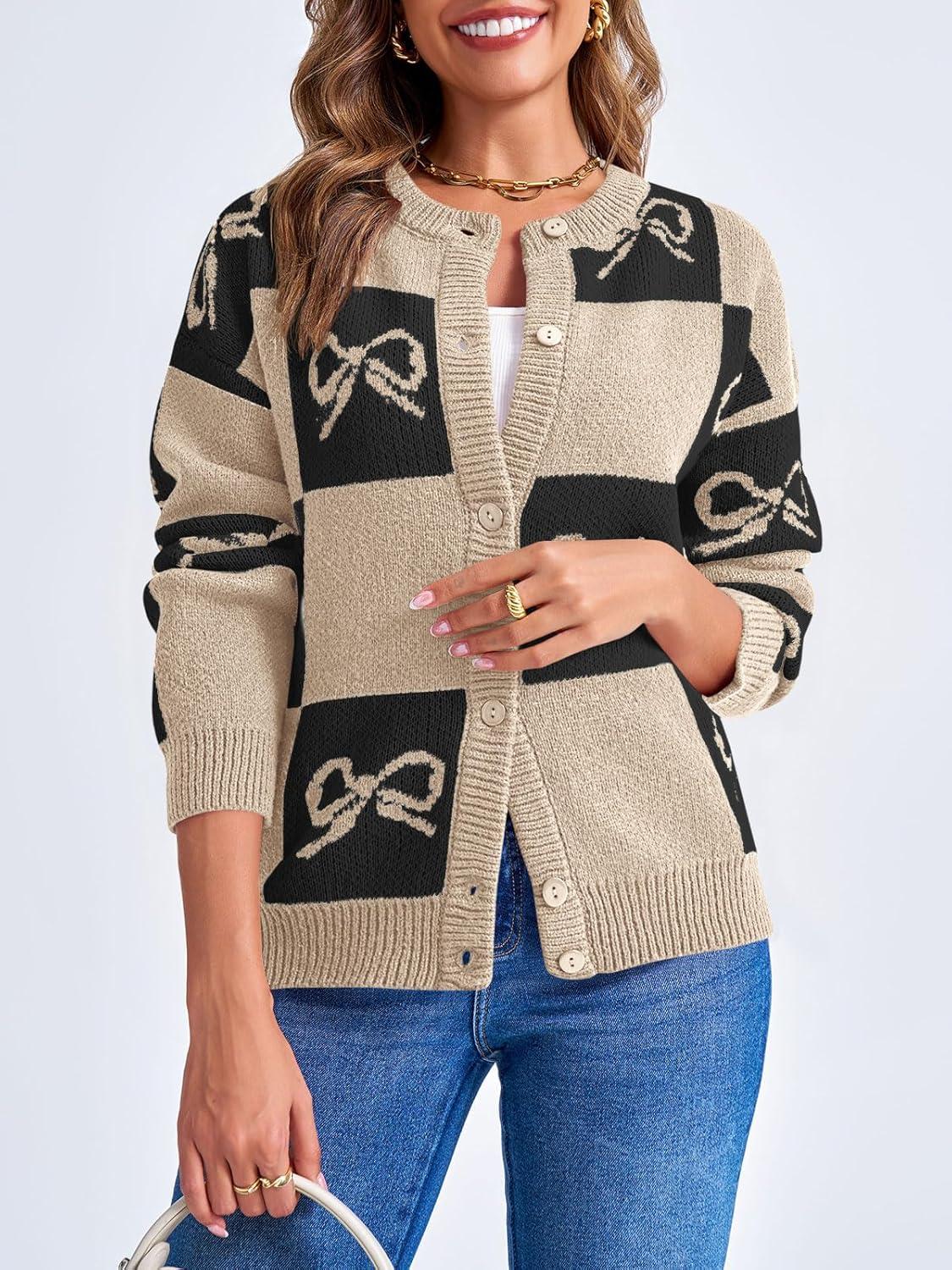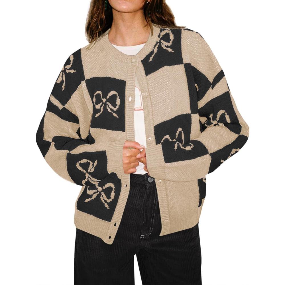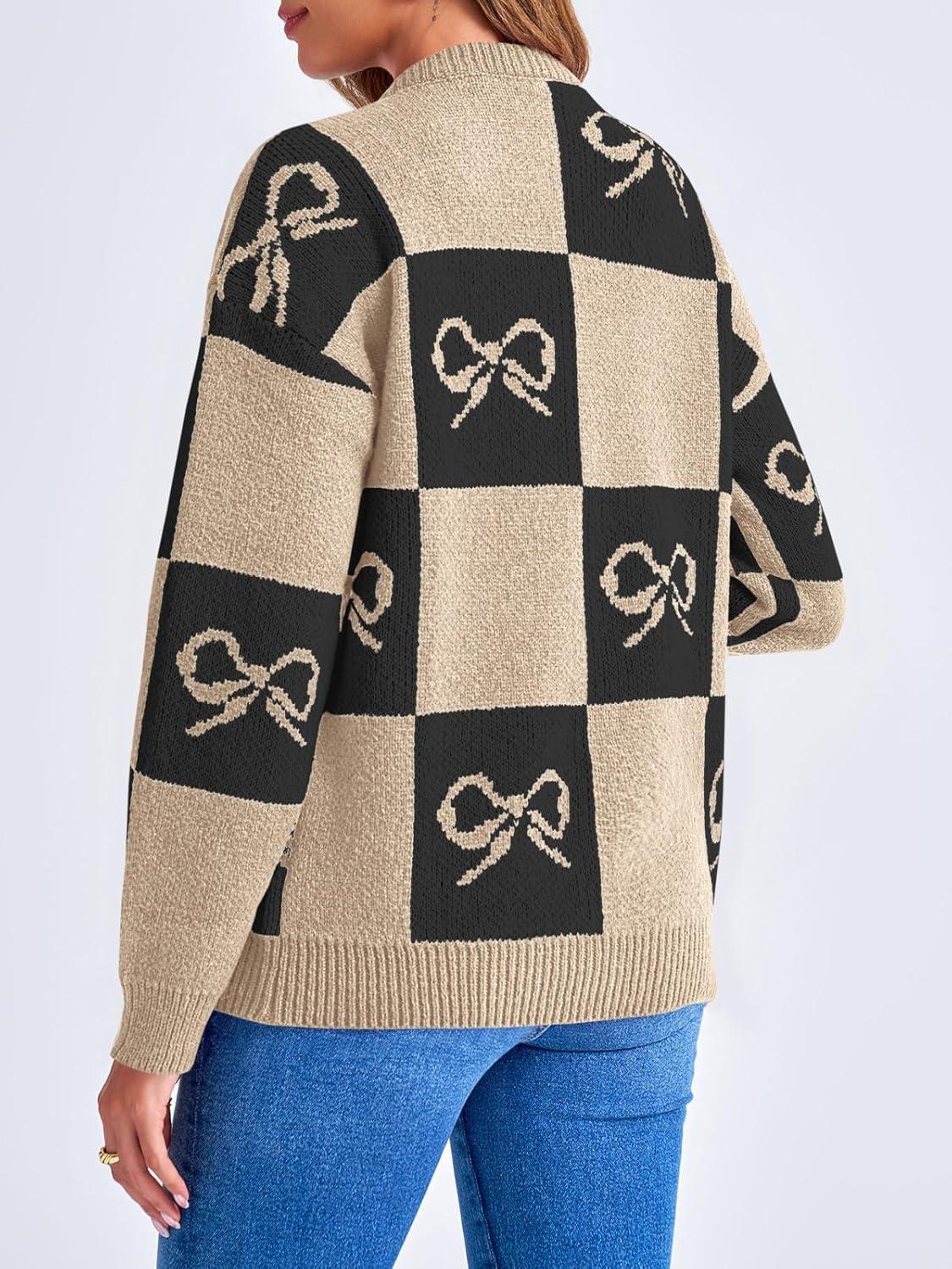 Saodimallsu Womens Checkered Sweater Bow Color Block Plaid Cardigan Long Sleeve Button Open Front Knit Coat(Apricot)