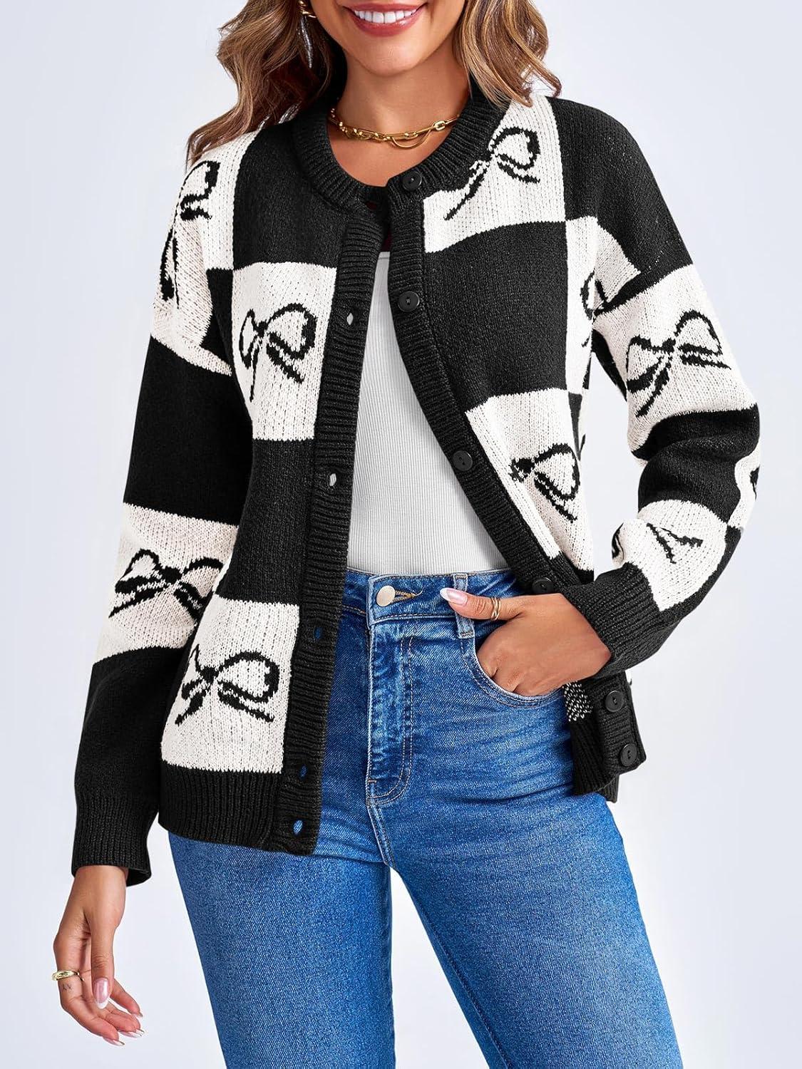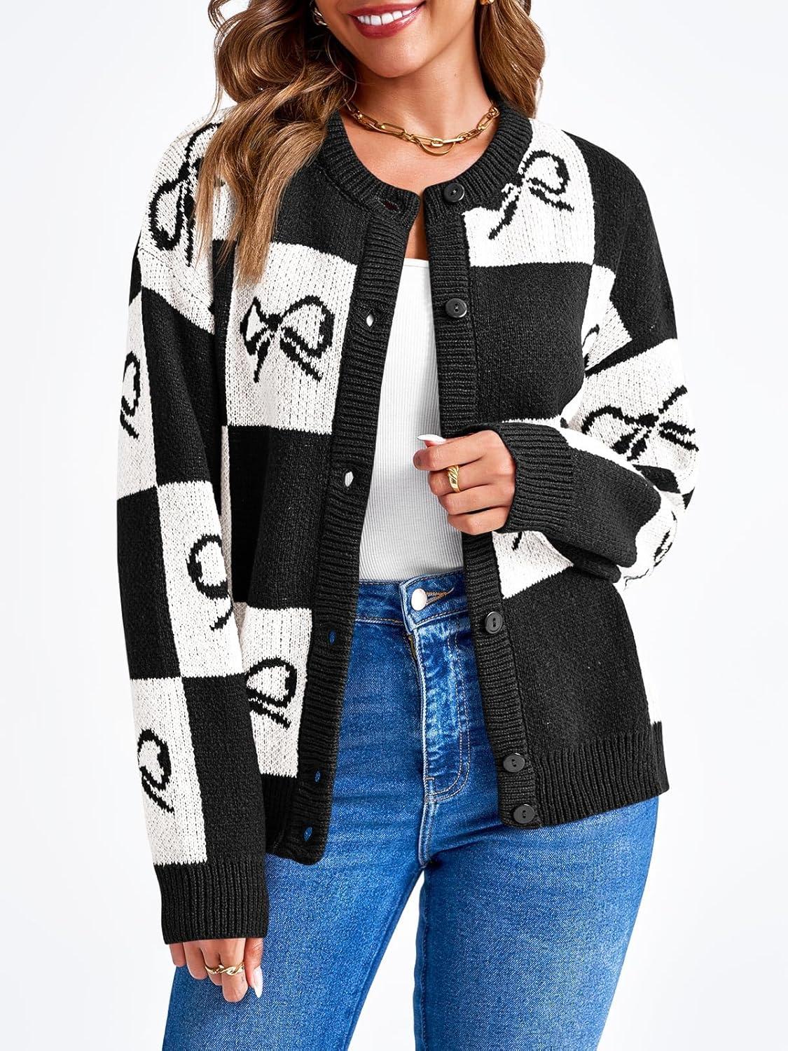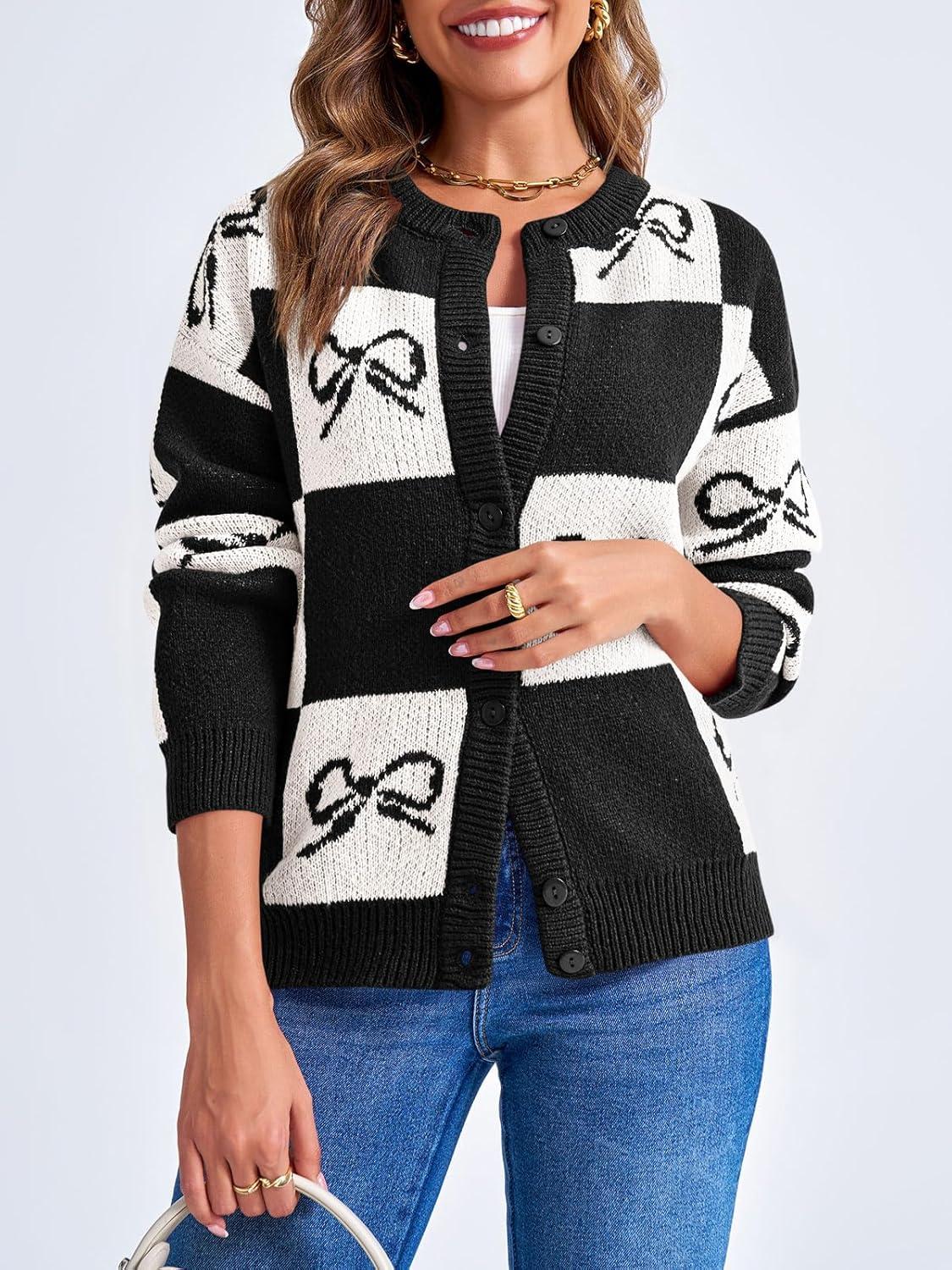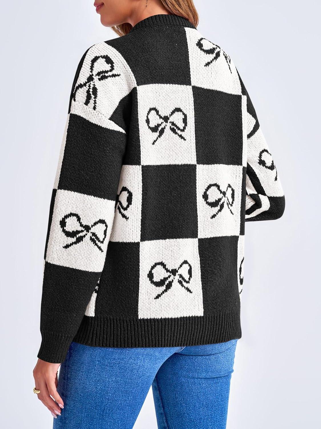 Saodimallsu Womens Checkered Sweater Bow Color Block Plaid Cardigan Long Sleeve Button Open Front Knit Coat(Black)
