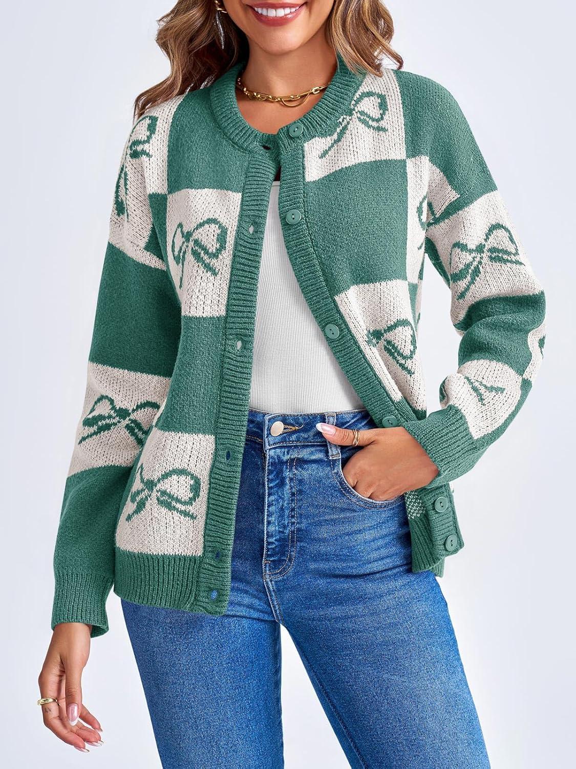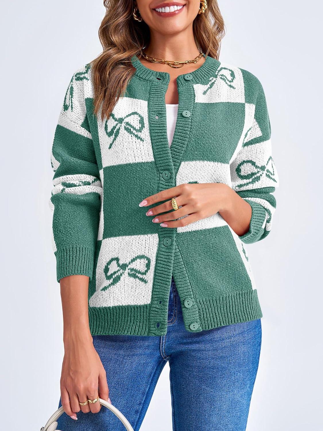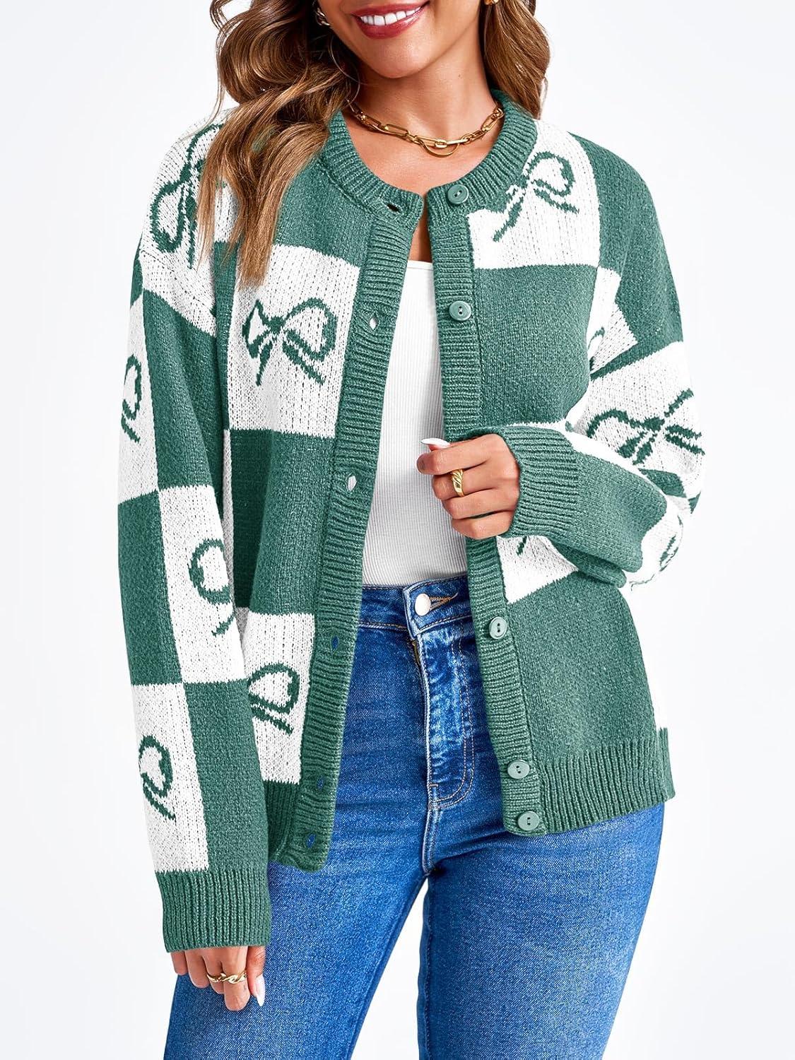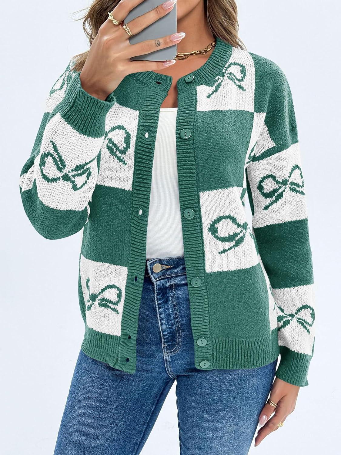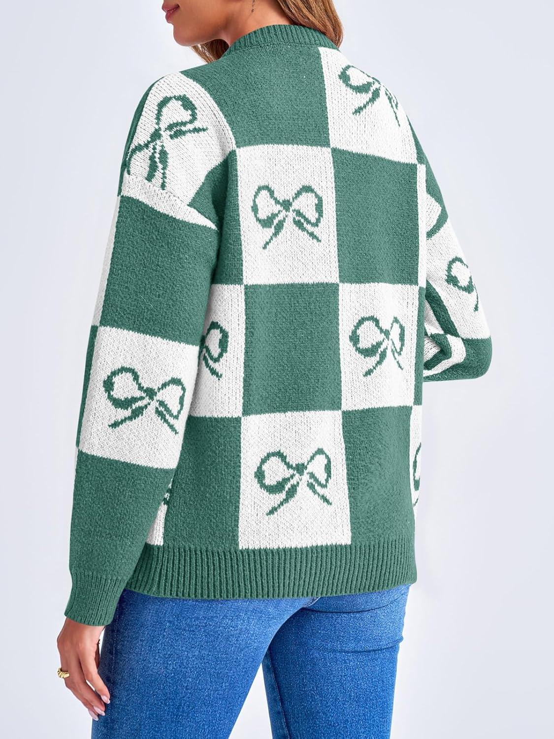 Saodimallsu Womens Checkered Sweater Bow Color Block Plaid Cardigan Long Sleeve Button Open Front Knit Coat(Green)