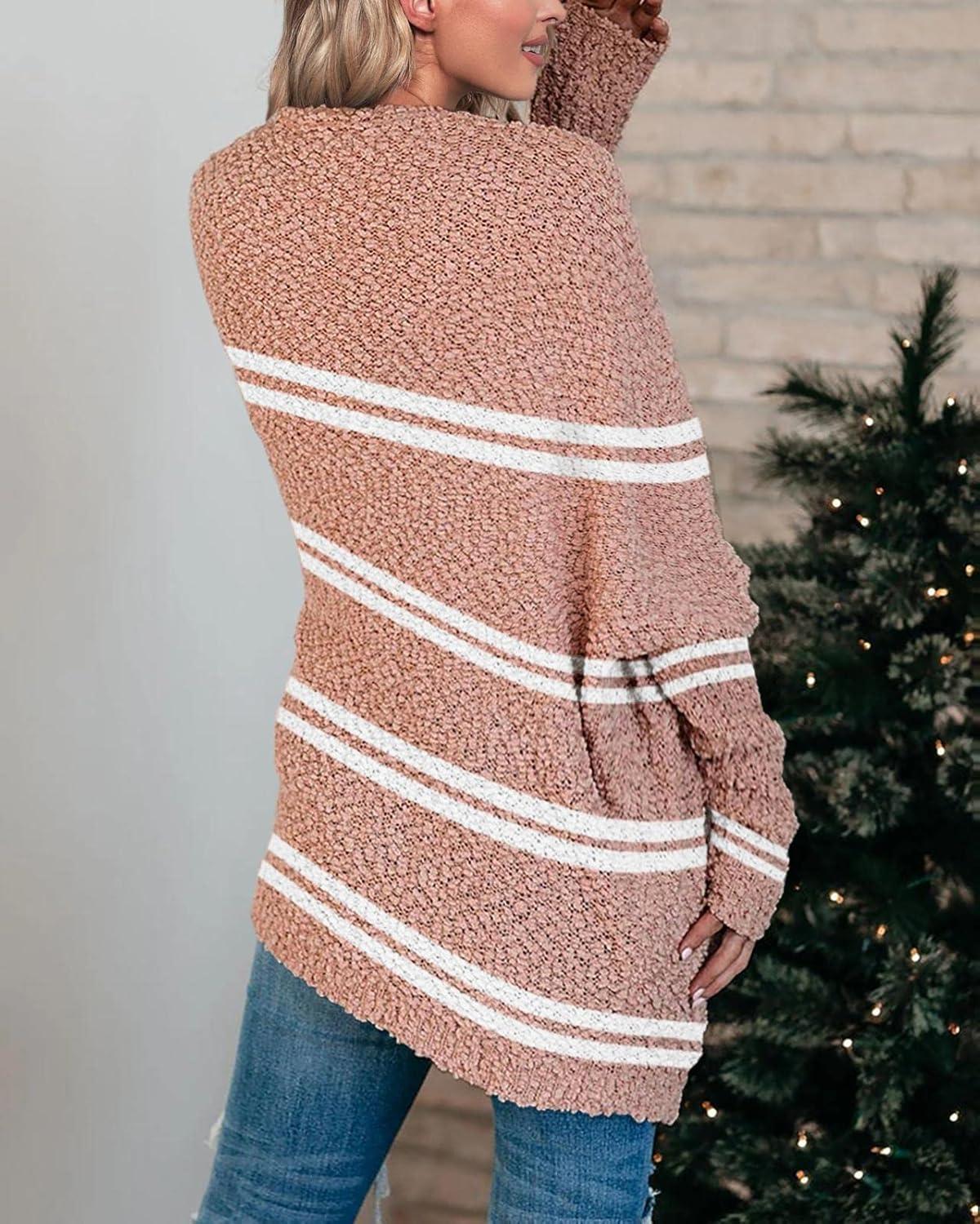 Saodimallsu Women’s Chunky Popcorn Cardigan Oversized Open Front Boyfriend Batwing Long Sleeve Fuzzy Knit Sweaters(Z Striped Pink)