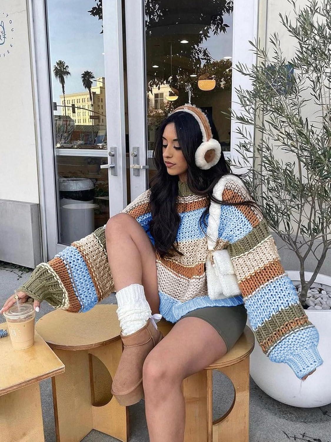 Saodimallsu Womens Color Block Sweater Striped Chunky Knit Cropped Sweaters Crewneck Fall Long Sleeve Loose Pullover Tops(Blue)