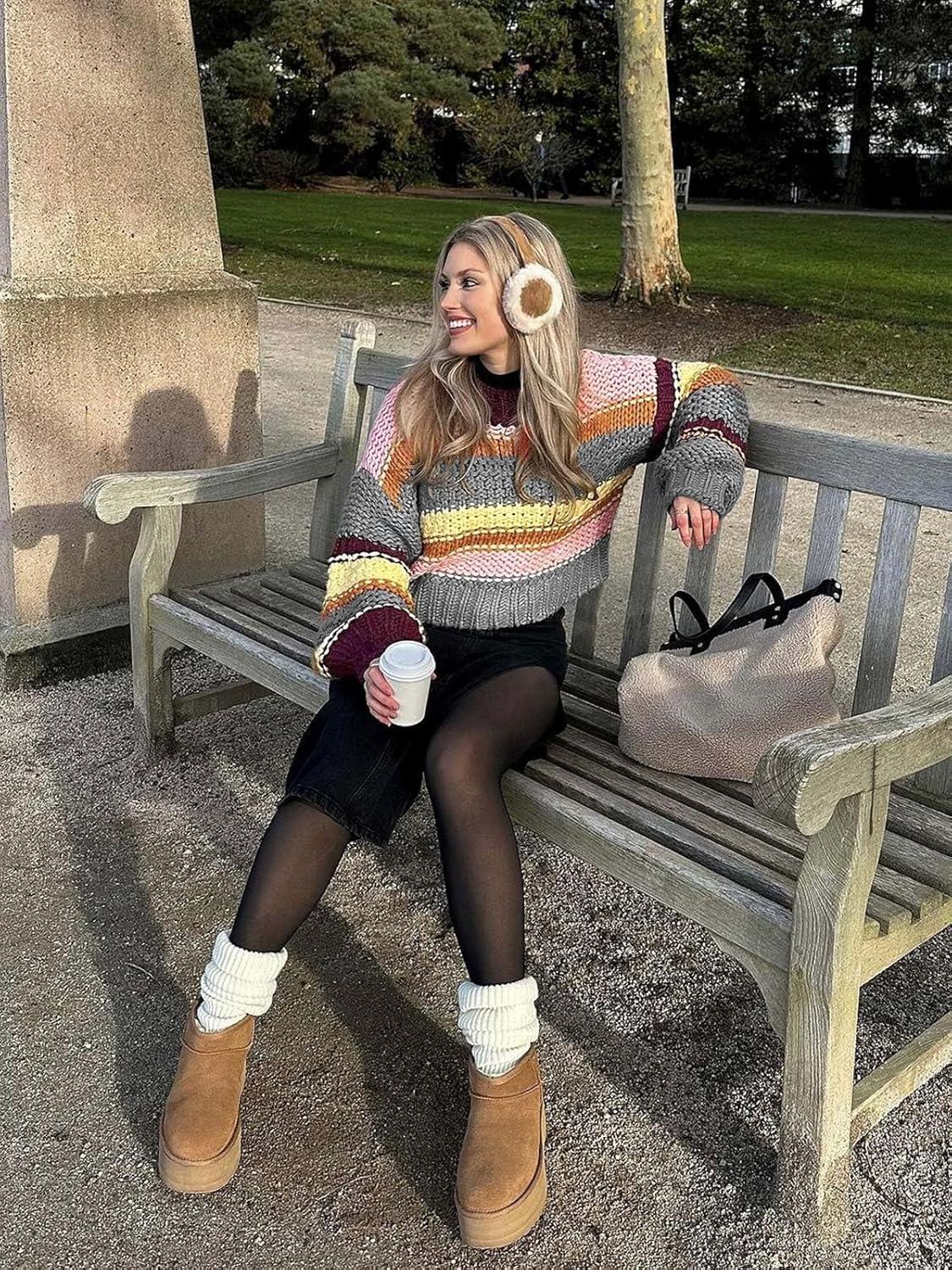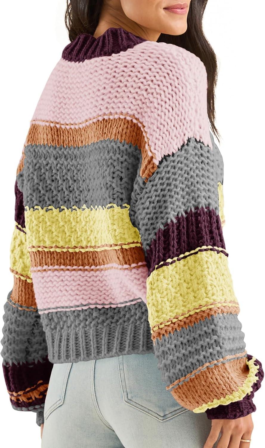 Saodimallsu Womens Color Block Sweater Striped Chunky Knit Cropped Sweaters Crewneck Fall Long Sleeve Loose Pullover Tops(Gray)