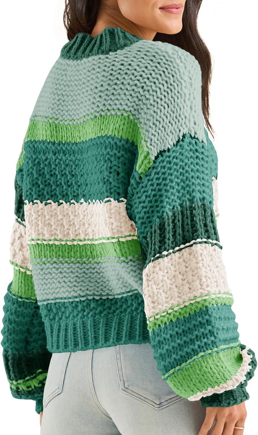 Saodimallsu Womens Color Block Sweater Striped Chunky Knit Cropped Sweaters Crewneck Fall Long Sleeve Loose Pullover Tops(Green)