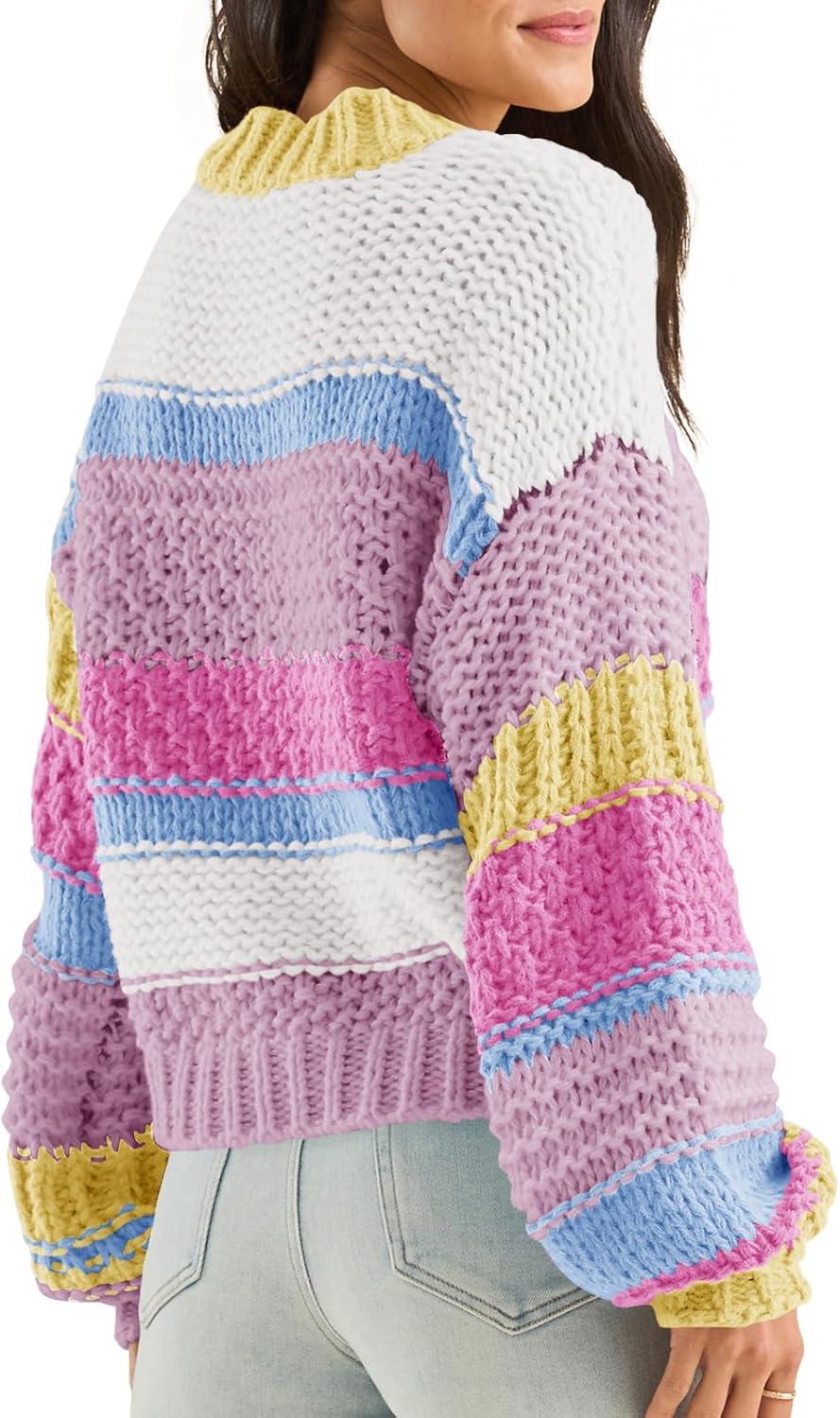 Saodimallsu Womens Color Block Sweater Striped Chunky Knit Cropped Sweaters Crewneck Fall Long Sleeve Loose Pullover Tops(Pink)