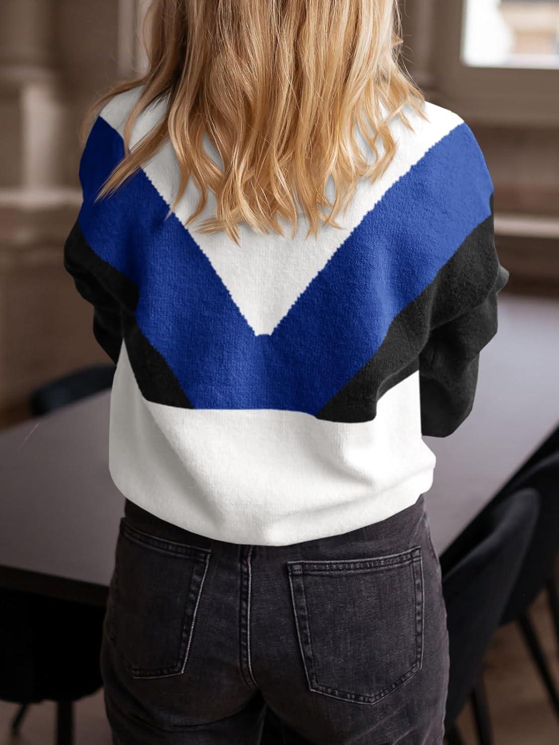 Saodimallsu Womens Color Block Sweaters Mock Neck Button Long Sleeve Knit Henley Shirts Loose Casual Pullover Tops(Blue)