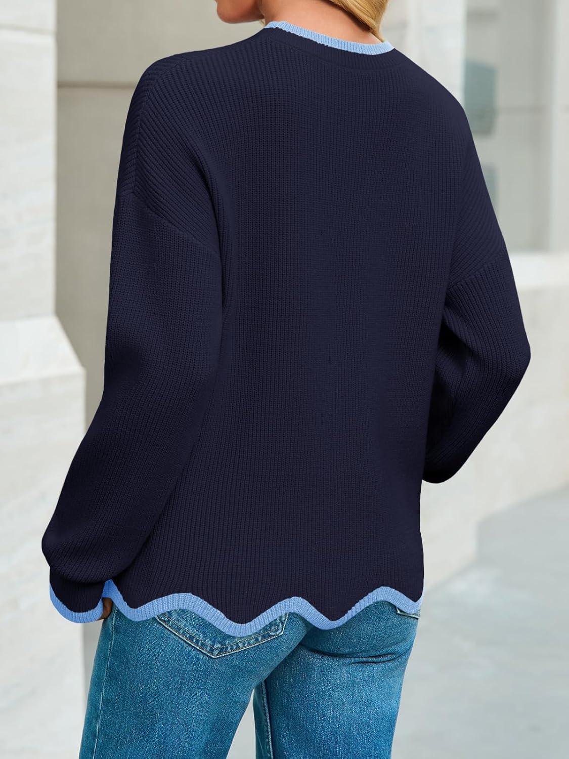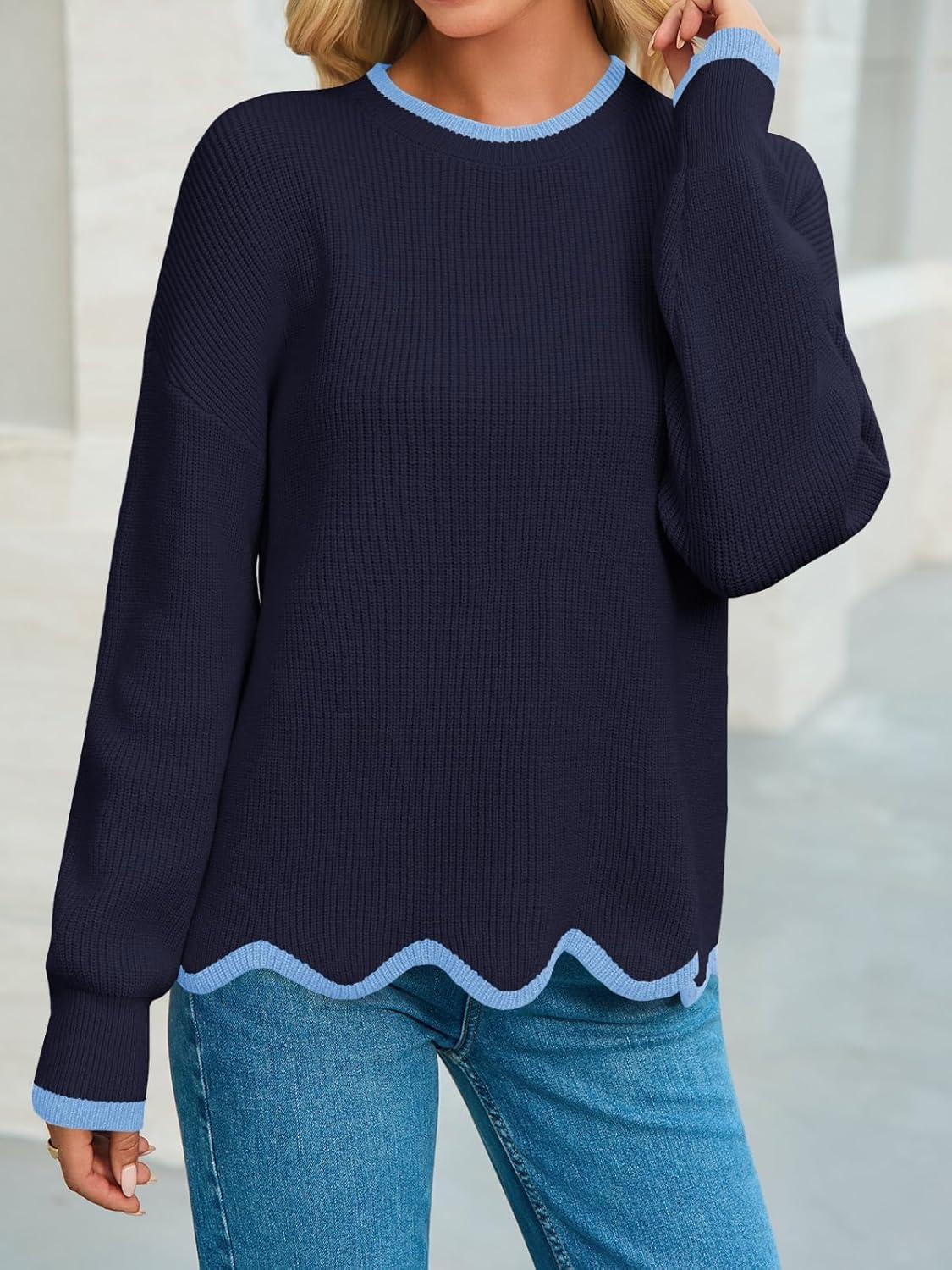 Saodimallsu Womens Contrast Color Pullover Sweaters Crewneck Knit Tops with Wave Hem Long Sleeve Sweater Fall 2025(Navy)