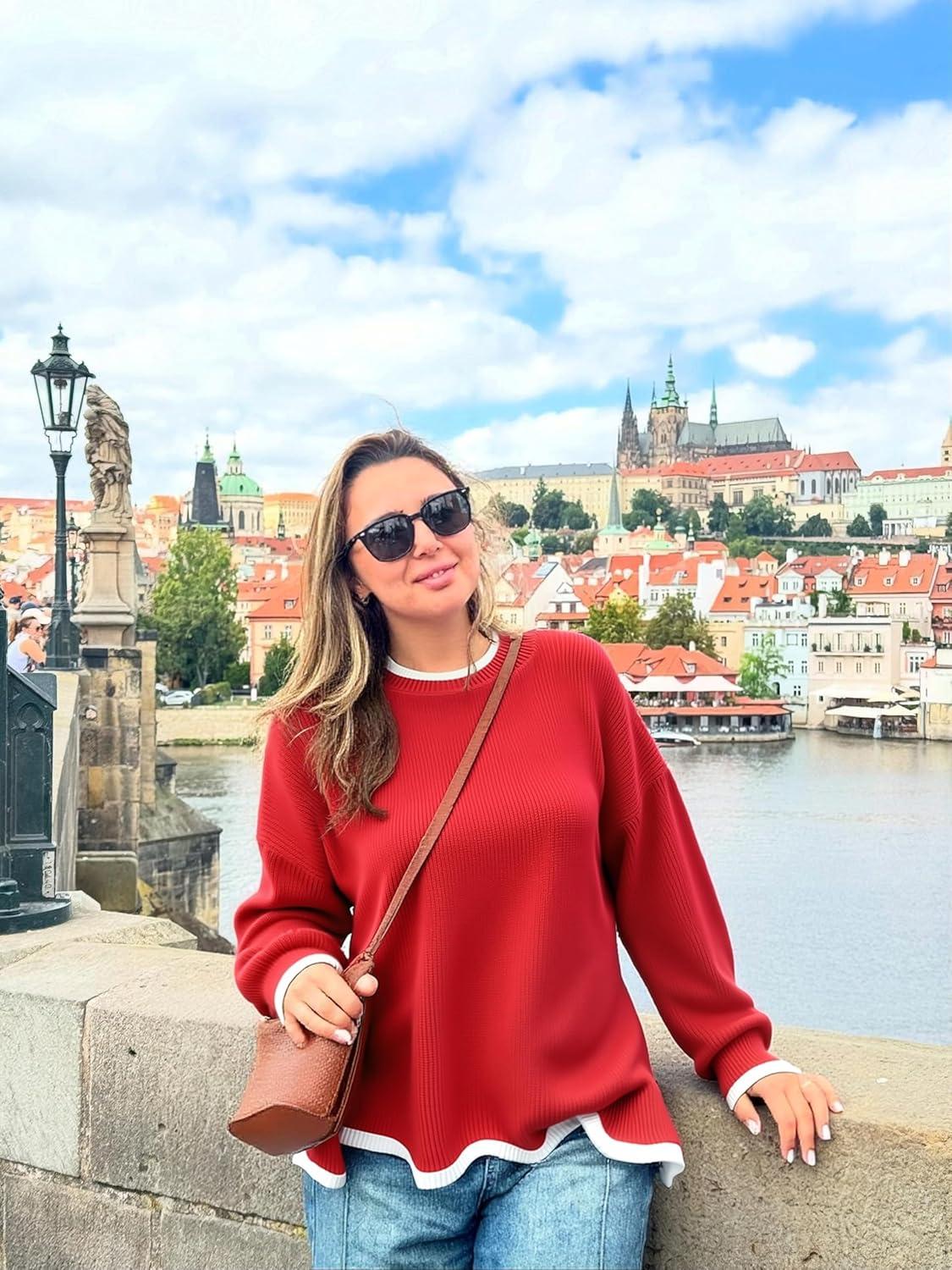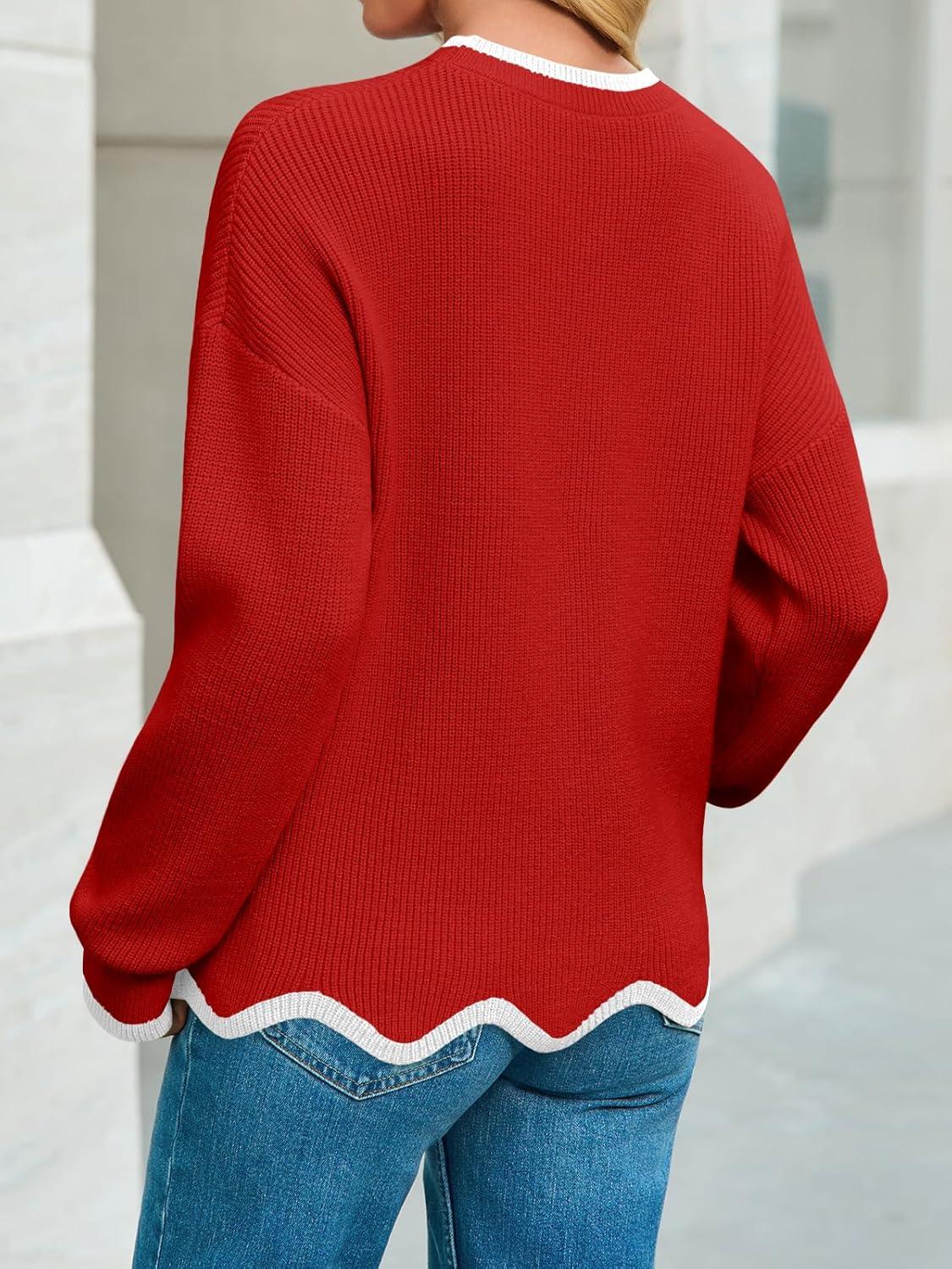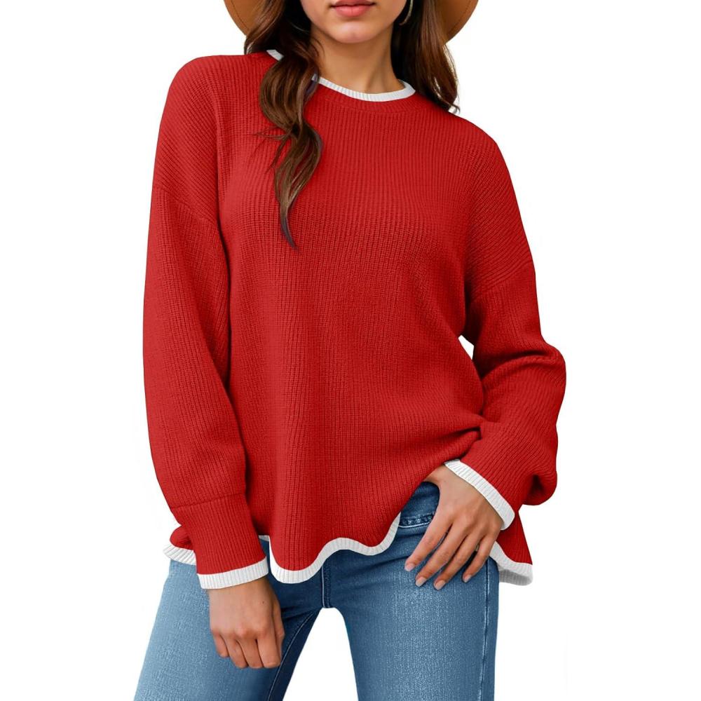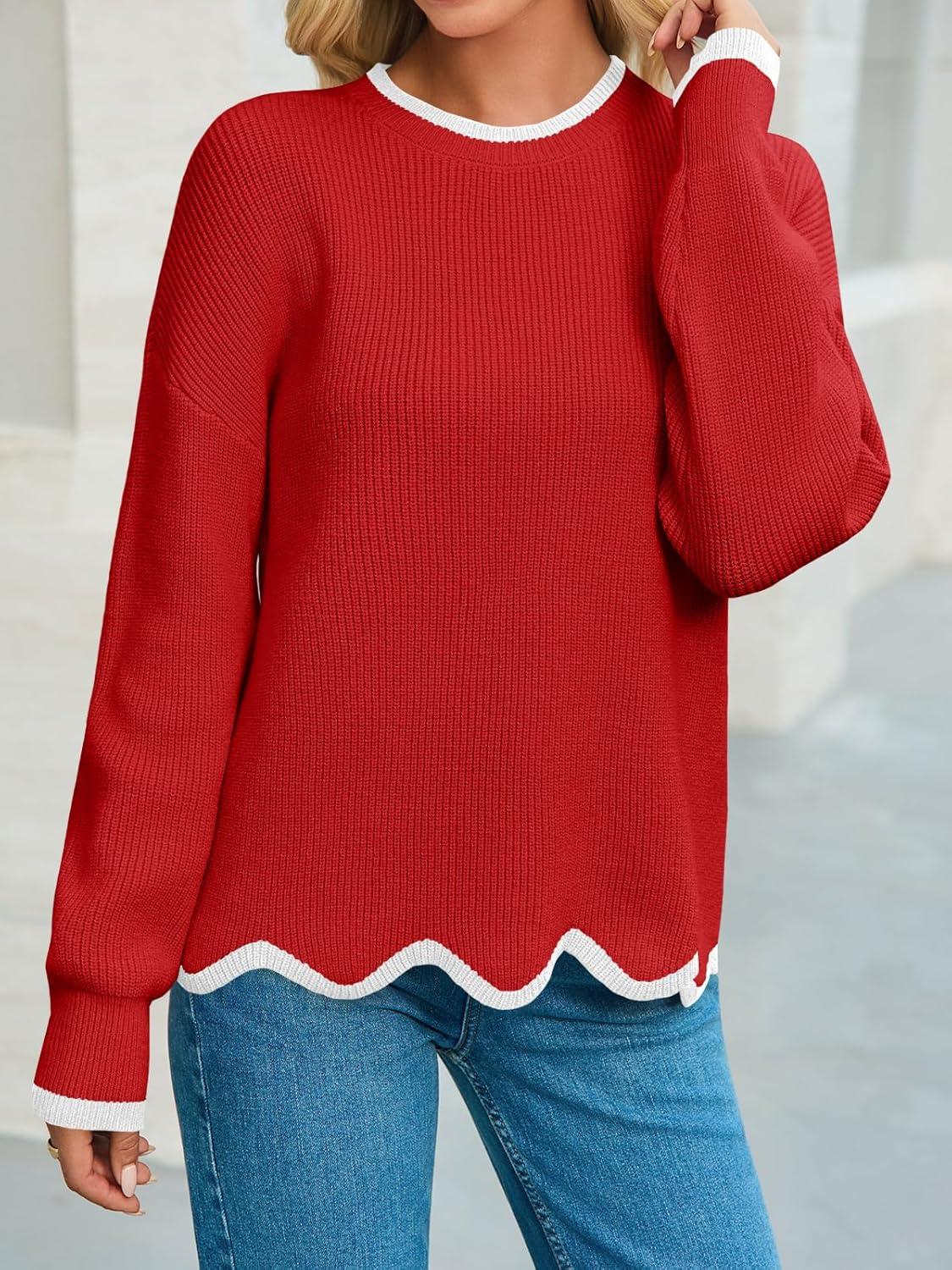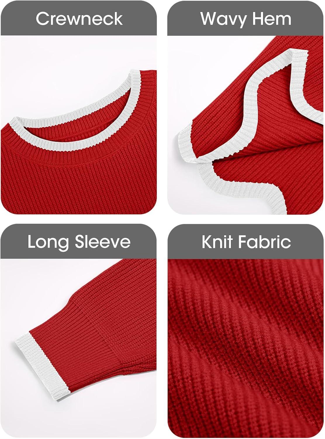 Saodimallsu Womens Contrast Color Pullover Sweaters Crewneck Knit Tops with Wave Hem Long Sleeve Sweater Fall 2025(Red)