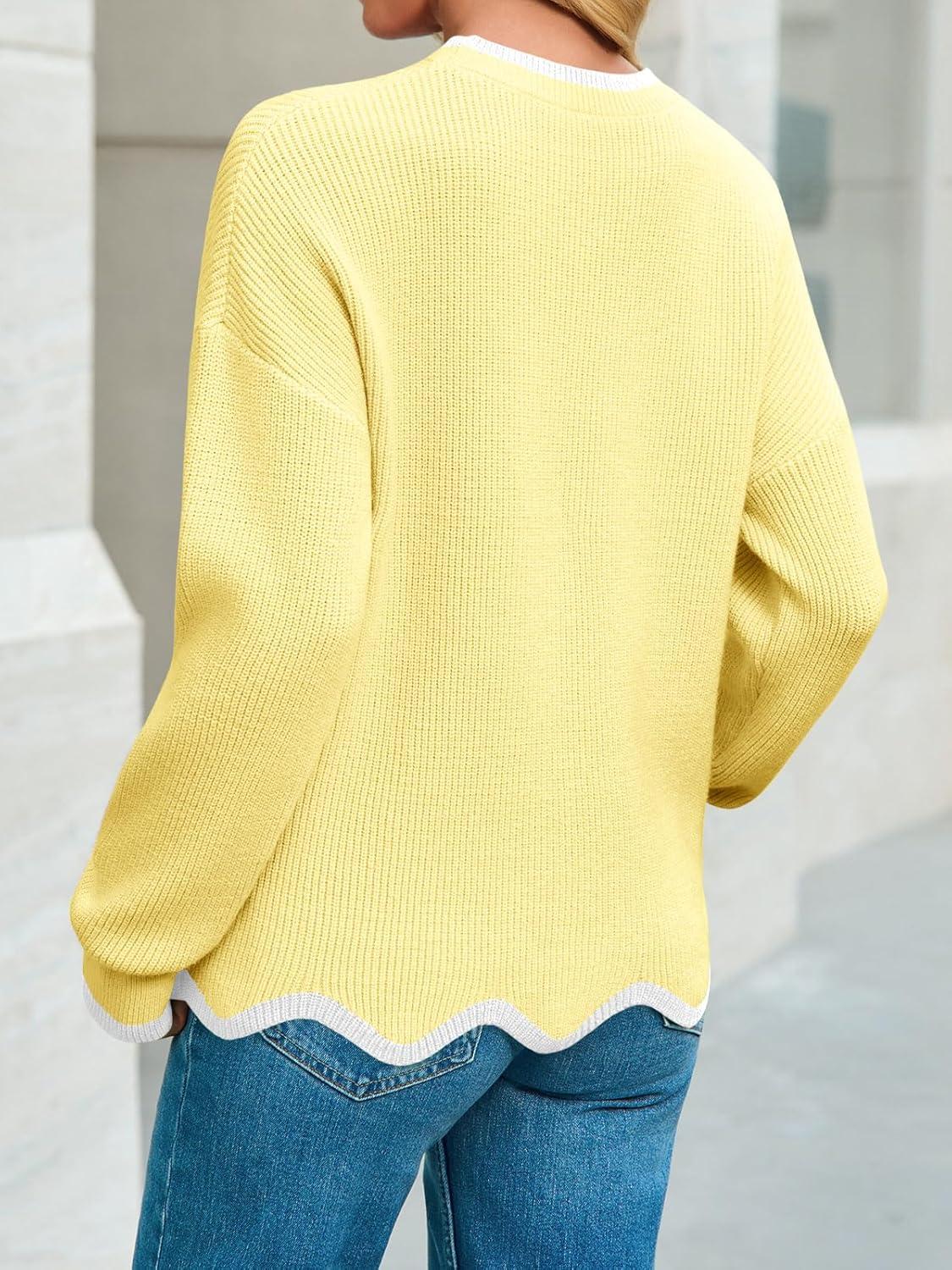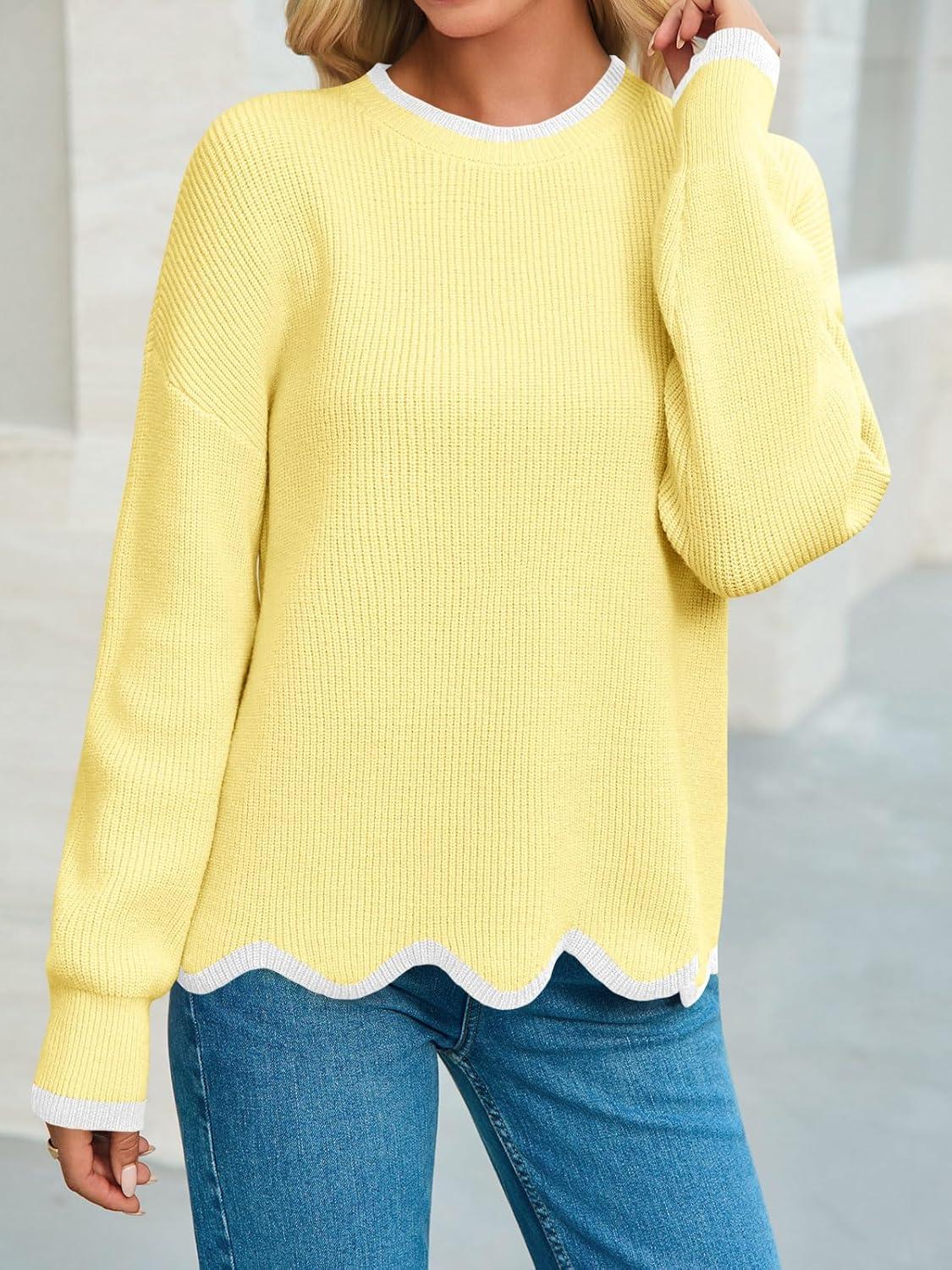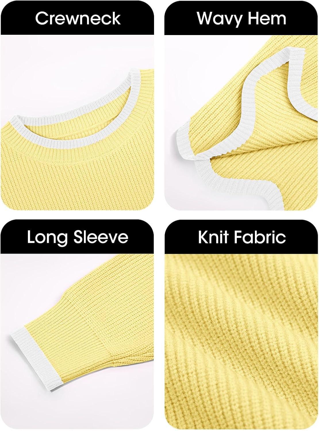 Saodimallsu Womens Contrast Color Pullover Sweaters Crewneck Knit Tops with Wave Hem Long Sleeve Sweater Fall 2025(Yellow)