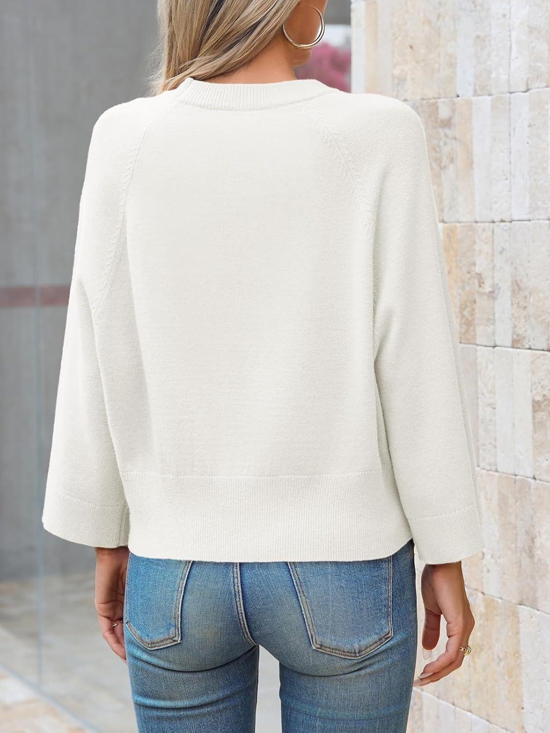 Saodimallsu Womens Crew Neck Batwing Sweaters 3/4 Sleeve Soft Knit Dressy Casual Loose Fit Fall Sweater Tops(White)