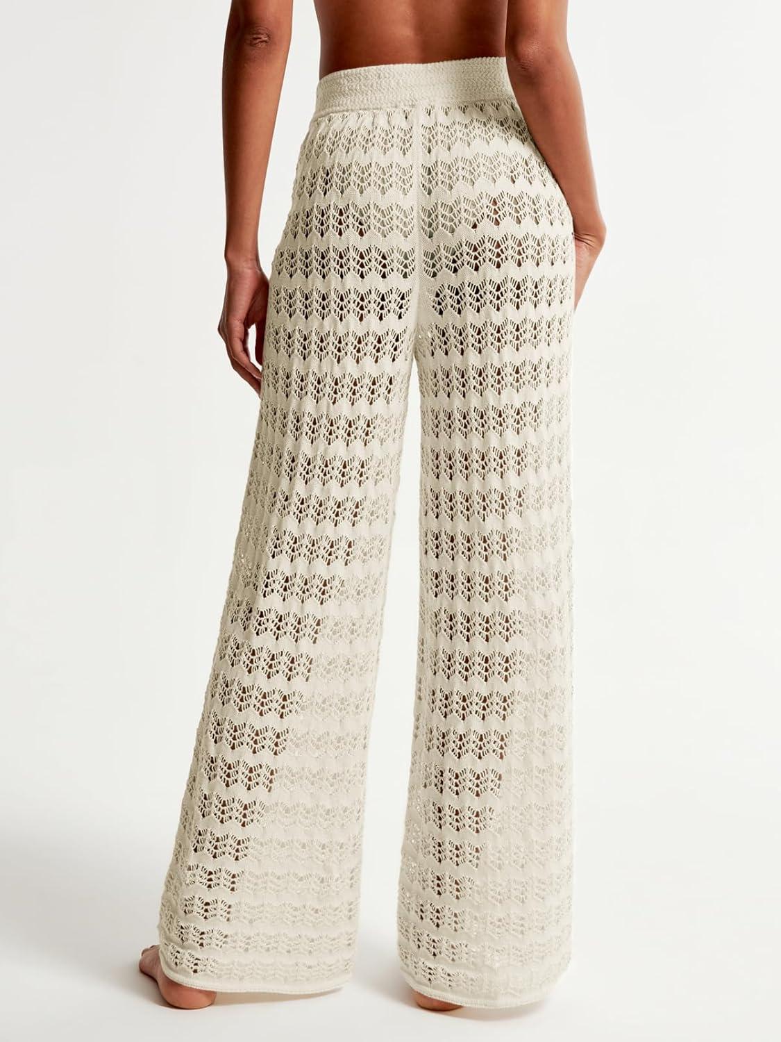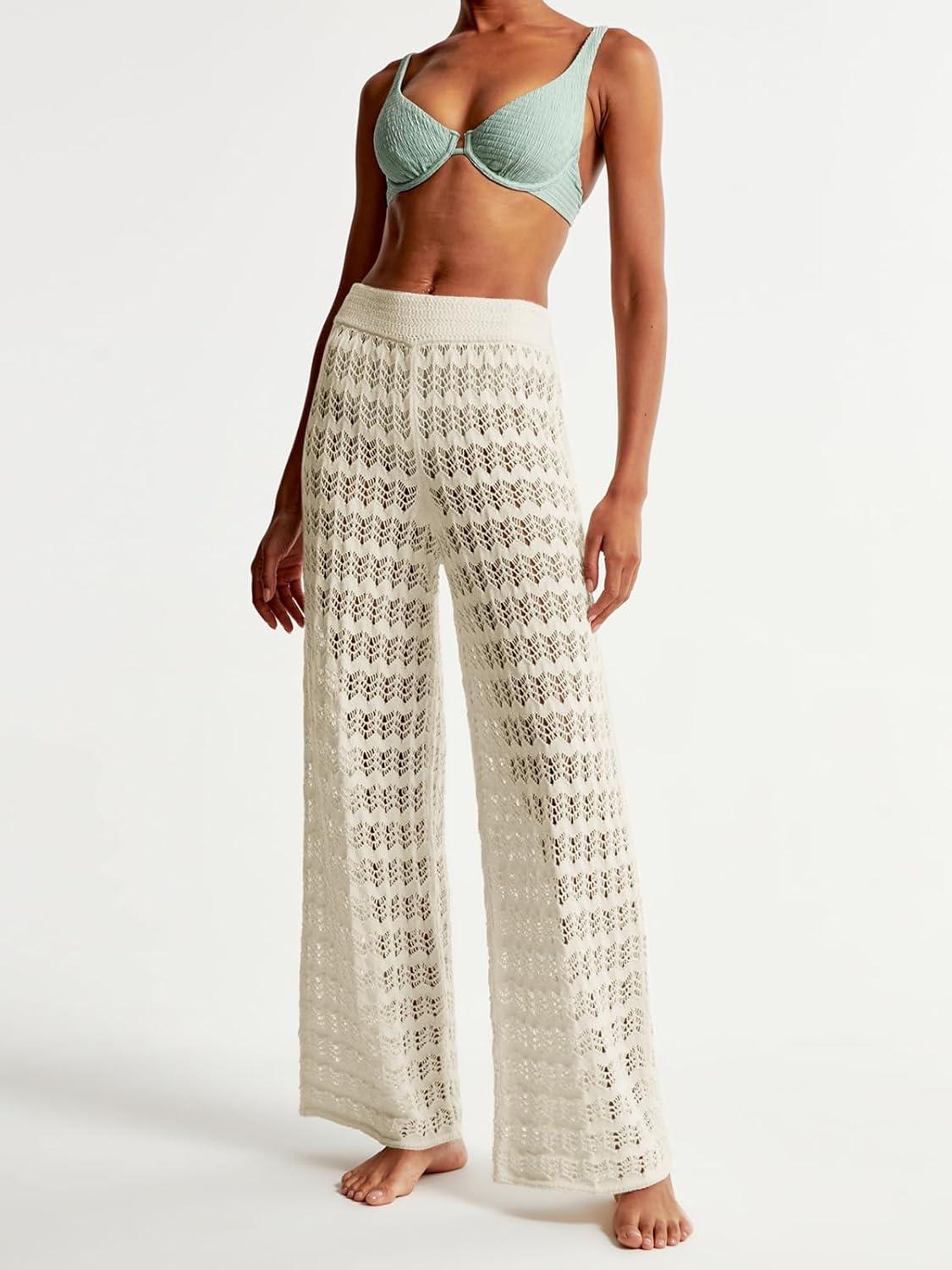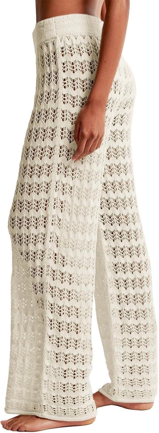 Saodimallsu Womens Crochet Cover Up Pants Sheer Mesh High Waist Sexy Casual Knit Summer Swimsuit Coverup Beach Pants(Beige)