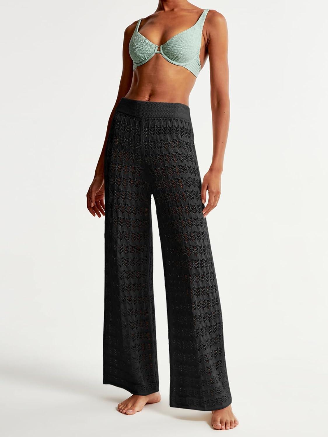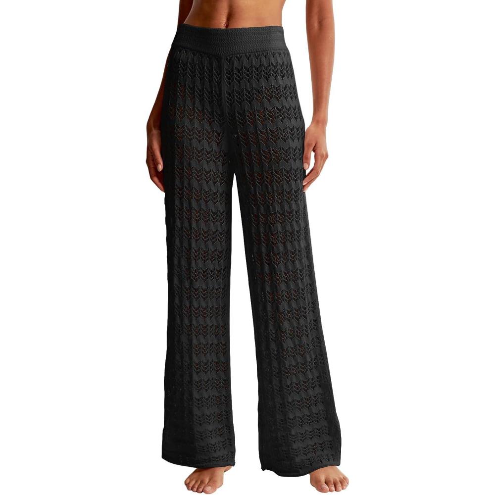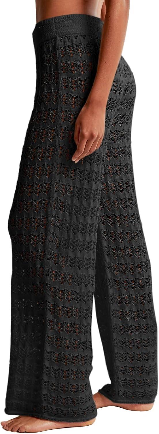 Saodimallsu Womens Crochet Cover Up Pants Sheer Mesh High Waist Sexy Casual Knit Summer Swimsuit Coverup Beach Pants(Black)