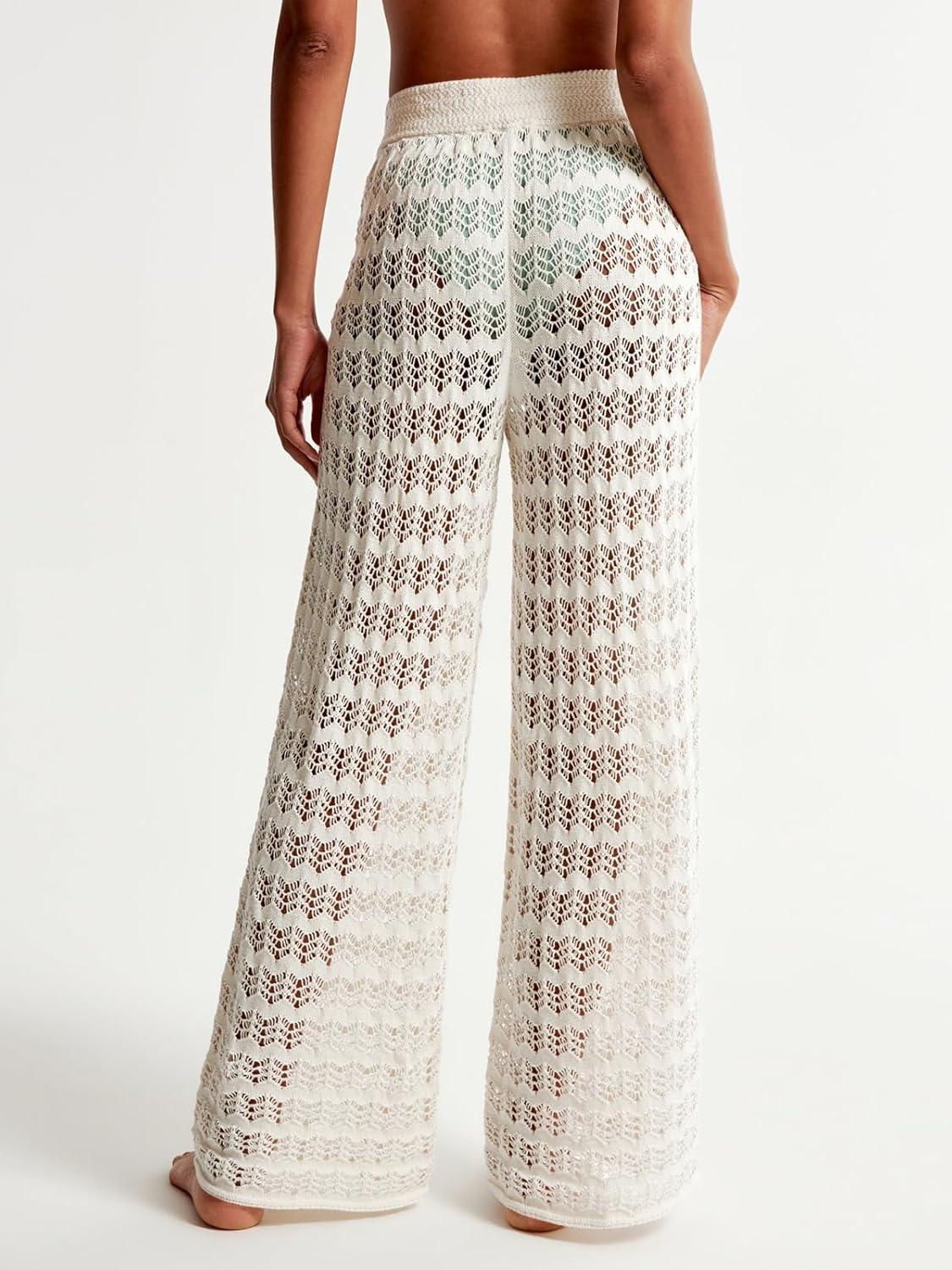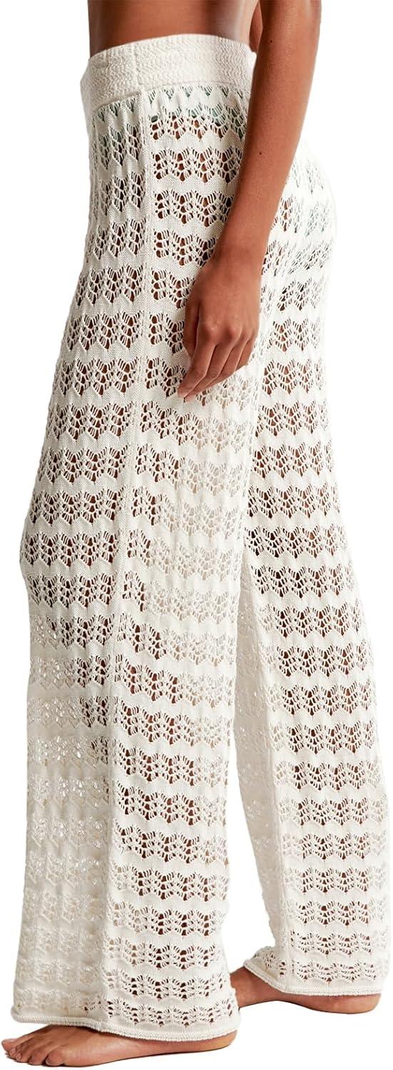 Saodimallsu Womens Crochet Cover Up Pants Sheer Mesh High Waist Sexy Casual Knit Summer Swimsuit Coverup Beach Pants(White)
