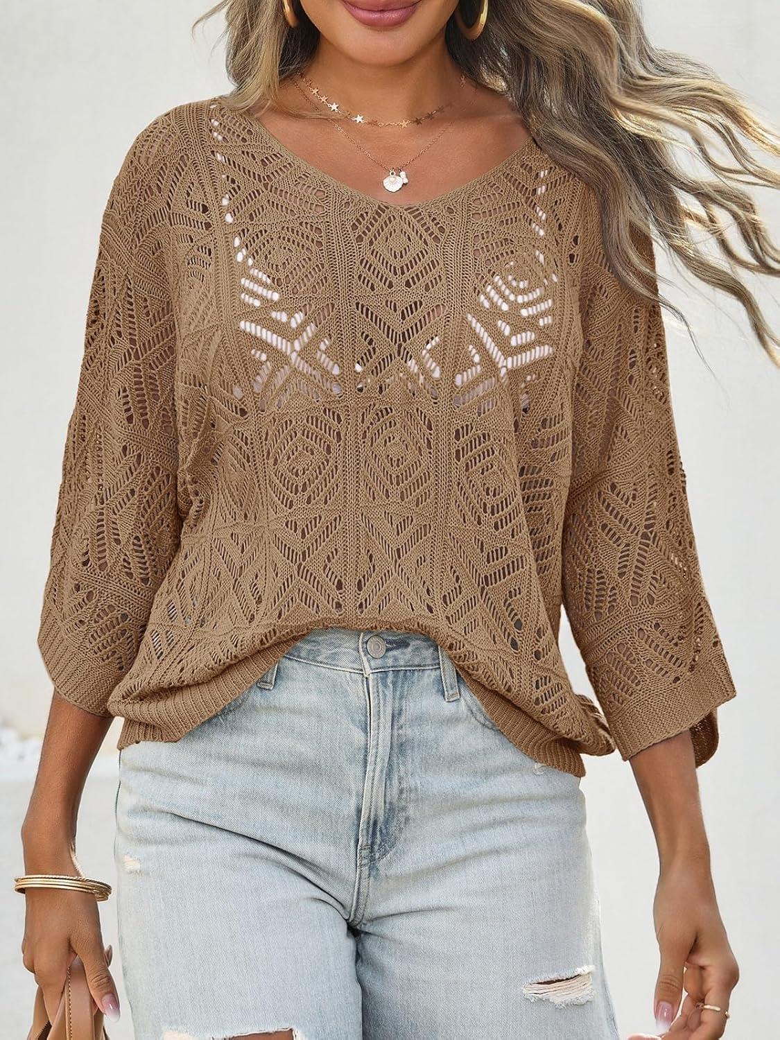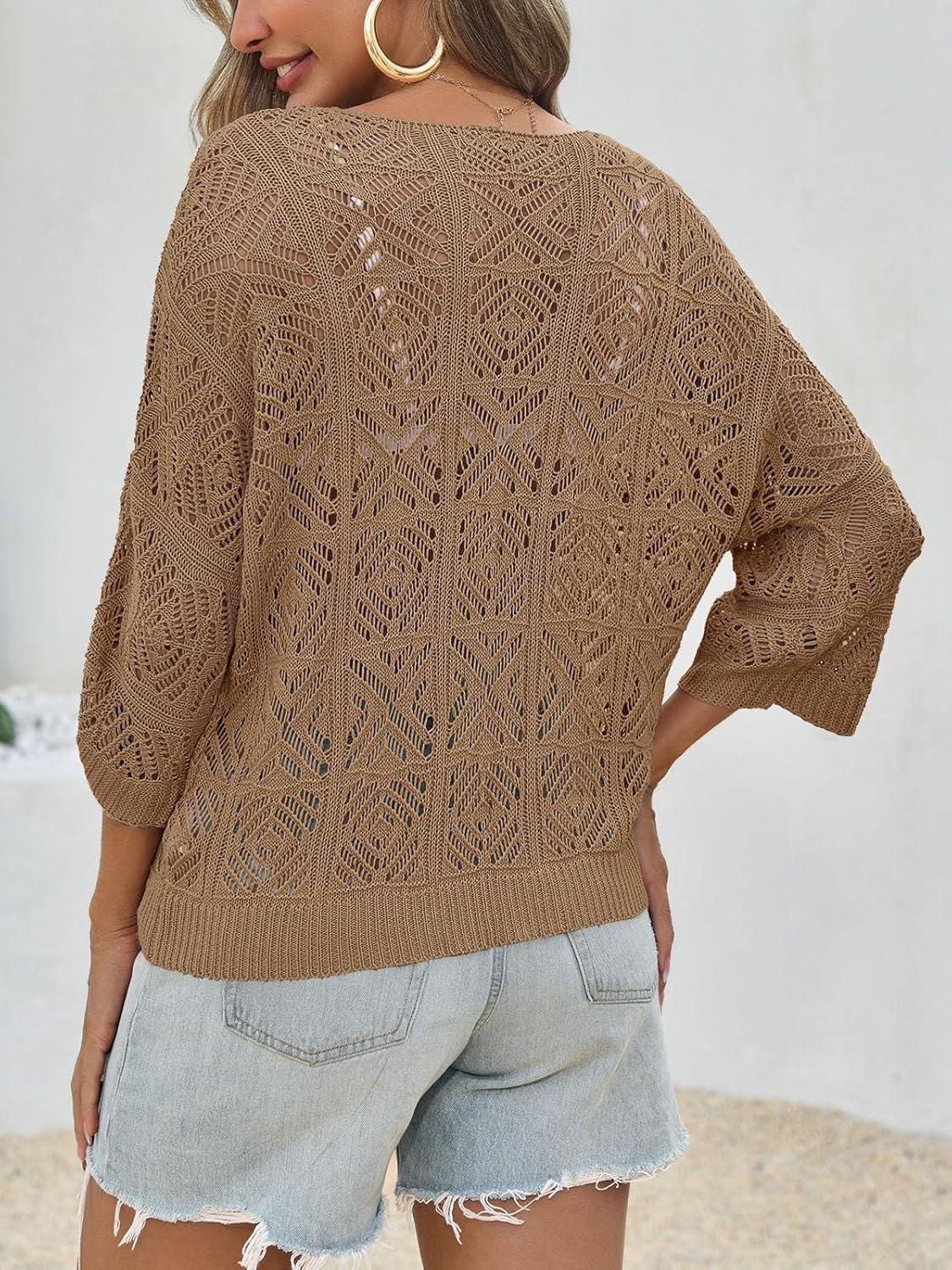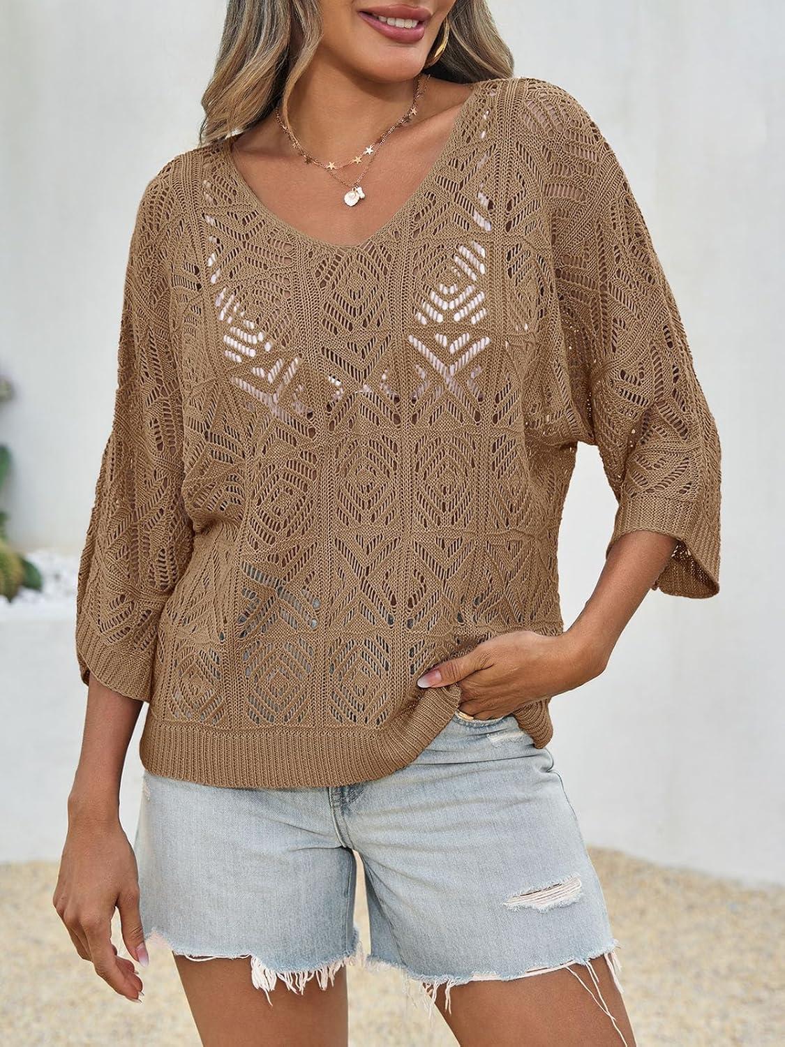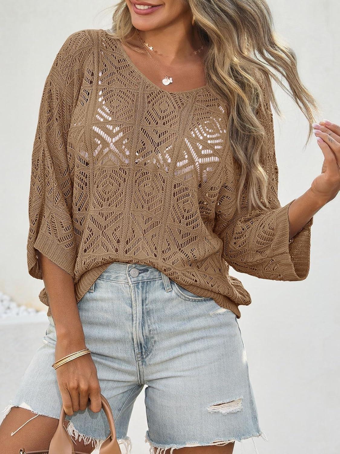 Saodimallsu Womens Crochet Cover Up Top Summer 3/4 Sleeve Off Shoulder Sweater Shirts Mesh Boho Beach Swimsuit Coverup(Camel)