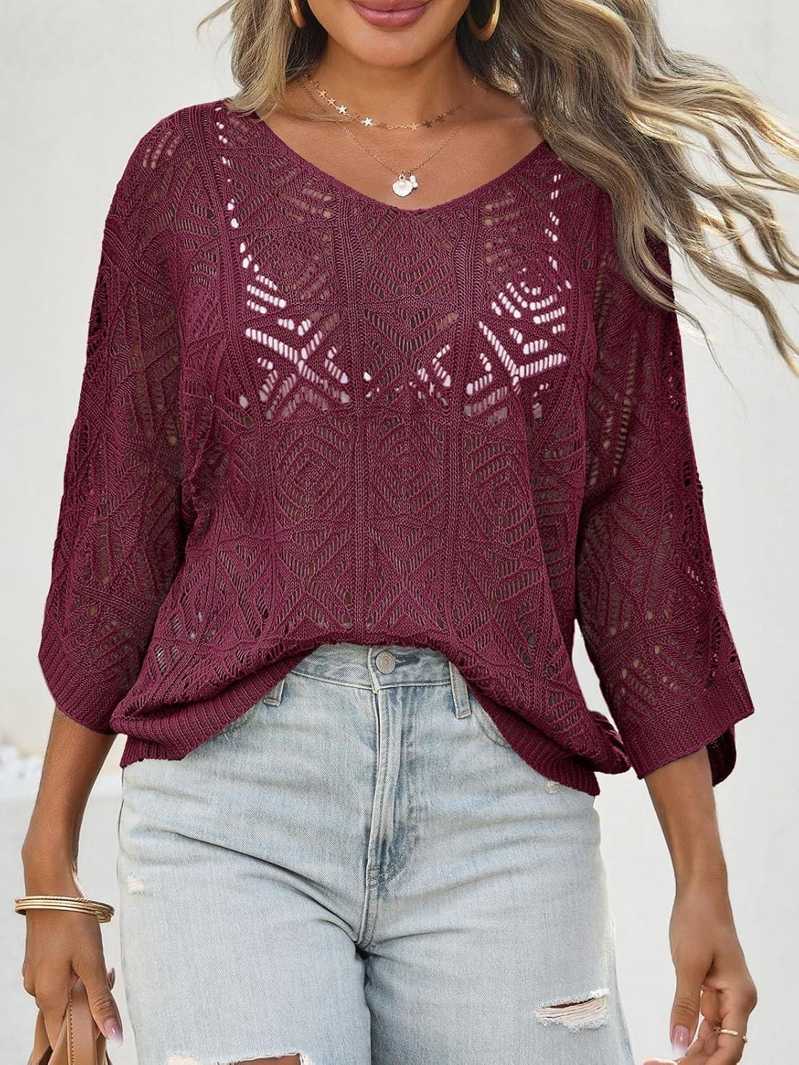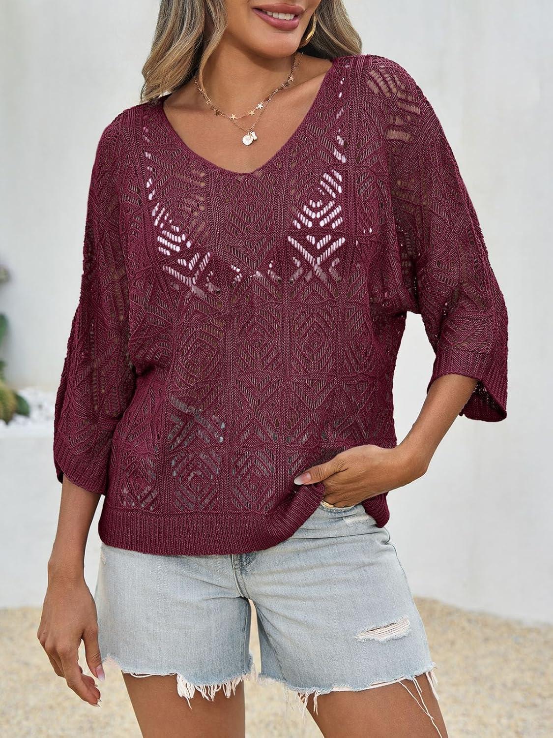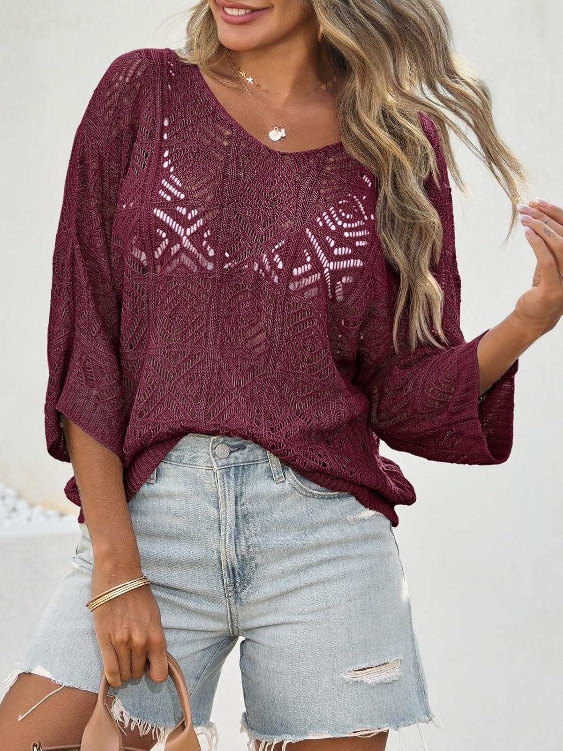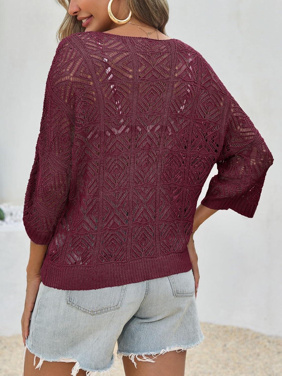Saodimallsu Womens Crochet Cover Up Top Summer 3/4 Sleeve Off Shoulder Sweater Shirts Mesh Boho Beach Swimsuit Coverup(Fuchsia)