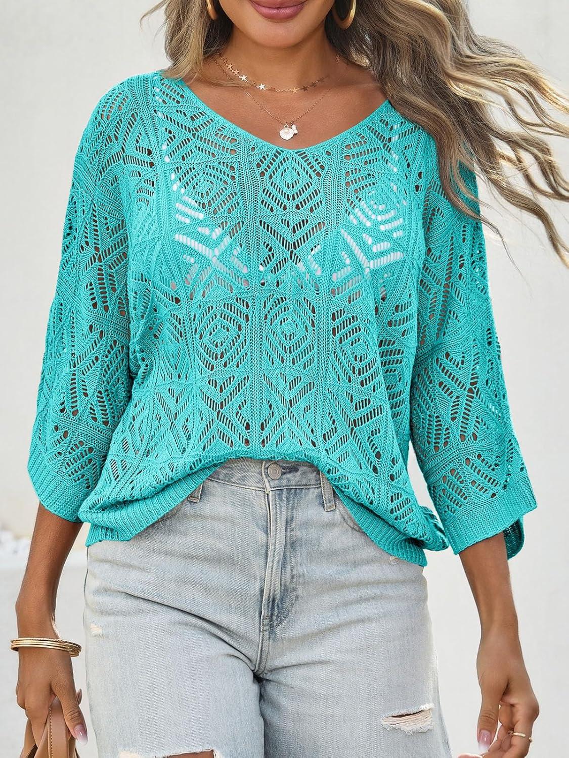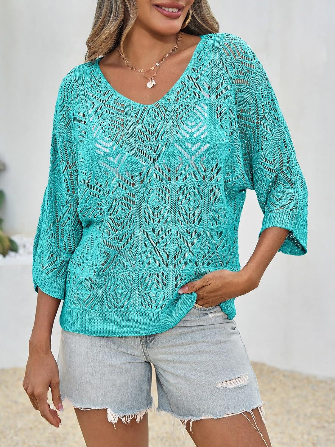 Saodimallsu Womens Crochet Cover Up Top Summer 3/4 Sleeve Off Shoulder Sweater Shirts Mesh Boho Beach Swimsuit Coverup(Green)