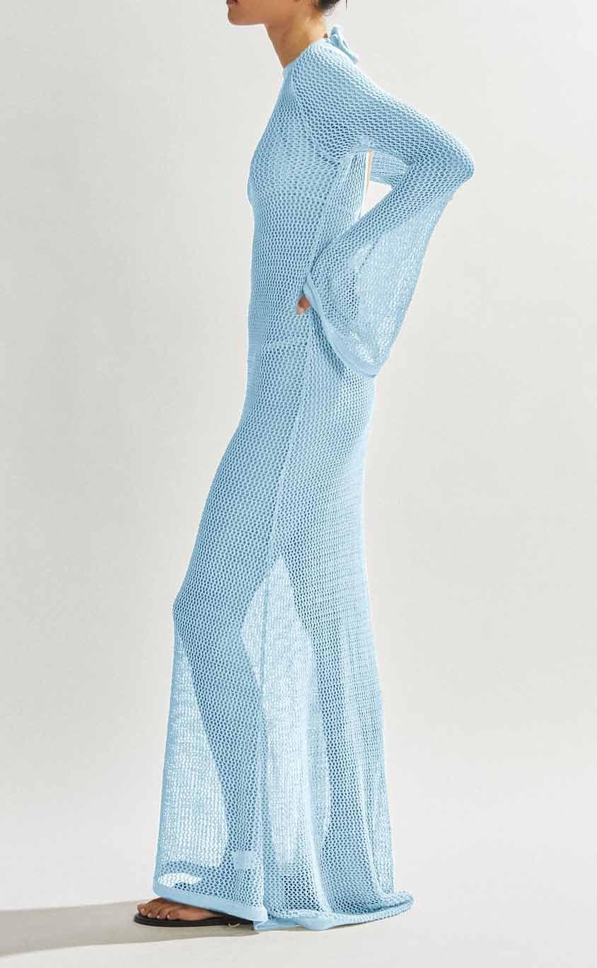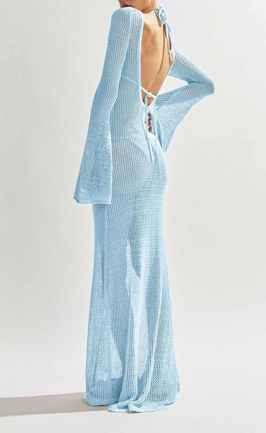Saodimallsu Womens Crochet Cover Ups Long Sleeve Sexy Mesh Backless Knit Swimsuit Coverup Beach Maxi Dress(Blue)