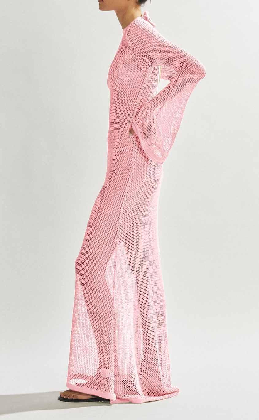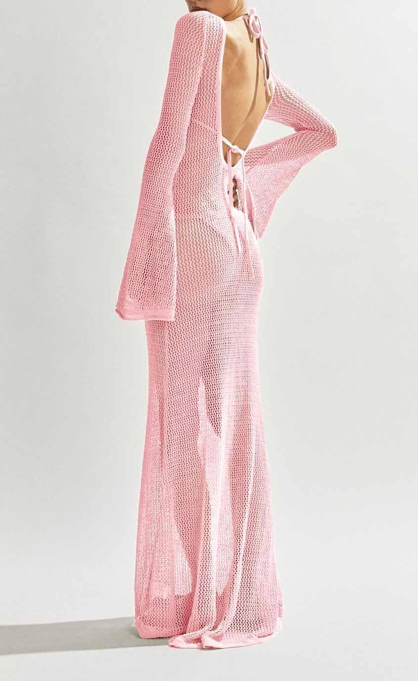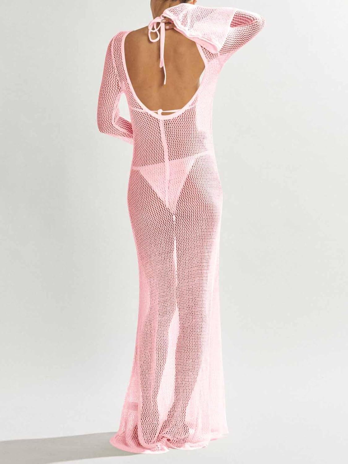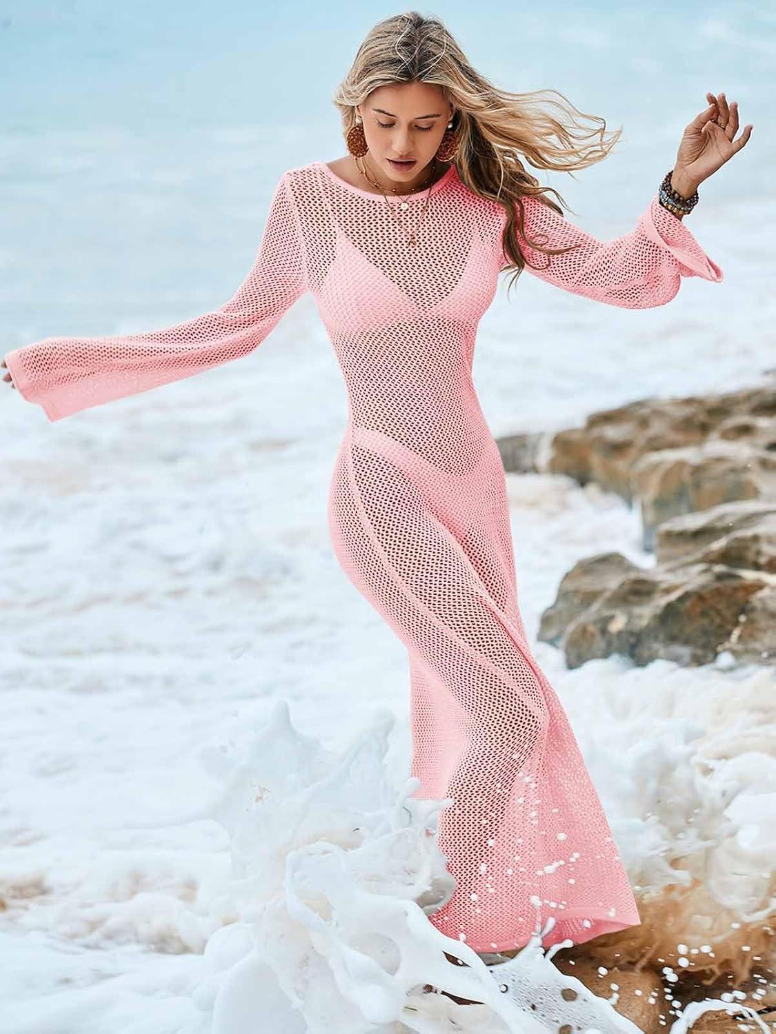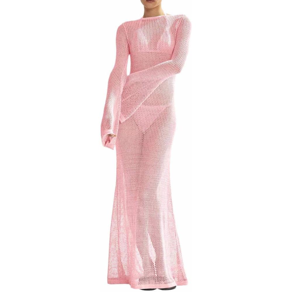 Saodimallsu Womens Crochet Cover Ups Long Sleeve Sexy Mesh Backless Knit Swimsuit Coverup Beach Maxi Dress(Pink)