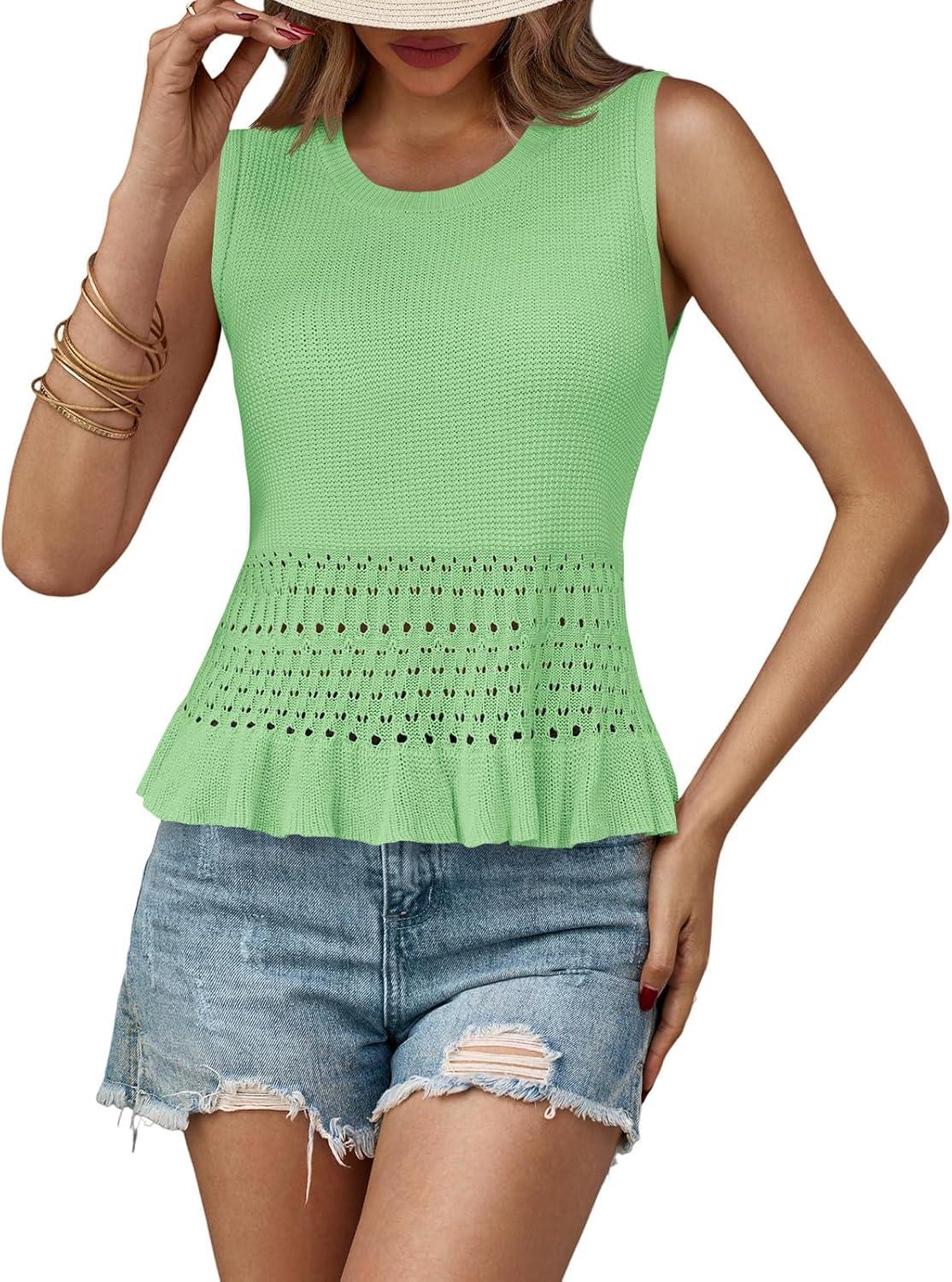 Saodimallsu Womens Crochet Crop Tank Tops Sleeveless Crew Neck Ruffle Summer Boho Knit Sweater Vest(Light Green)