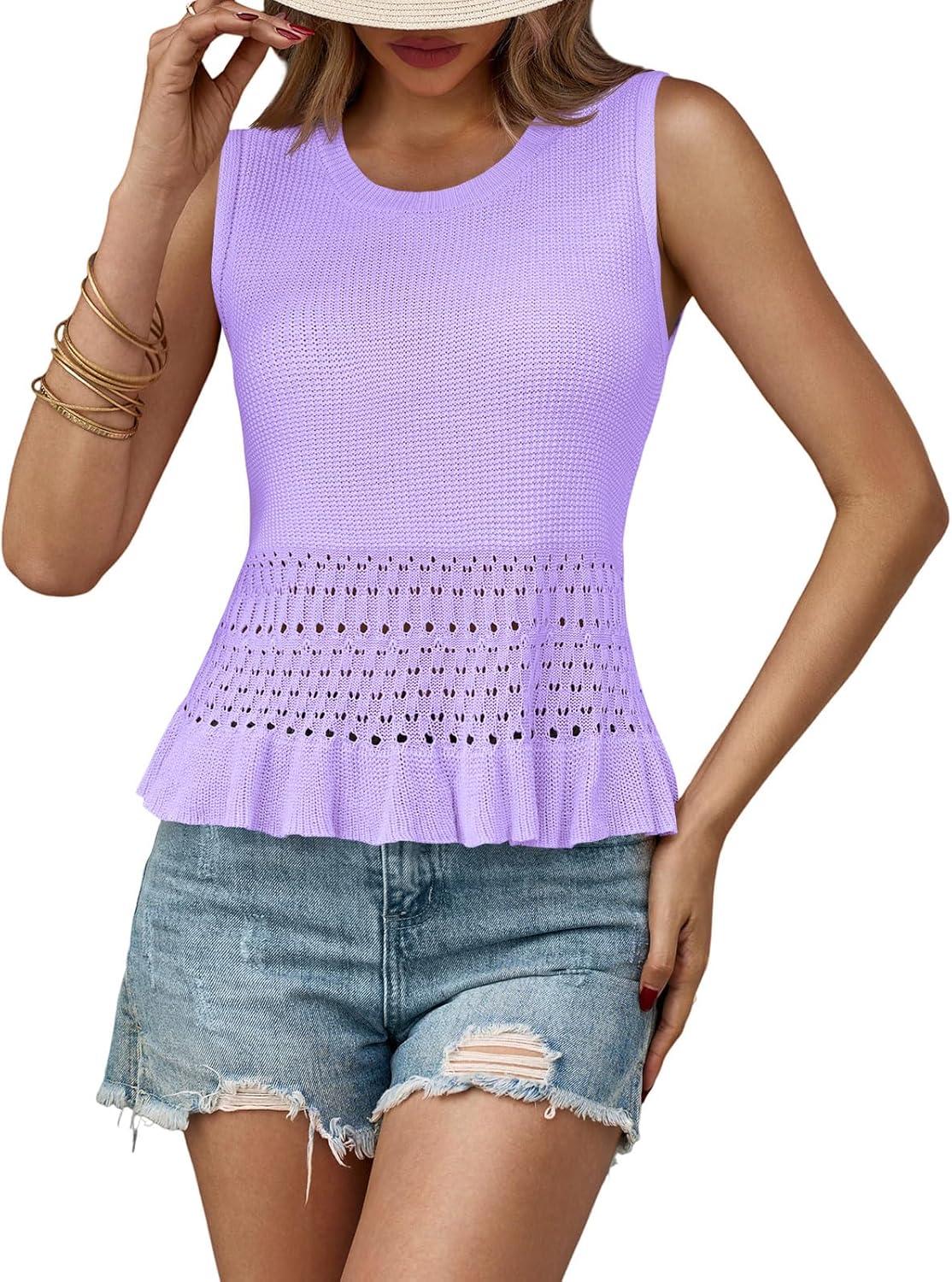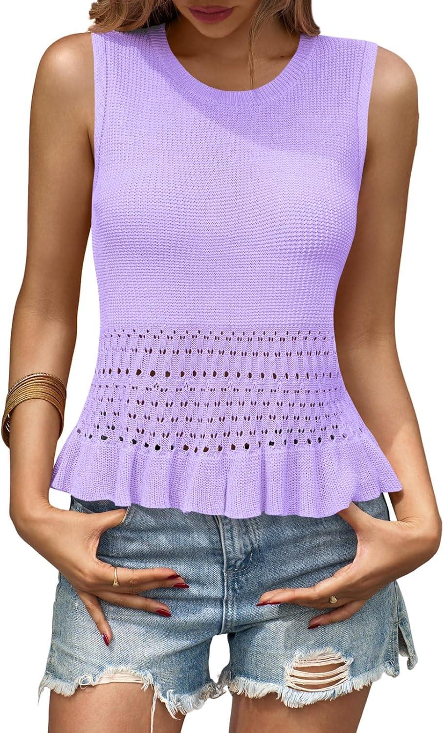 Saodimallsu Womens Crochet Crop Tank Tops Sleeveless Crew Neck Ruffle Summer Boho Knit Sweater Vest(Purple)