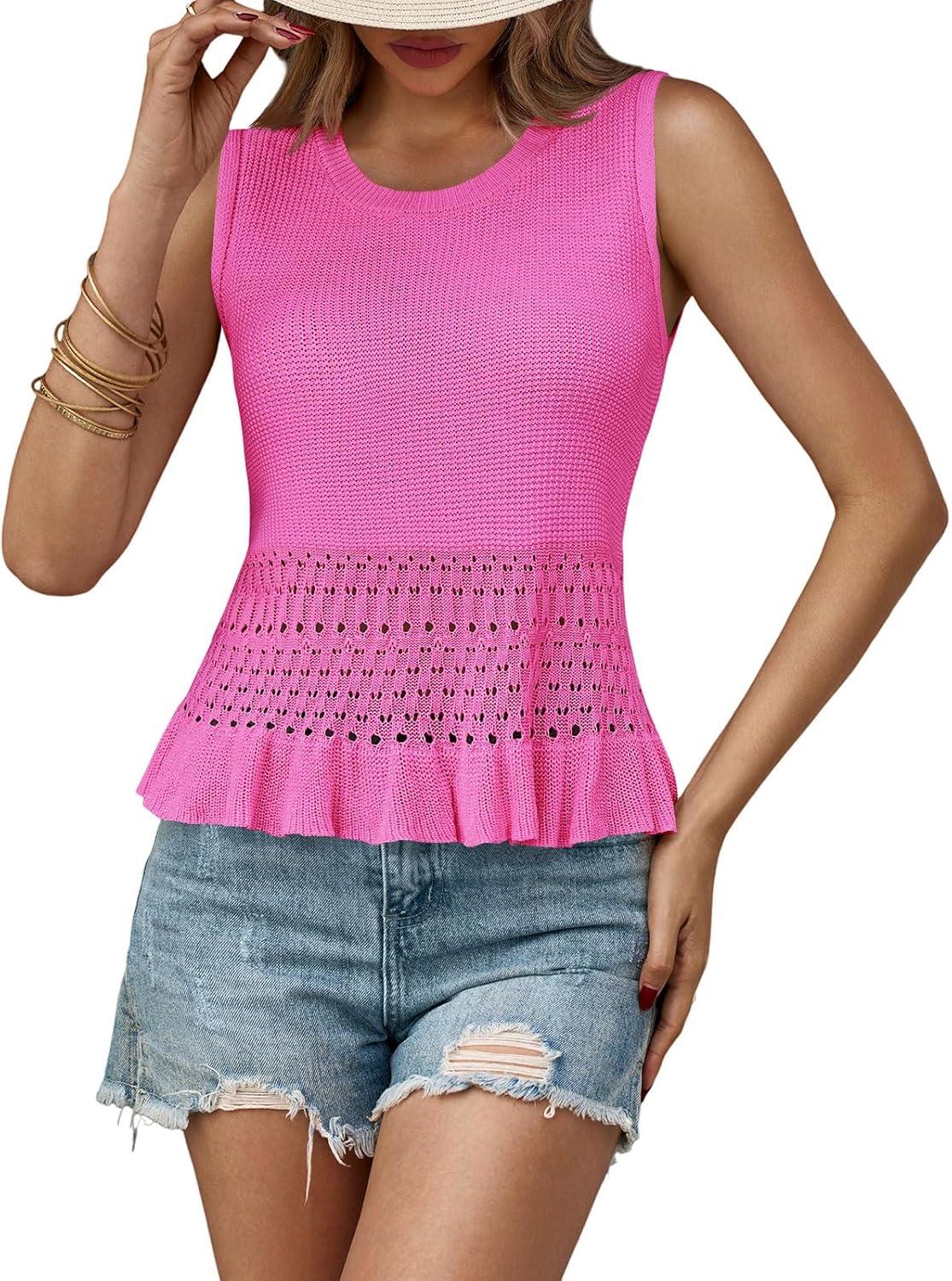 Saodimallsu Womens Crochet Crop Tank Tops Sleeveless Crew Neck Ruffle Summer Boho Knit Sweater Vest(Rose Red)