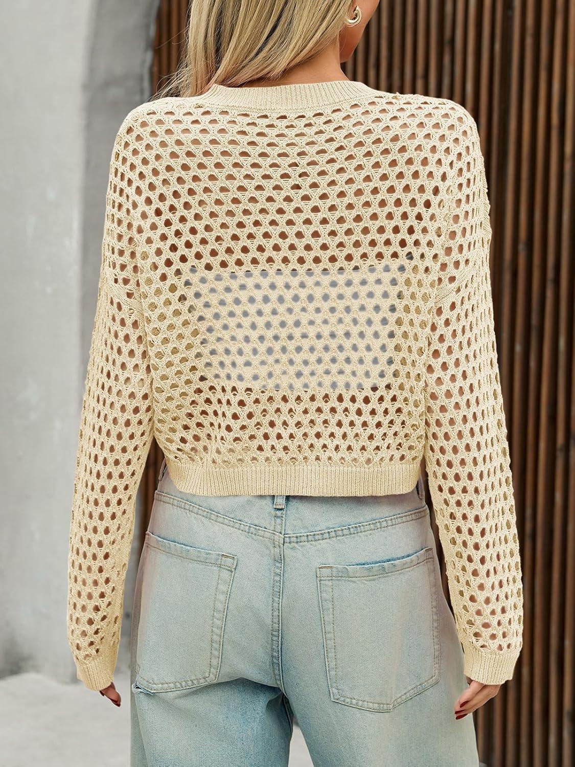 Saodimallsu Womens Crochet Crop Tops Summer Long Sleeve Mesh Knit Beach Cover Up Hollow Out Crewneck Pullover Sweaters(Beige)