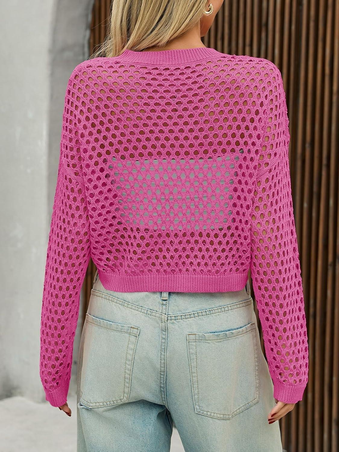Saodimallsu Womens Crochet Crop Tops Summer Long Sleeve Mesh Knit Beach Cover Up Hollow Out Crewneck Pullover Sweaters(Pink)