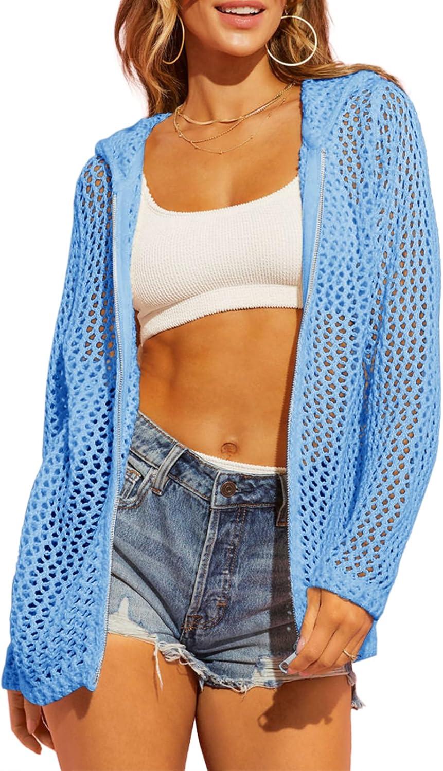 Saodimallsu Womens Crochet Lightweight Cardigans Zip Up Hooded Long Sleeve Knit Sweaters Mesh Beach Swim Cover Up(Blue)