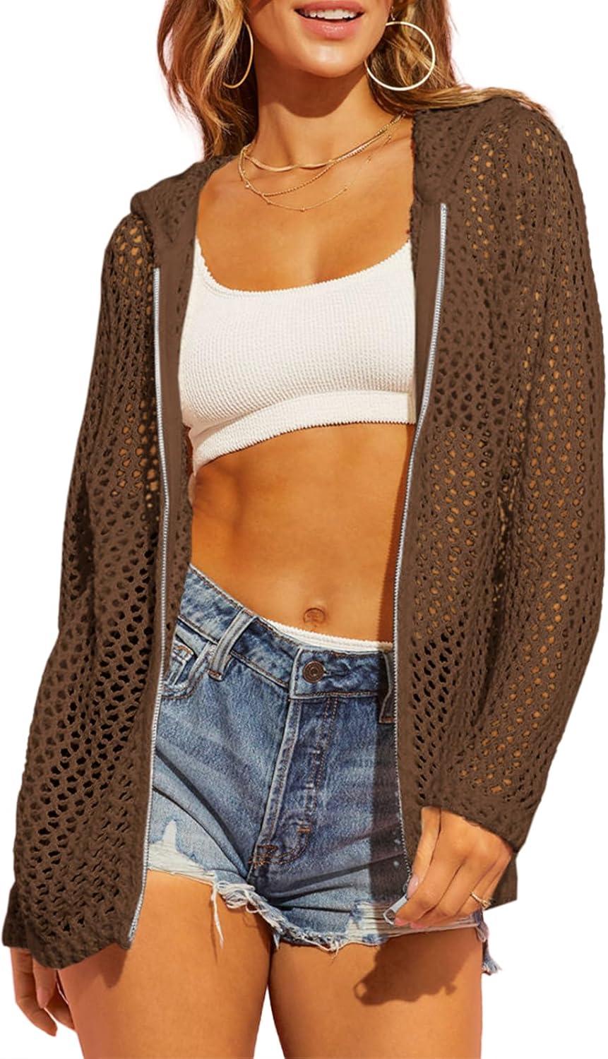 Saodimallsu Womens Crochet Lightweight Cardigans Zip Up Hooded Long Sleeve Knit Sweaters Mesh Beach Swim Cover Up(Coffee)