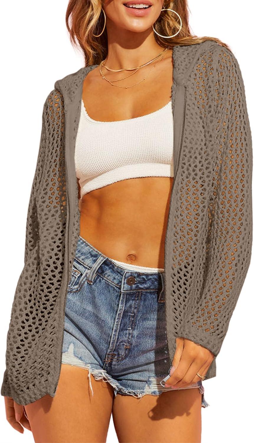 Saodimallsu Womens Crochet Lightweight Cardigans Zip Up Hooded Long Sleeve Knit Sweaters Mesh Beach Swim Cover Up(Khaki)