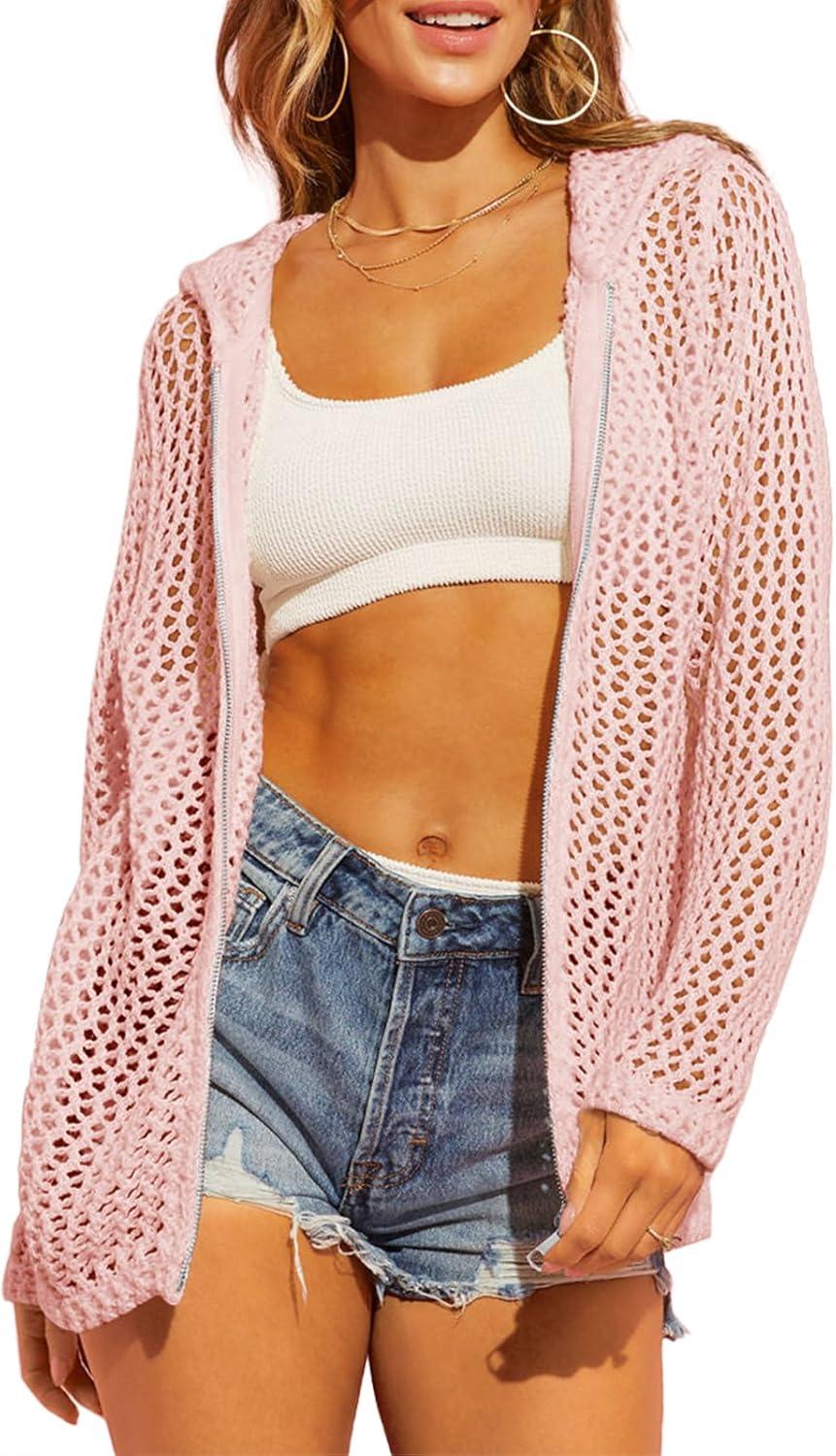 Saodimallsu Womens Crochet Lightweight Cardigans Zip Up Hooded Long Sleeve Knit Sweaters Mesh Beach Swim Cover Up(Light Pink)