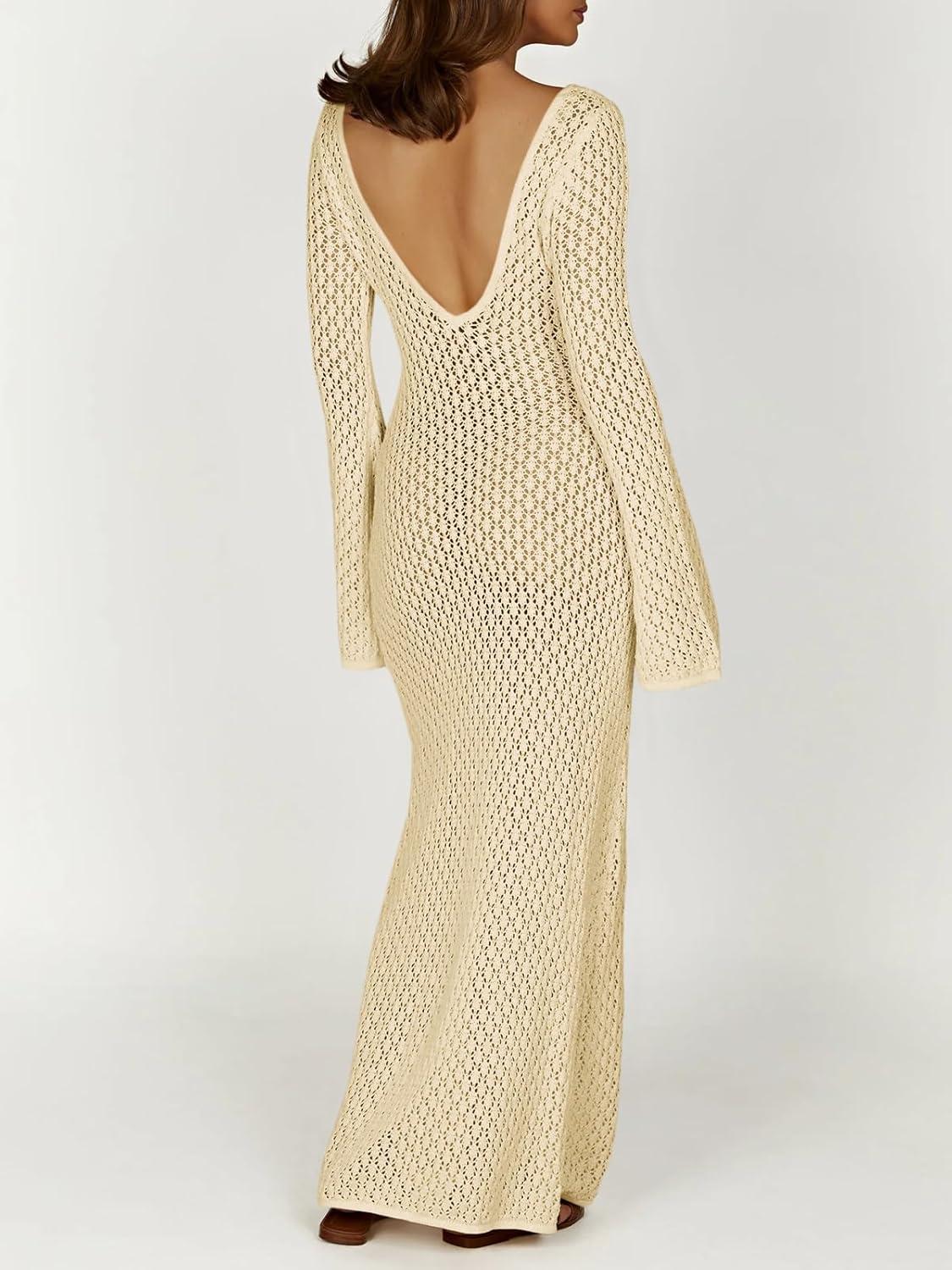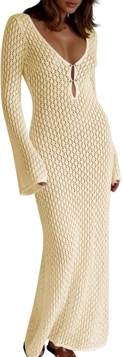 Saodimallsu Womens Crochet Maxi Cover Up Dress Beach Swim Vacation Coverups Long Sleeve Sexy Bodycon Summer Knit Dresses(Off-white)