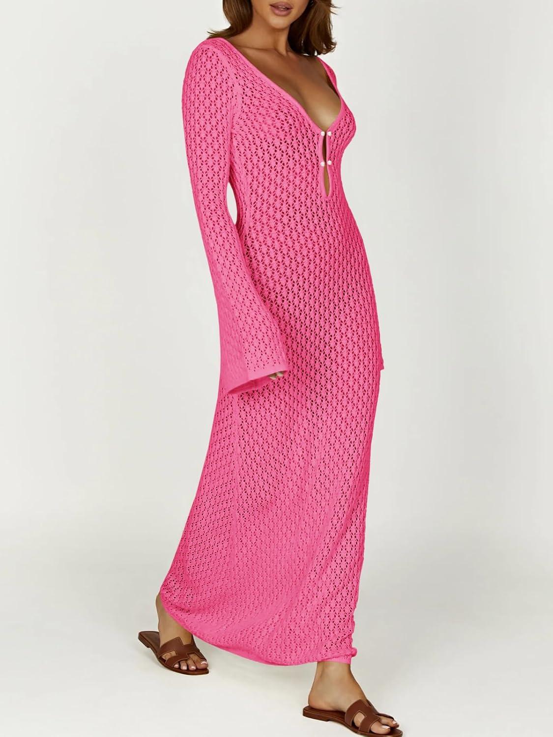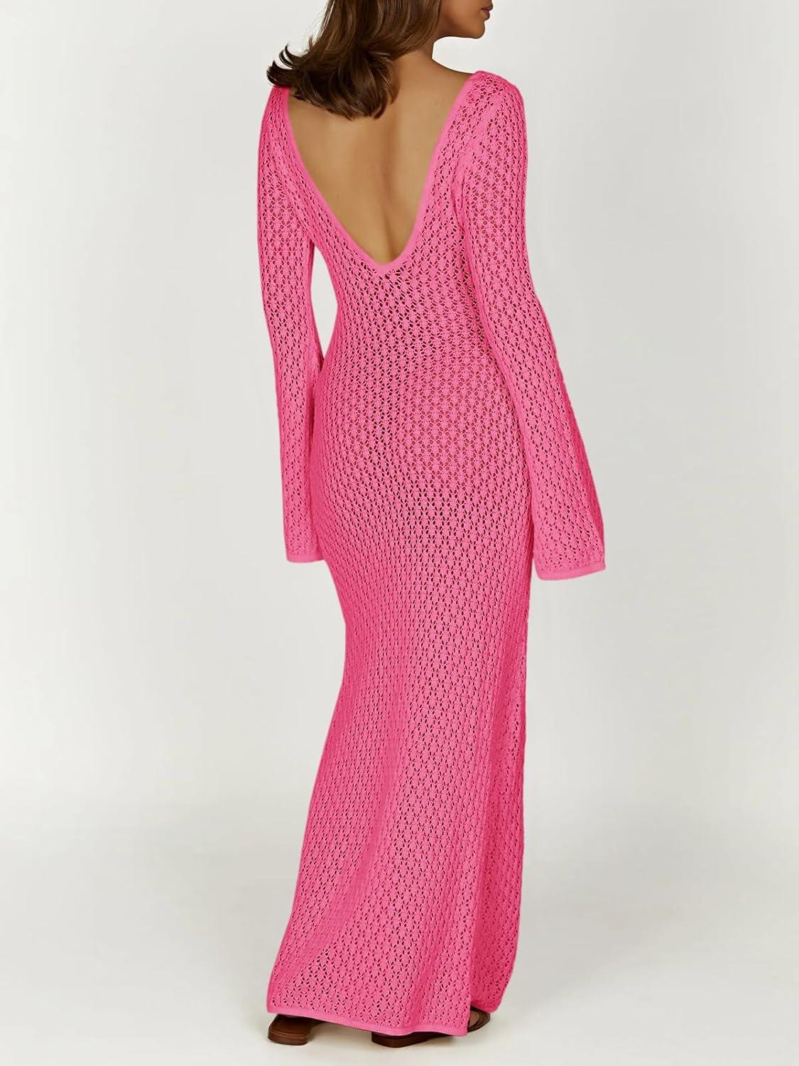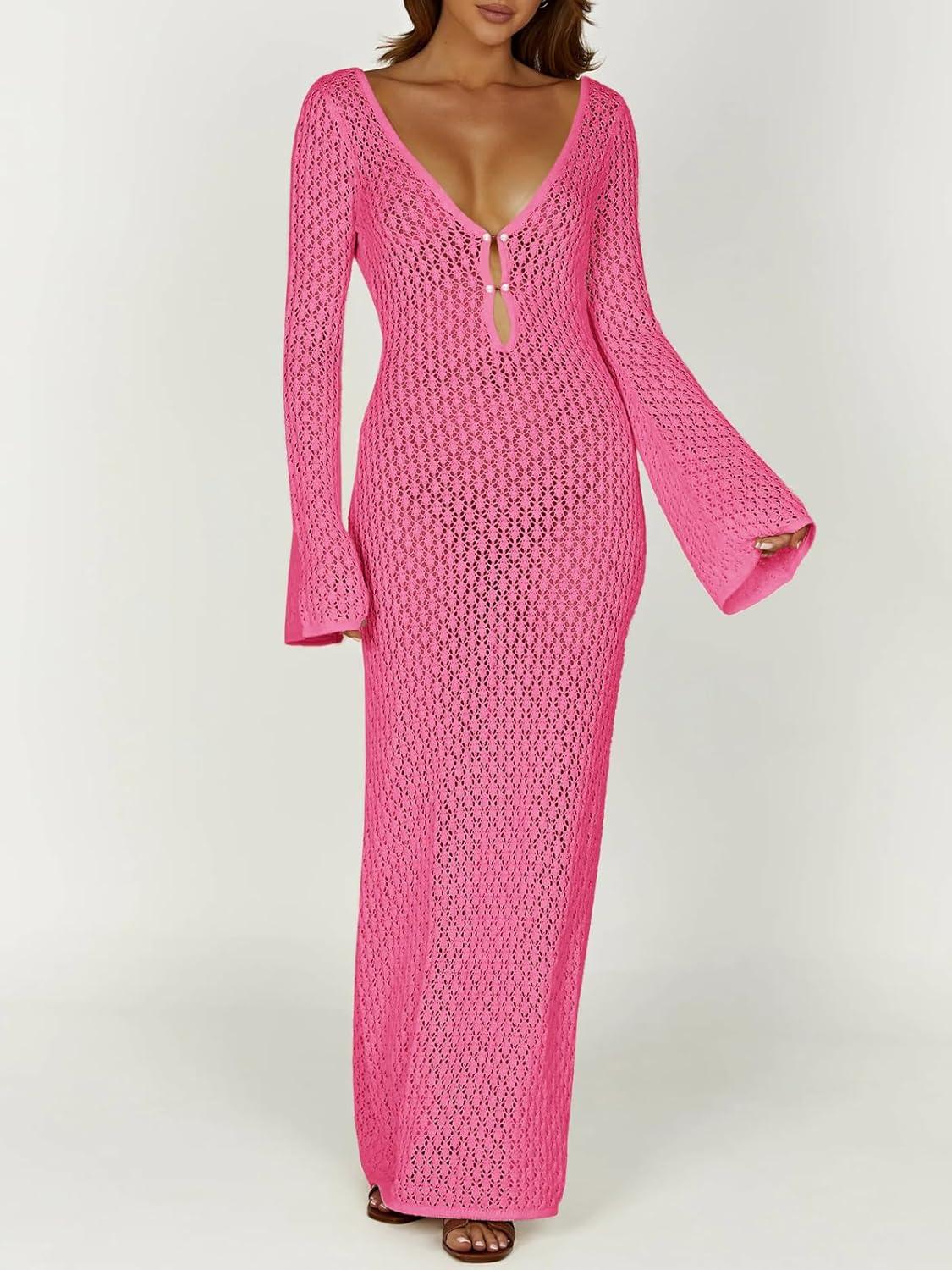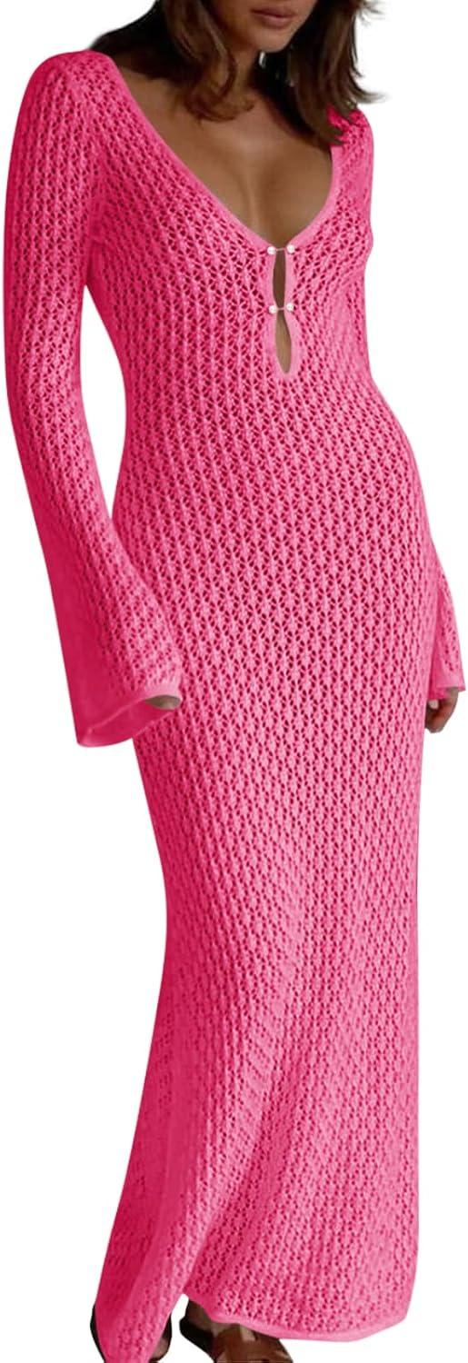Saodimallsu Womens Crochet Maxi Cover Up Dress Beach Swim Vacation Coverups Long Sleeve Sexy Bodycon Summer Knit Dresses(Rose Red)