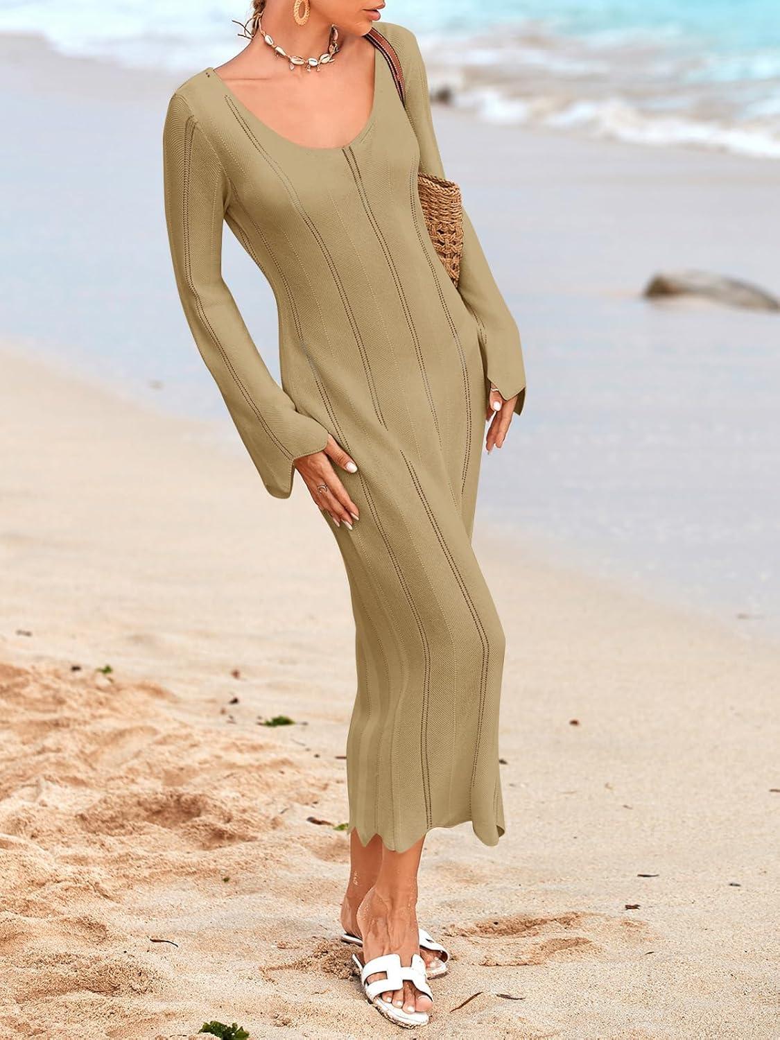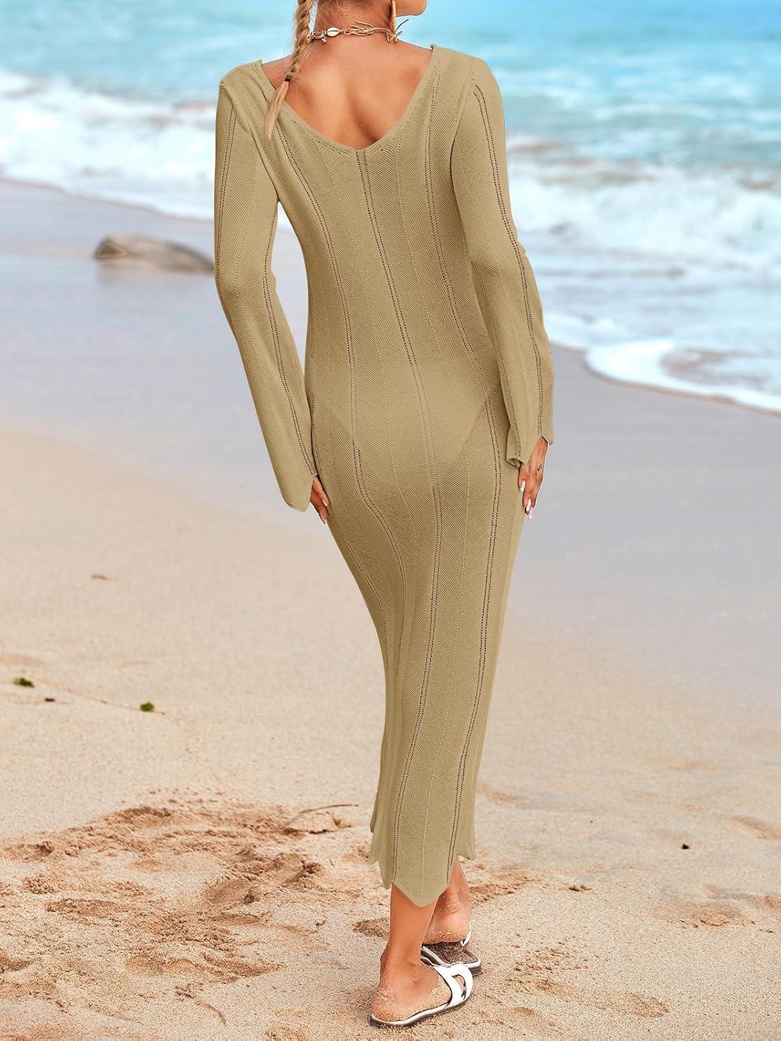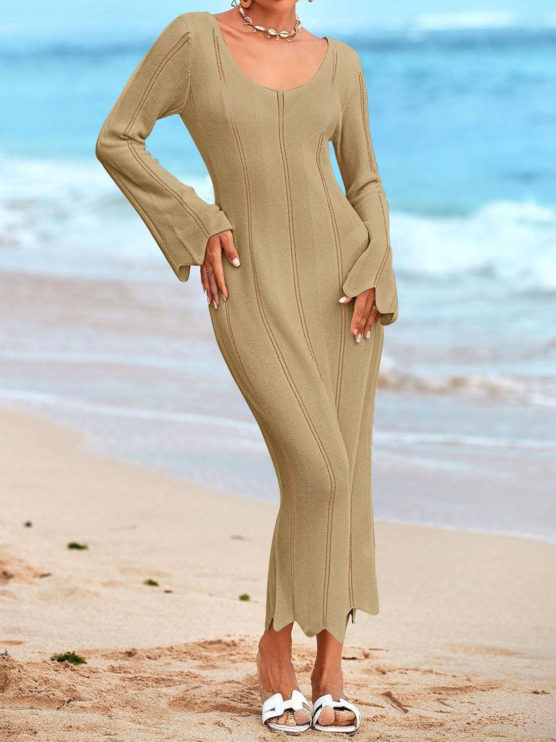 Saodimallsu Womens Crochet Maxi Dress Bell Long Sleeve Sexy V Neck Bodycon Backless Knit Dresses Beach Swim Cover Up(Khaki)