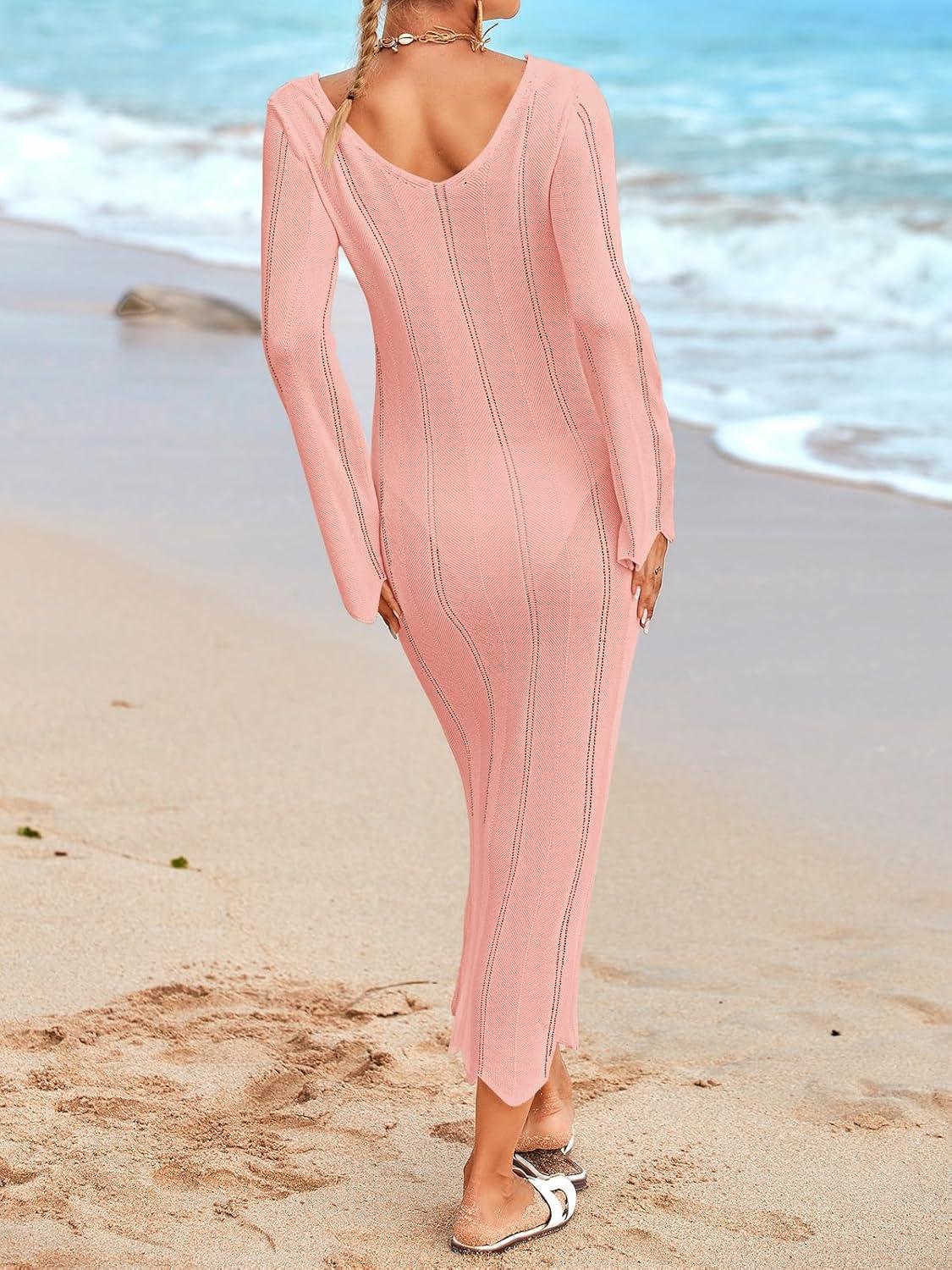 Saodimallsu Womens Crochet Maxi Dress Bell Long Sleeve Sexy V Neck Bodycon Backless Knit Dresses Beach Swim Cover Up(Light Pink)