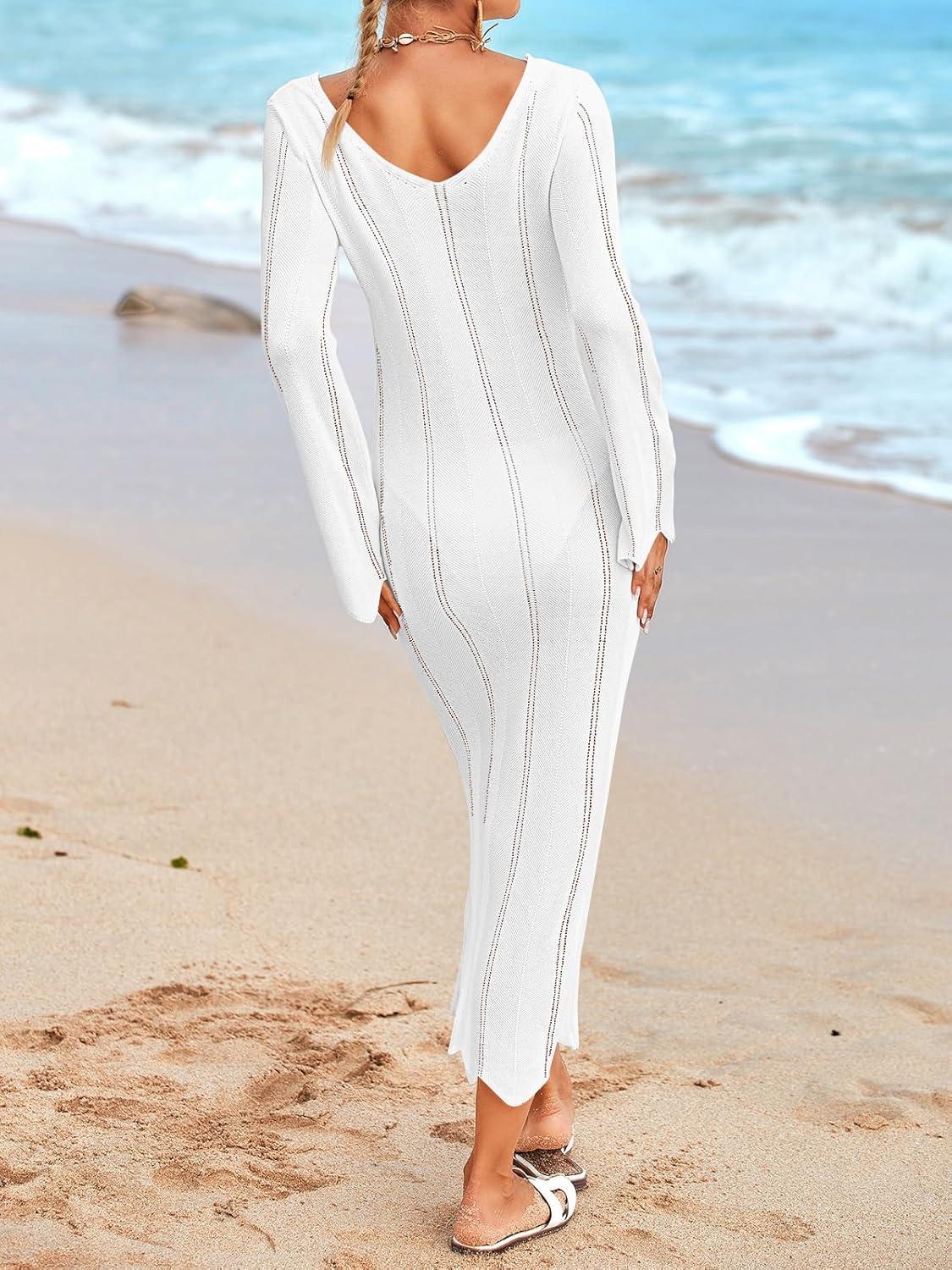 Saodimallsu Womens Crochet Maxi Dress Bell Long Sleeve Sexy V Neck Bodycon Backless Knit Dresses Beach Swim Cover Up(White)