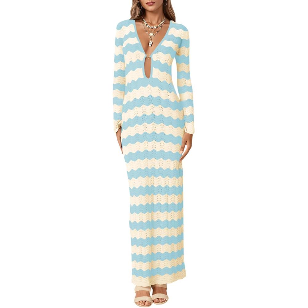 Saodimallsu Womens Crochet Summer Maxi Dress Striped Sexy Cut Out V Neck Long Sleeve Knit Cover Up Beach Dresses(Light Blue)