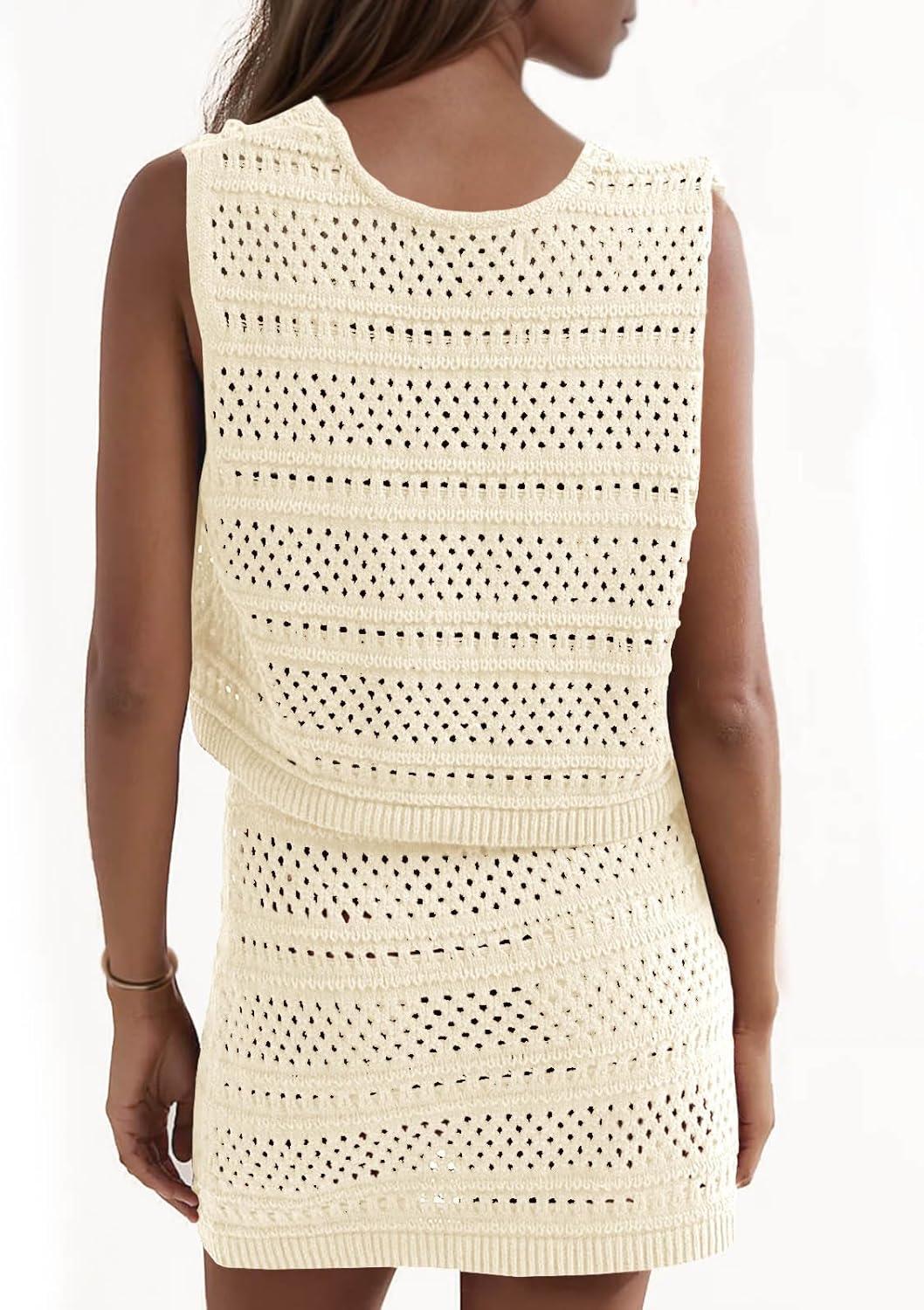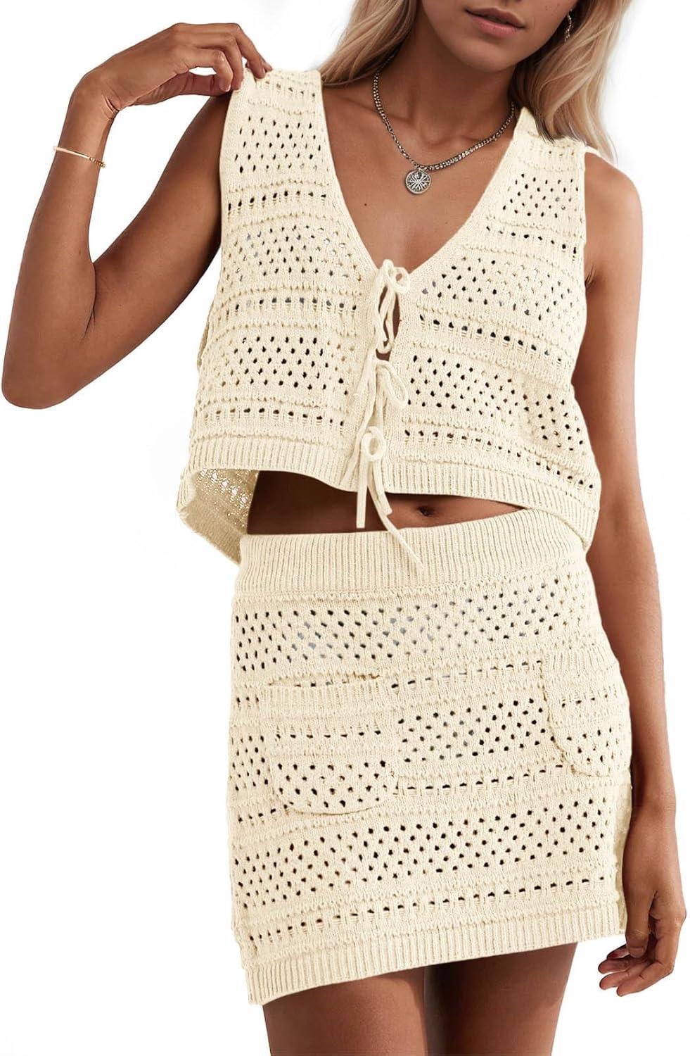 Saodimallsu Womens Crochet Swim Cover Up 2 Piece V Neck Sleeveless Front Tie Crop Tops Beach Mini Skirt Coverup Set(Beige)