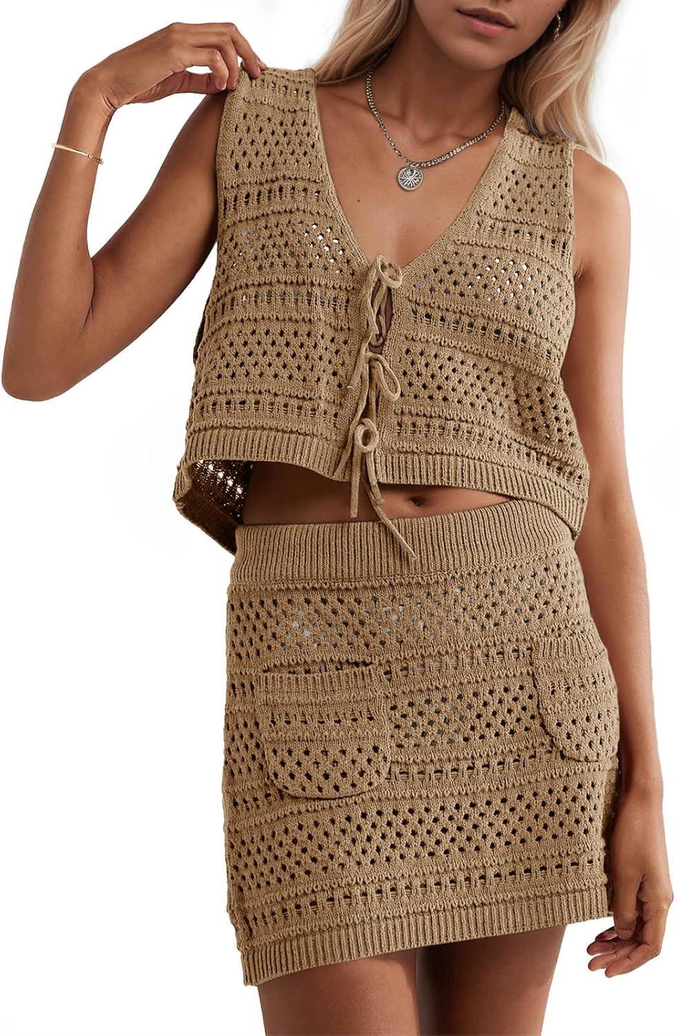 Saodimallsu Womens Crochet Swim Cover Up 2 Piece V Neck Sleeveless Front Tie Crop Tops Beach Mini Skirt Coverup Set(Khaki)