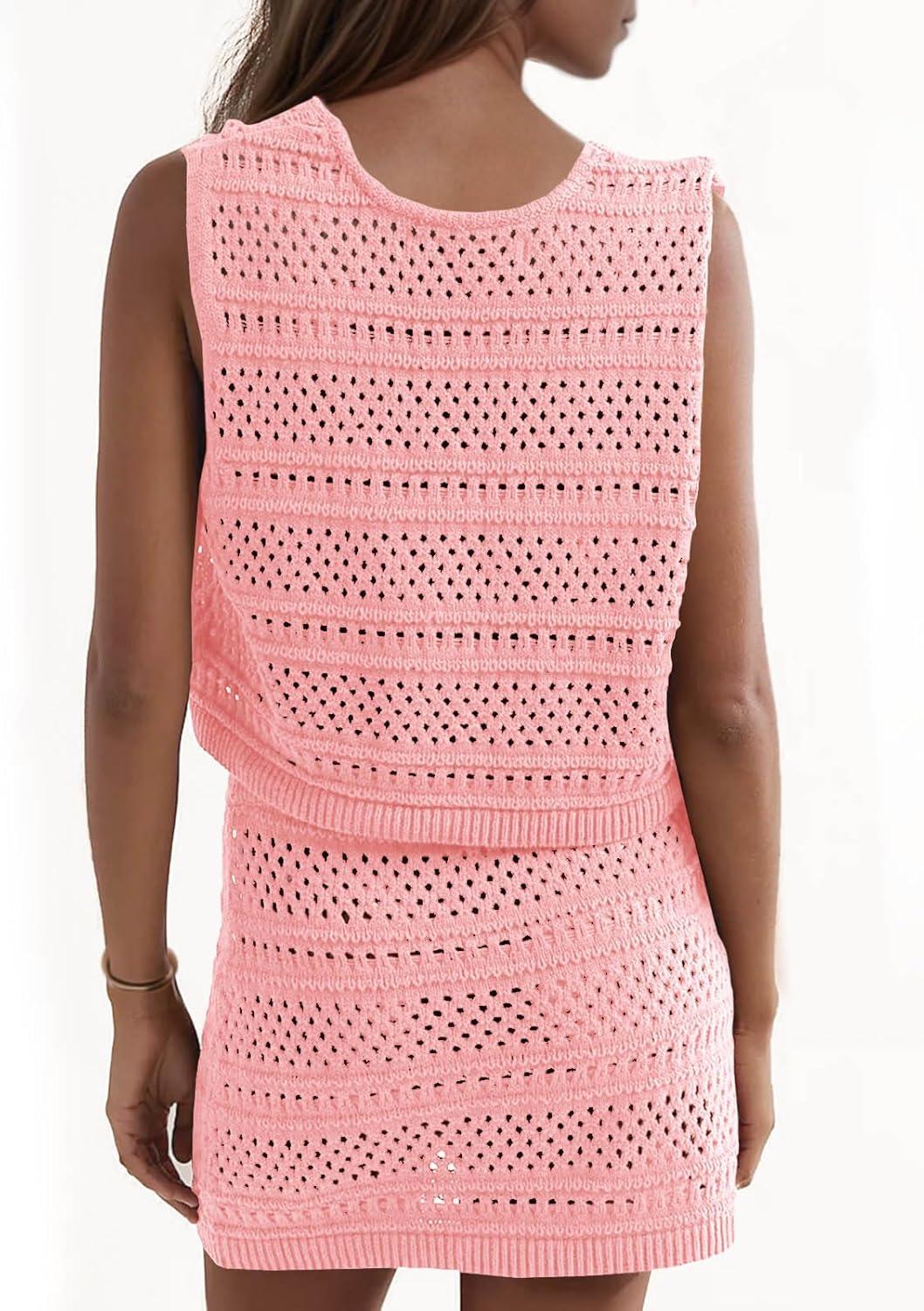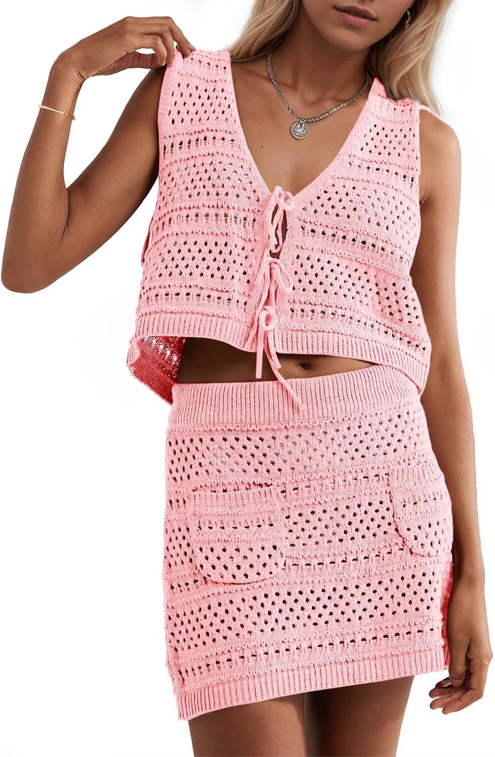 Saodimallsu Womens Crochet Swim Cover Up 2 Piece V Neck Sleeveless Front Tie Crop Tops Beach Mini Skirt Coverup Set(Pink)
