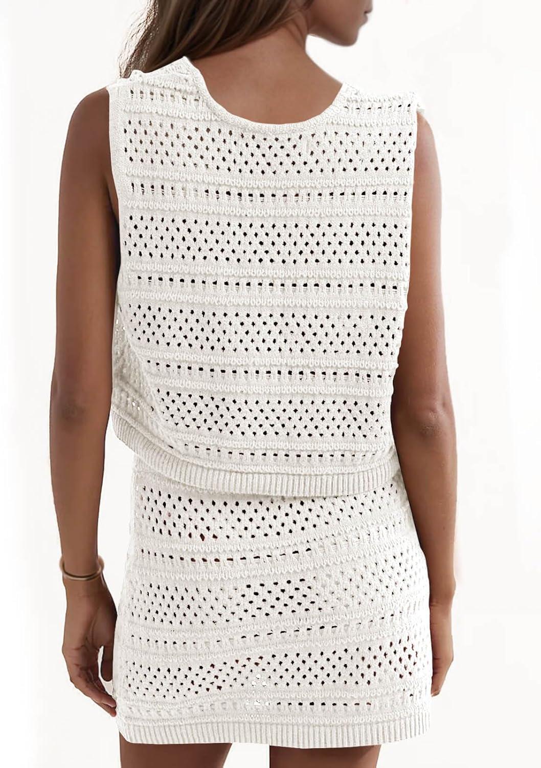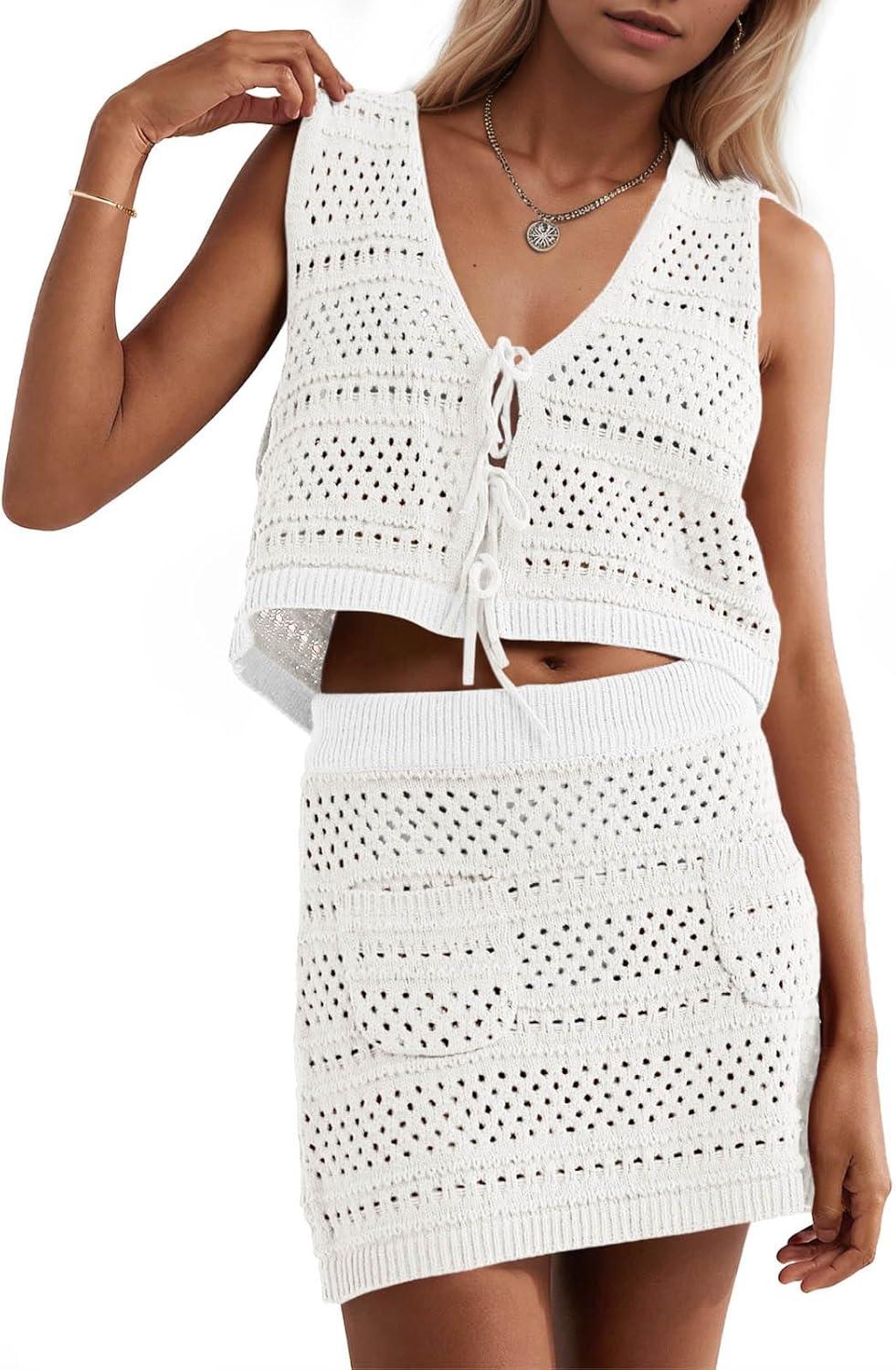 Saodimallsu Womens Crochet Swim Cover Up 2 Piece V Neck Sleeveless Front Tie Crop Tops Beach Mini Skirt Coverup Set(White)