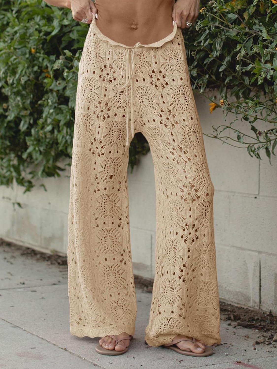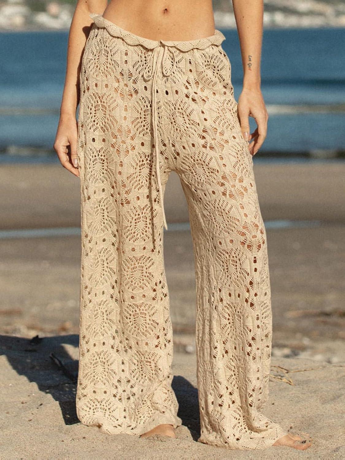 Saodimallsu Womens Crochet Swimsuit Coverup Pants High Waisted Drawstring Sexy Sheer Mesh Knit Wide Leg Beach Pants(Light Khaki)