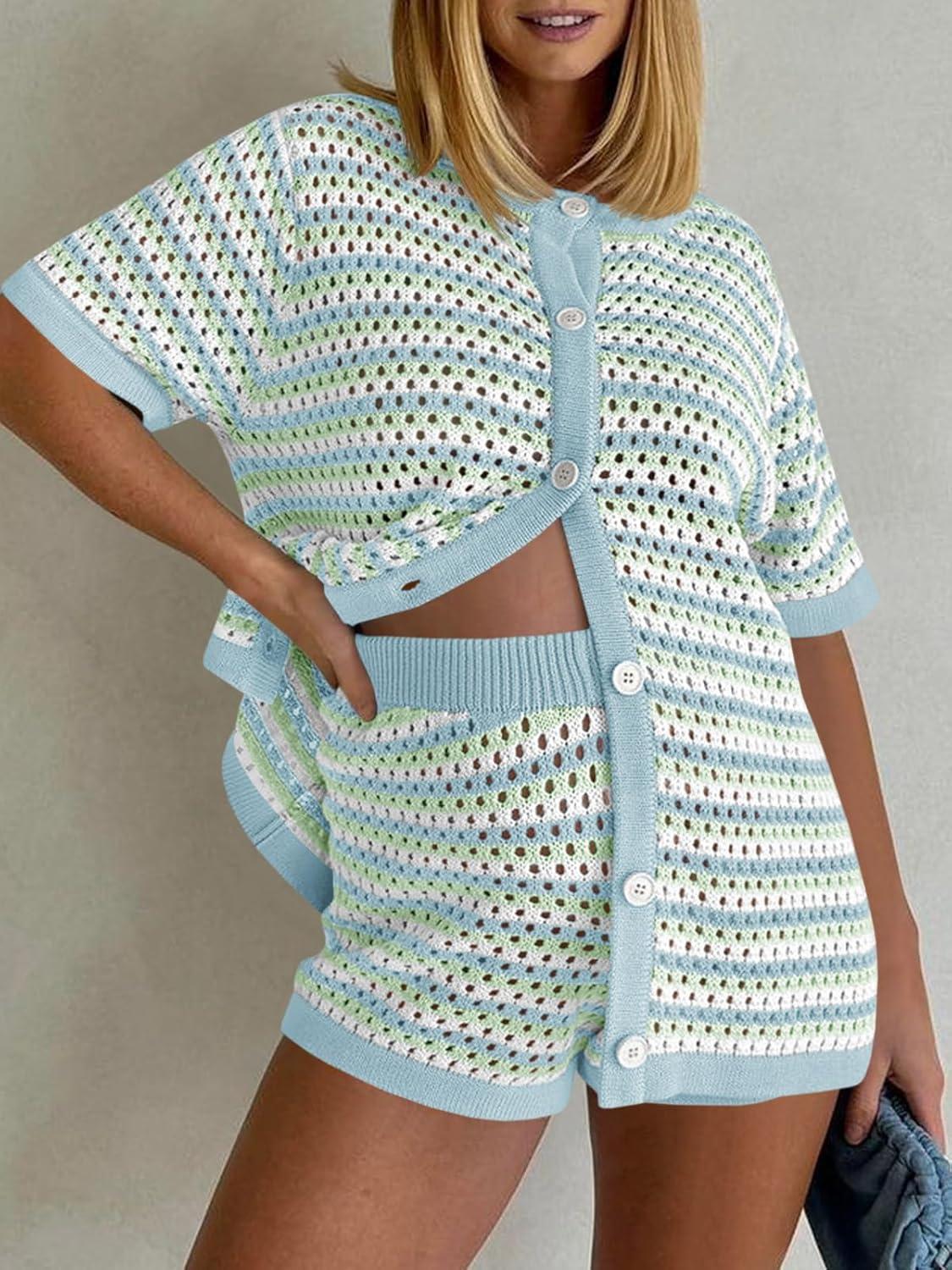 Saodimallsu Womens Crochet Swimsuit Coverup Summer Beach Sets Striped Knit Short Sleeve Button Shirts 2 Piece Short Set(Blue)
