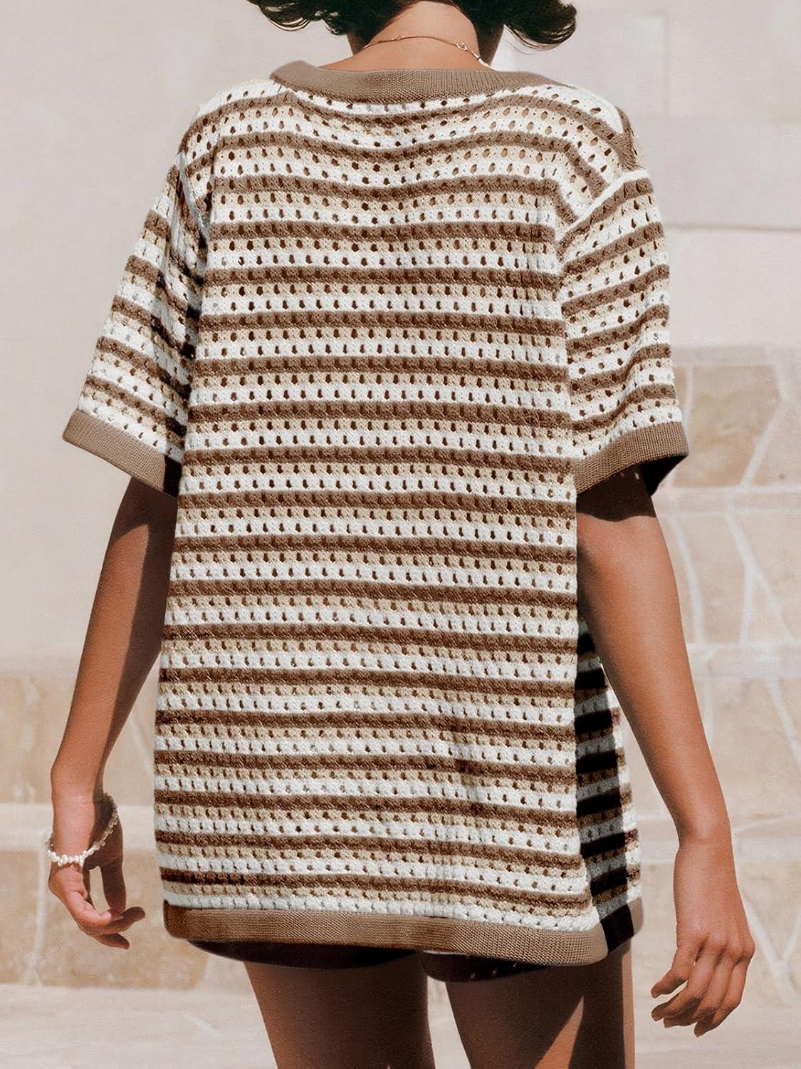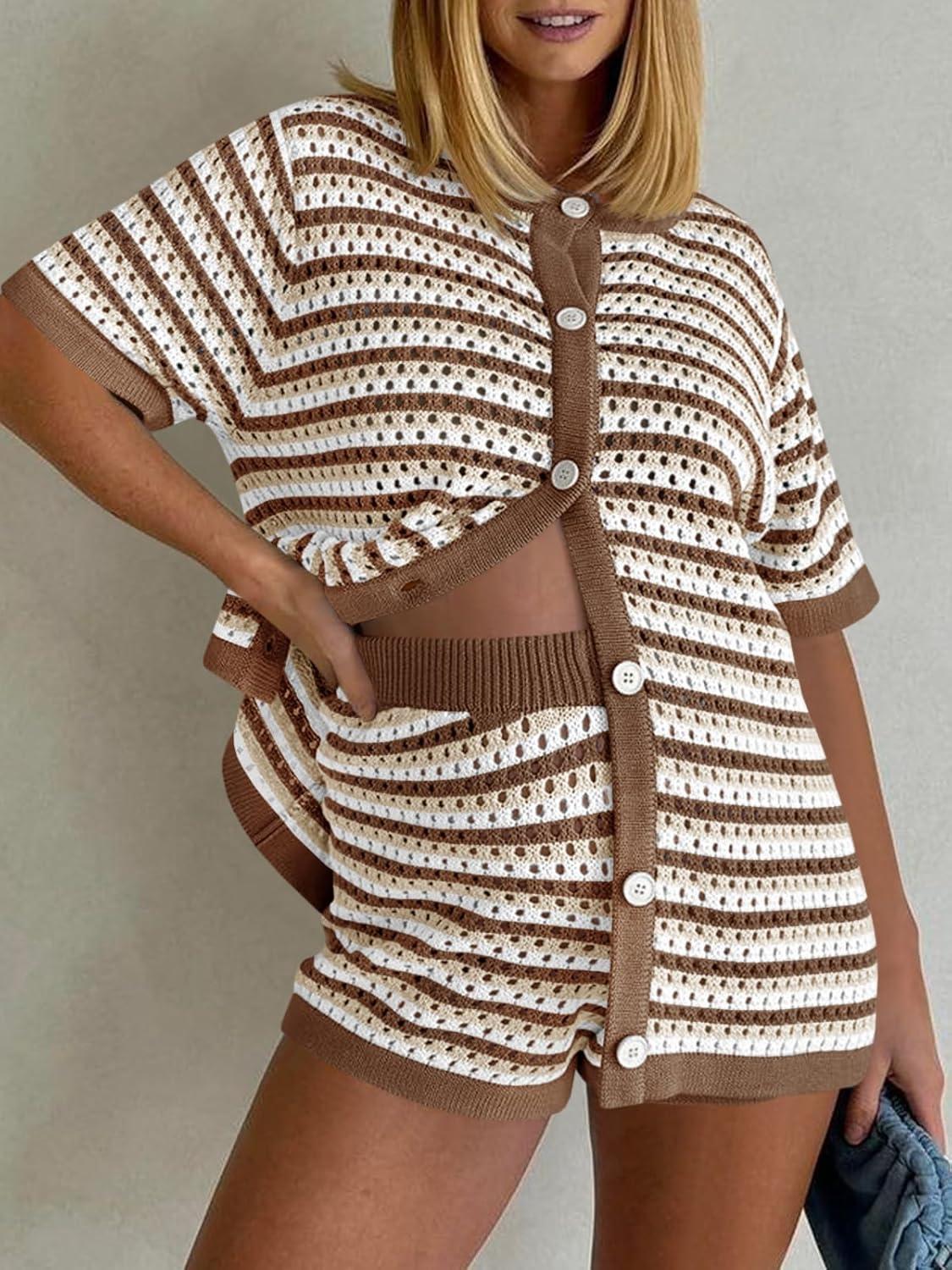 Saodimallsu Womens Crochet Swimsuit Coverup Summer Beach Sets Striped Knit Short Sleeve Button Shirts 2 Piece Short Set(Brown)