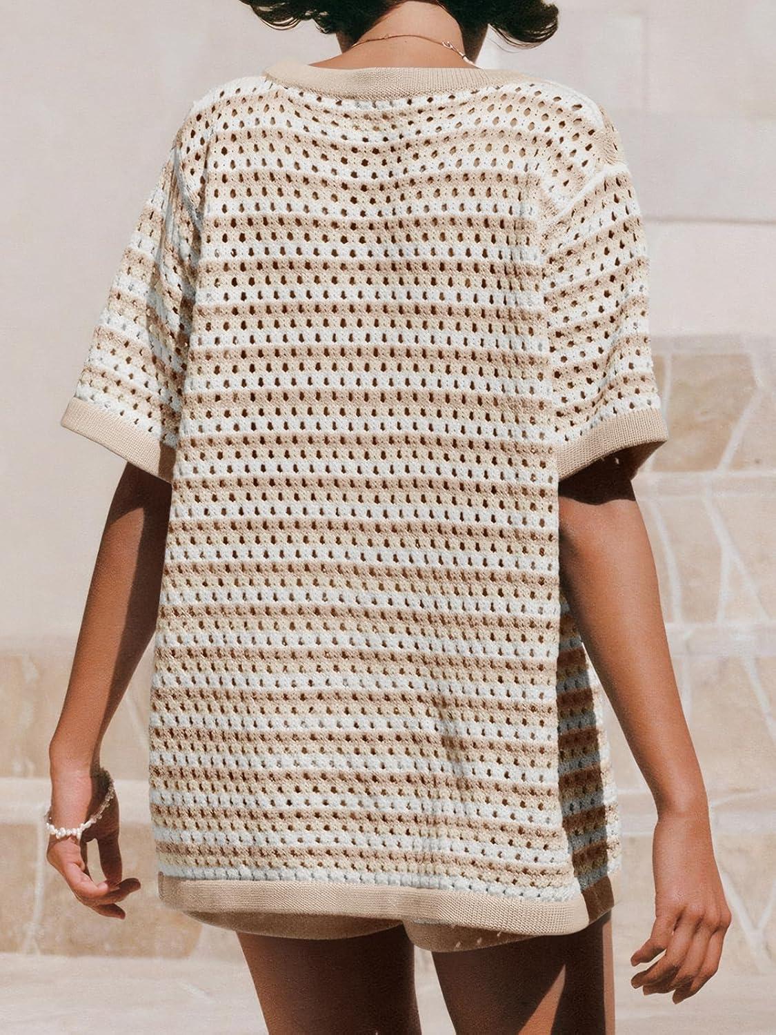 Saodimallsu Womens Crochet Swimsuit Coverup Summer Beach Sets Striped Knit Short Sleeve Button Shirts 2 Piece Short Set(Khaki)