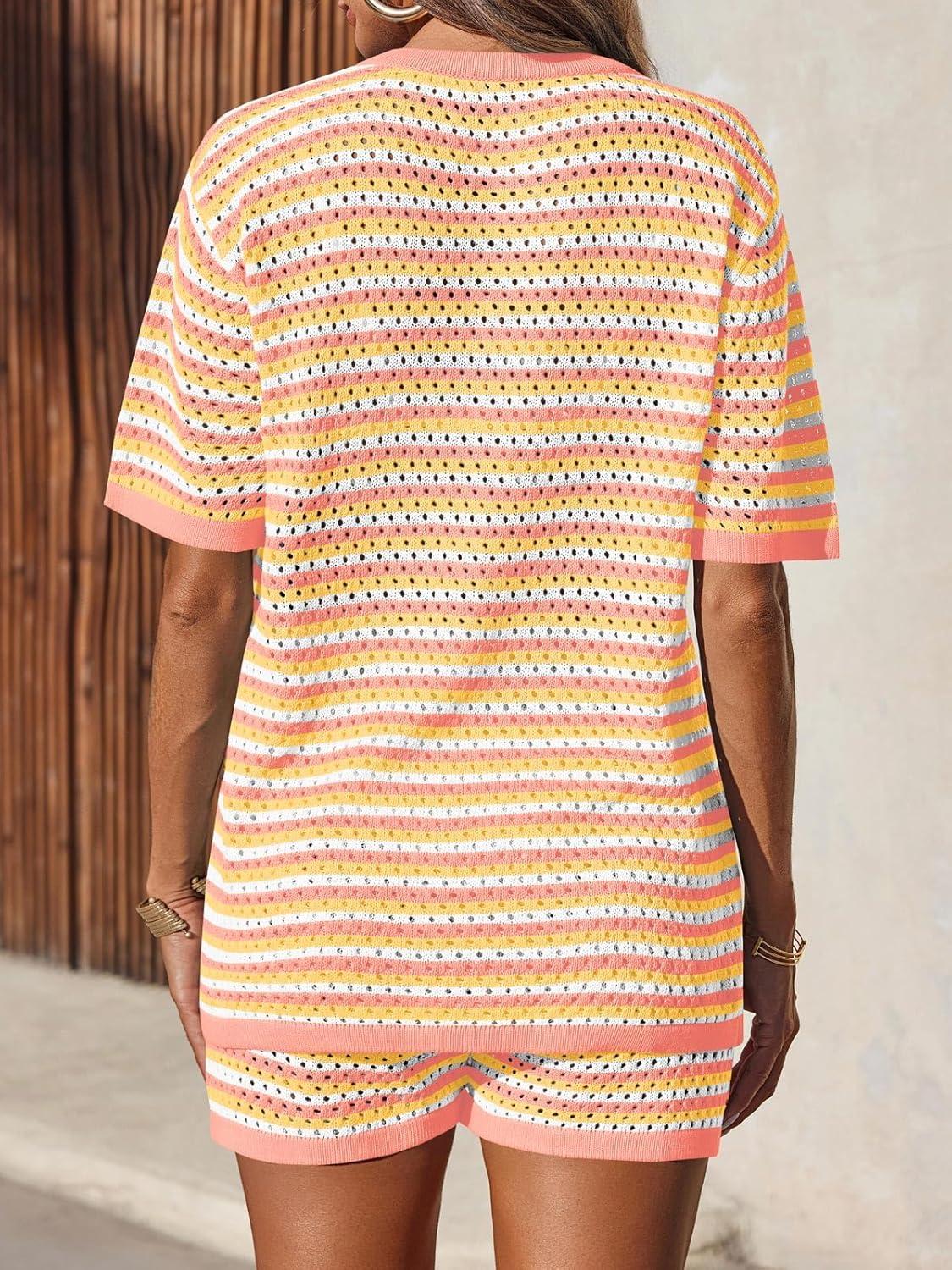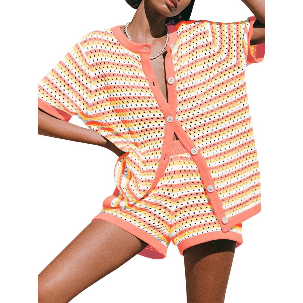 Saodimallsu Womens Crochet Swimsuit Coverup Summer Beach Sets Striped Knit Short Sleeve Button Shirts 2 Piece Short Set(Orange)