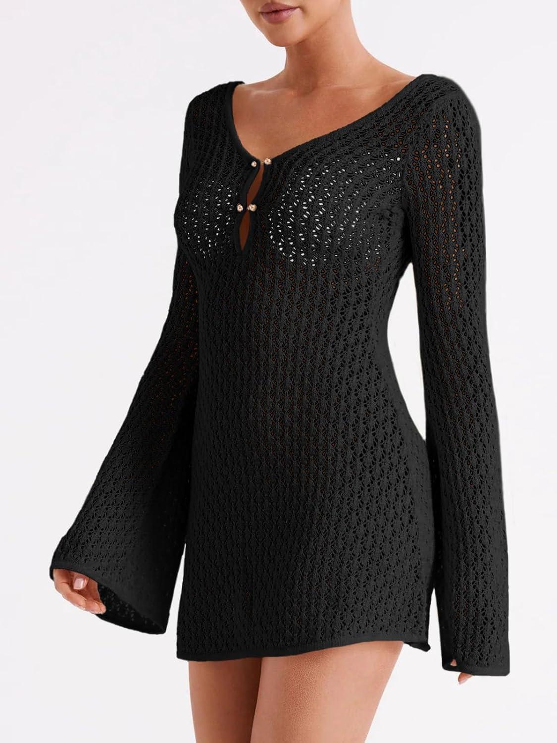 Saodimallsu Womens Crochet Swimsuit Coverup Summer Sexy V Neck Long Bell Sleeve Mesh Knit Bikini Cover Ups Beach Dresses(Black)